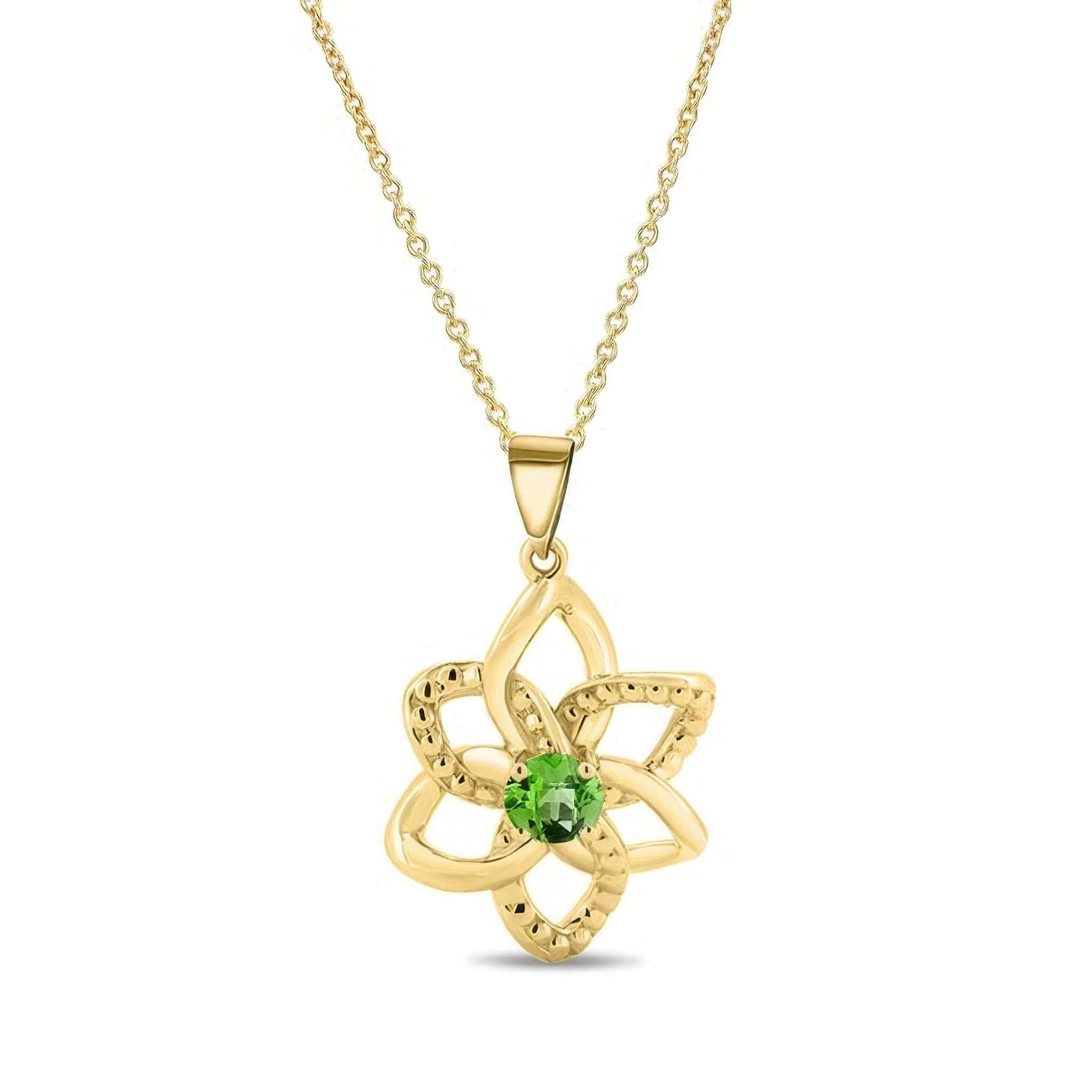 A beautiful peridot flower necklace featuring intertwined leaf shapes and a half carat peridot center.