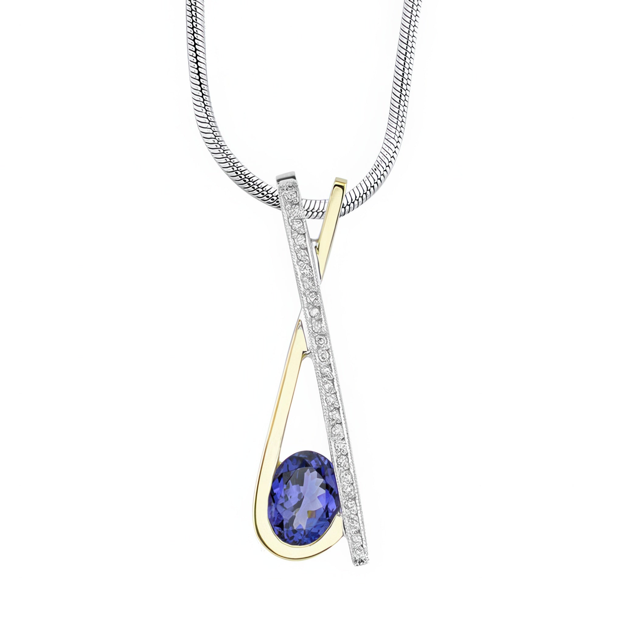This two tone tanzanite and diamond necklace, features crossing bars with a channel set oval tanzanite captured in the yellow gold bar and enhanced by a white gold pave set diamond bar for a unique contemporary look.
