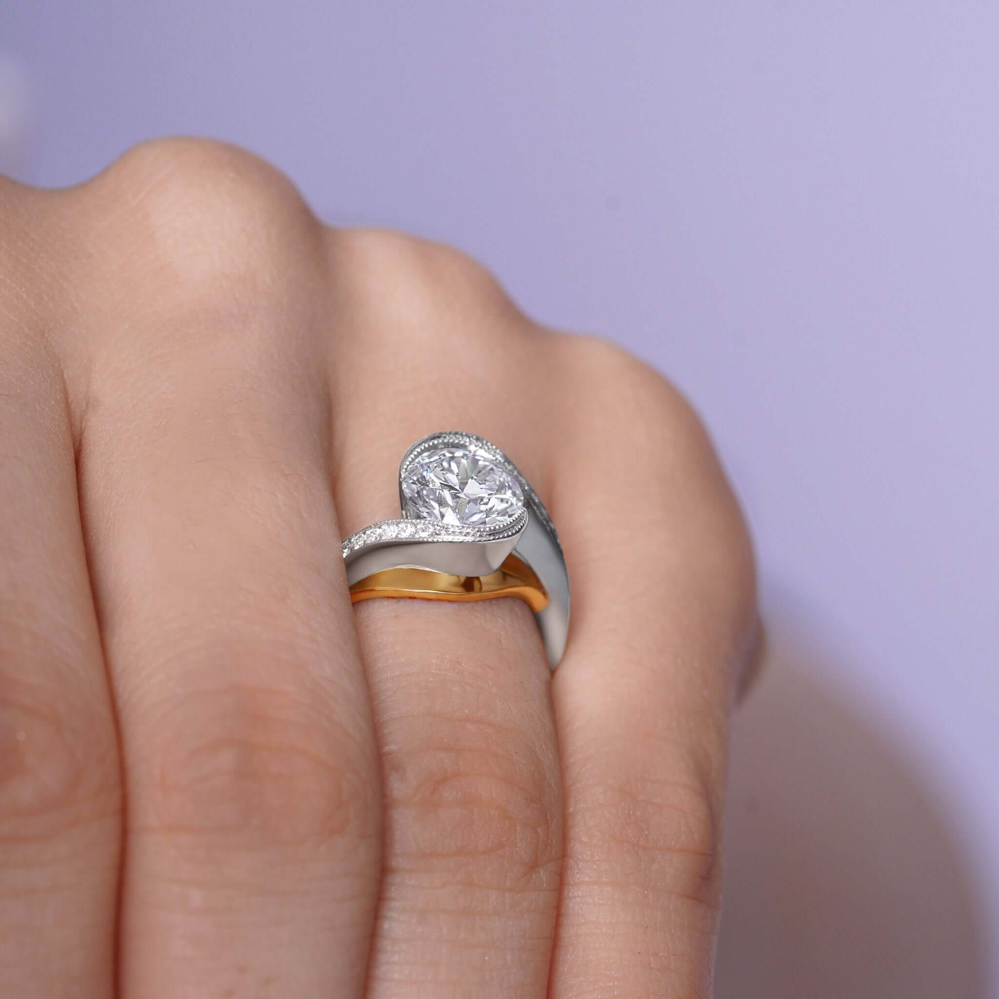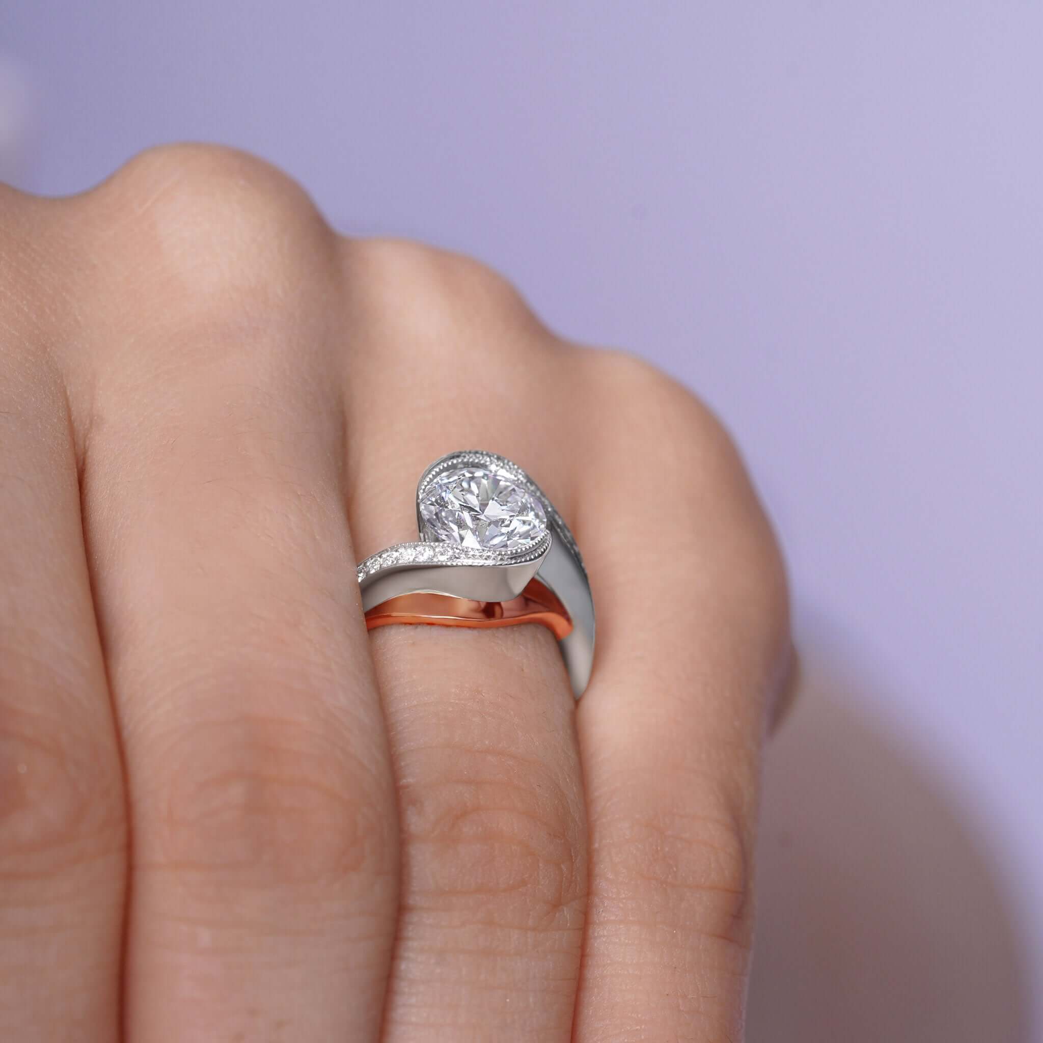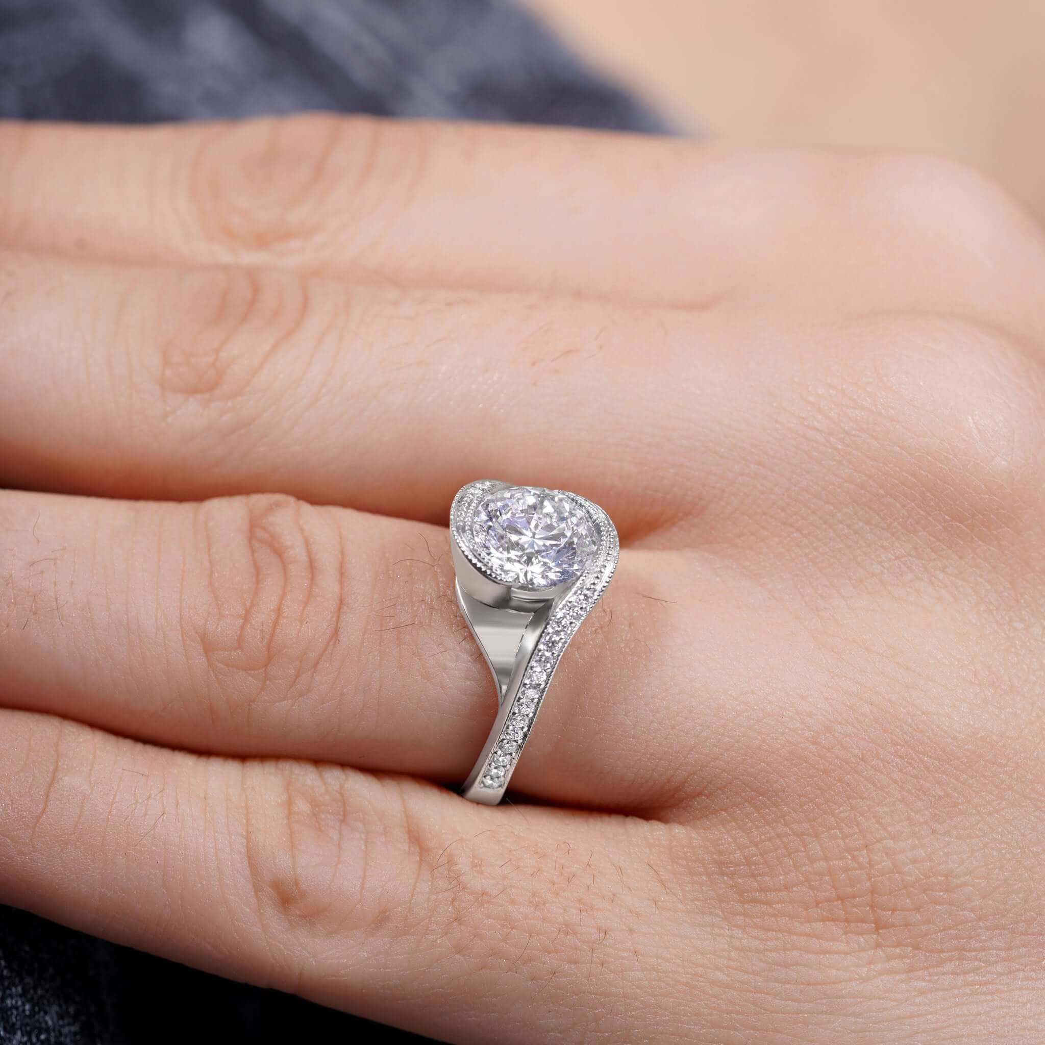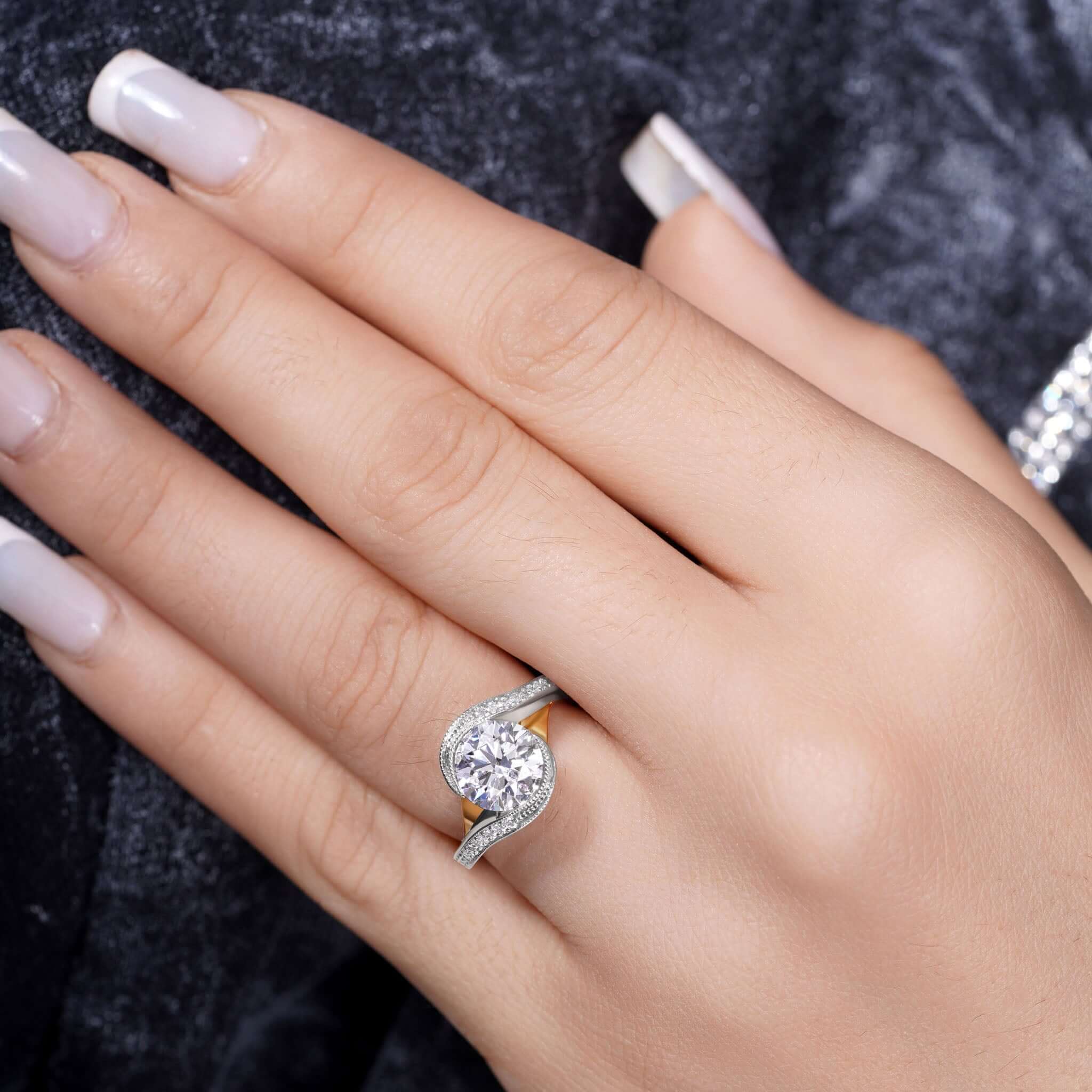 This 2 Carat Bypass Round Moissanite Ring features a stunning central round moissanite complemented by 30 pave-set diamonds that enhance its brilliance. The intricate milgrain detailing adds a refined vintage touch, showcasing expert craftsmanship. Designed to captivate, this ring balances bold sparkle with elegant design, making it a timeless choice for those seeking sophistication and exceptional quality.