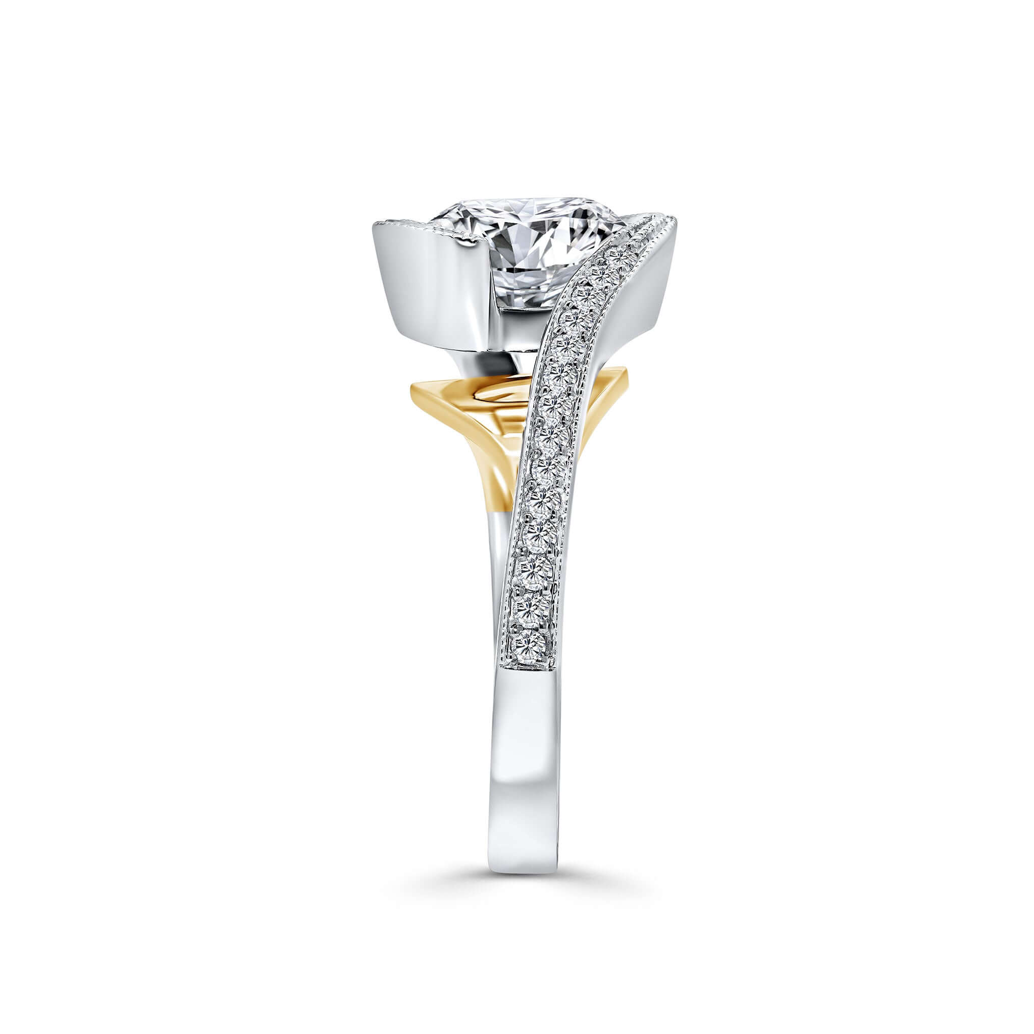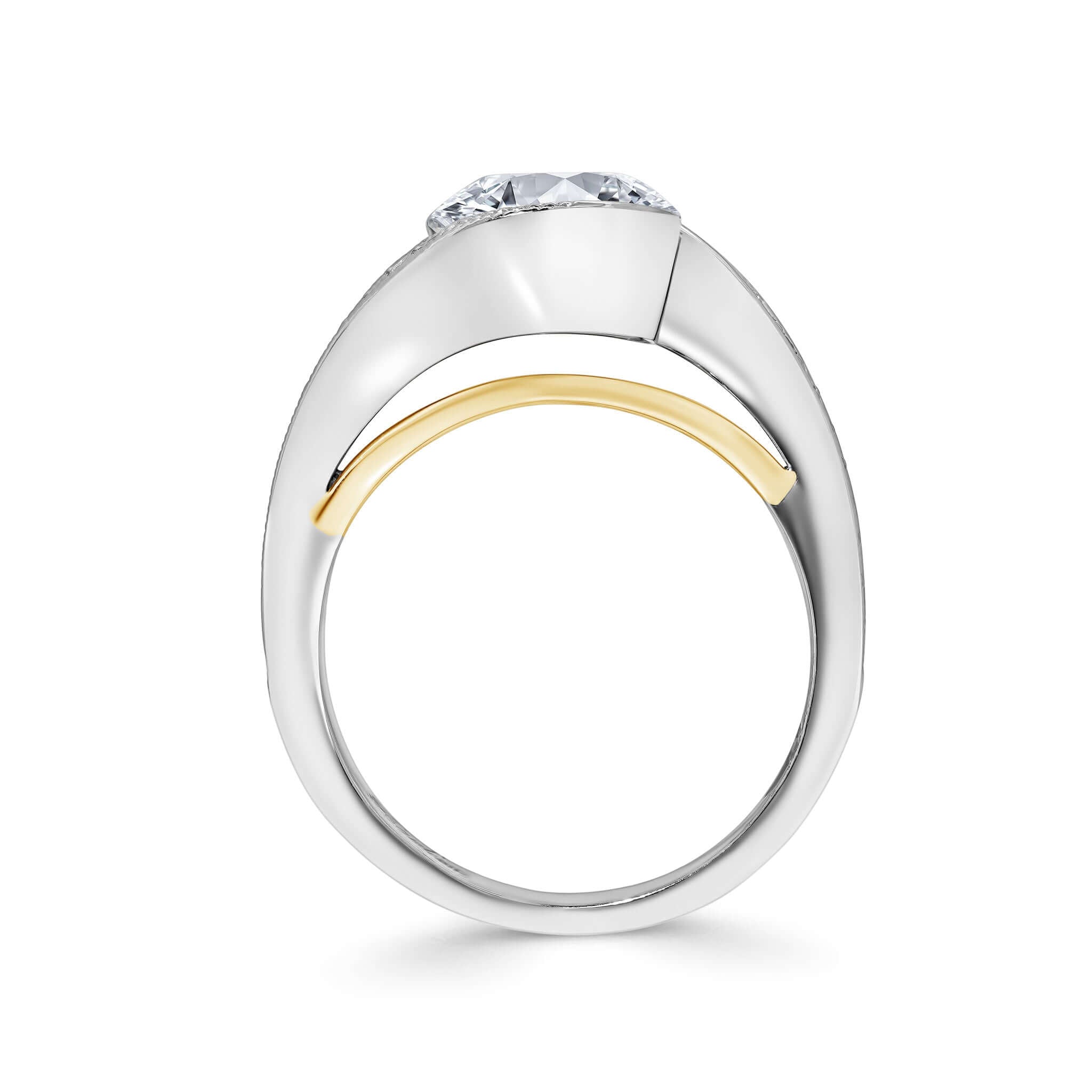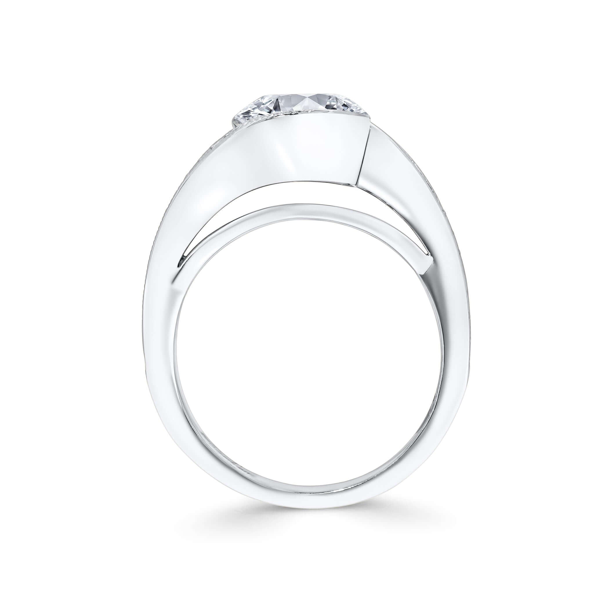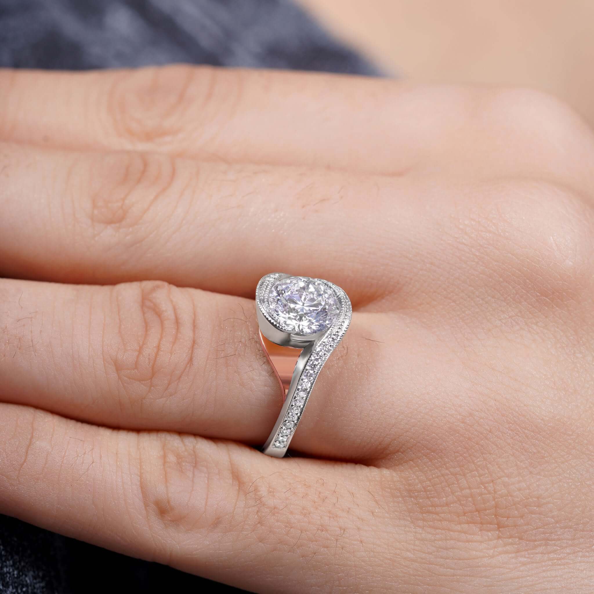 This 2 Carat Bypass Round Moissanite Ring features a stunning central round moissanite complemented by 30 pave-set diamonds that enhance its brilliance. The intricate milgrain detailing adds a refined vintage touch, showcasing expert craftsmanship. Designed to captivate, this ring balances bold sparkle with elegant design, making it a timeless choice for those seeking sophistication and exceptional quality.