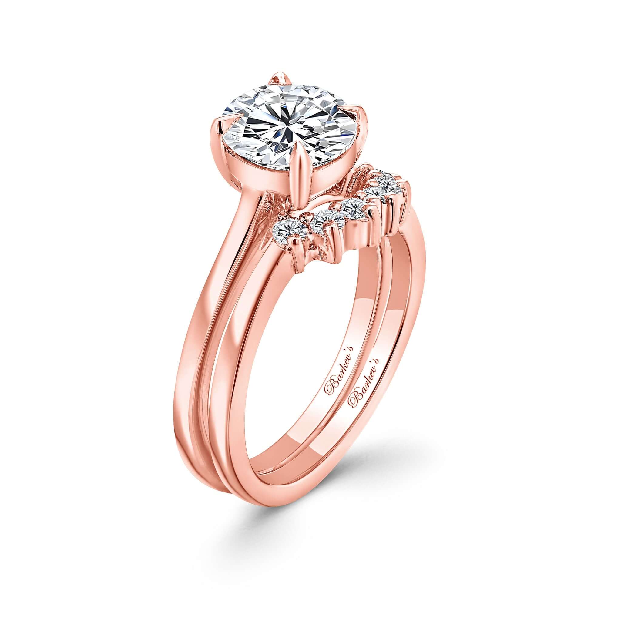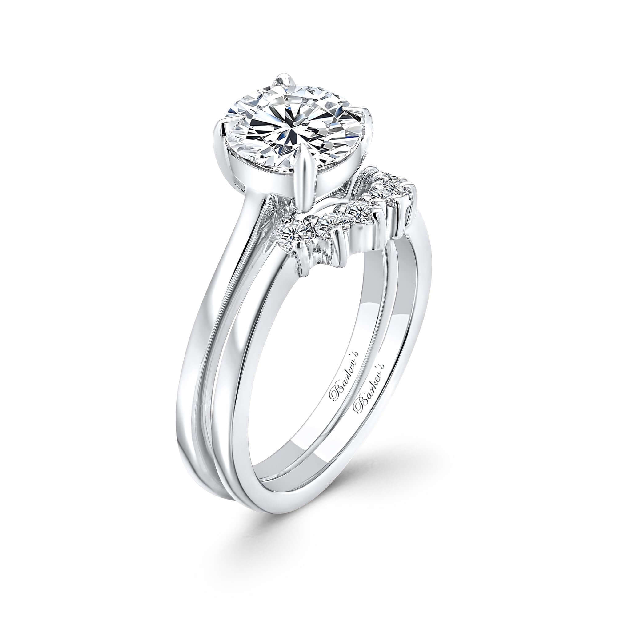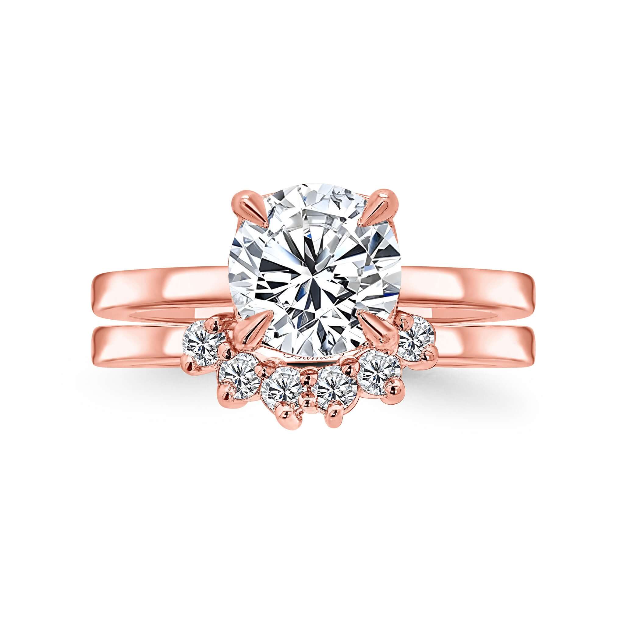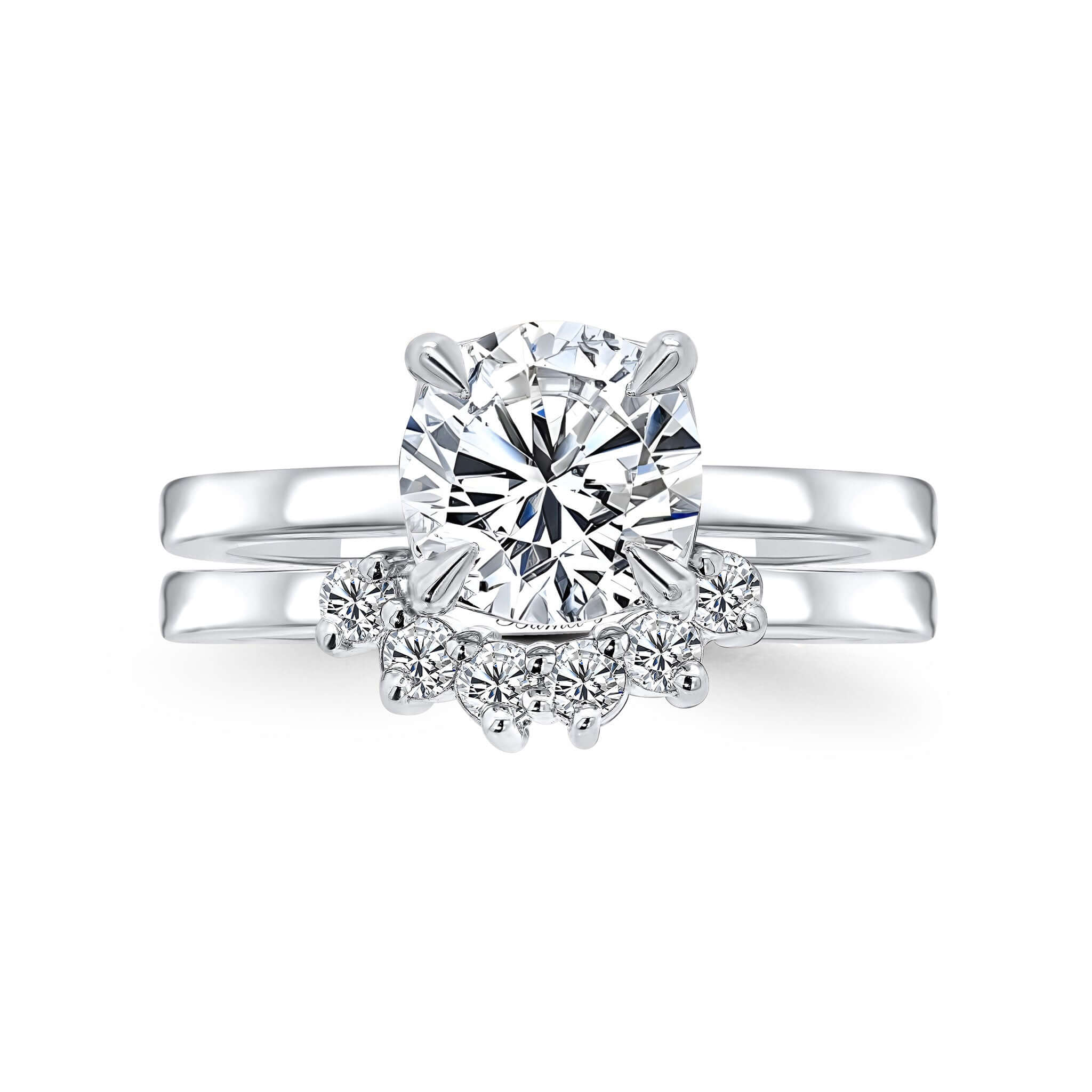 A beautiful 2 carat round moissanite bridal set featuring a simple shank design that diverts all the attention to the sparkling centerpiece and a diamond wedding band featuring 6 shared prong set diamonds for an elegant look.