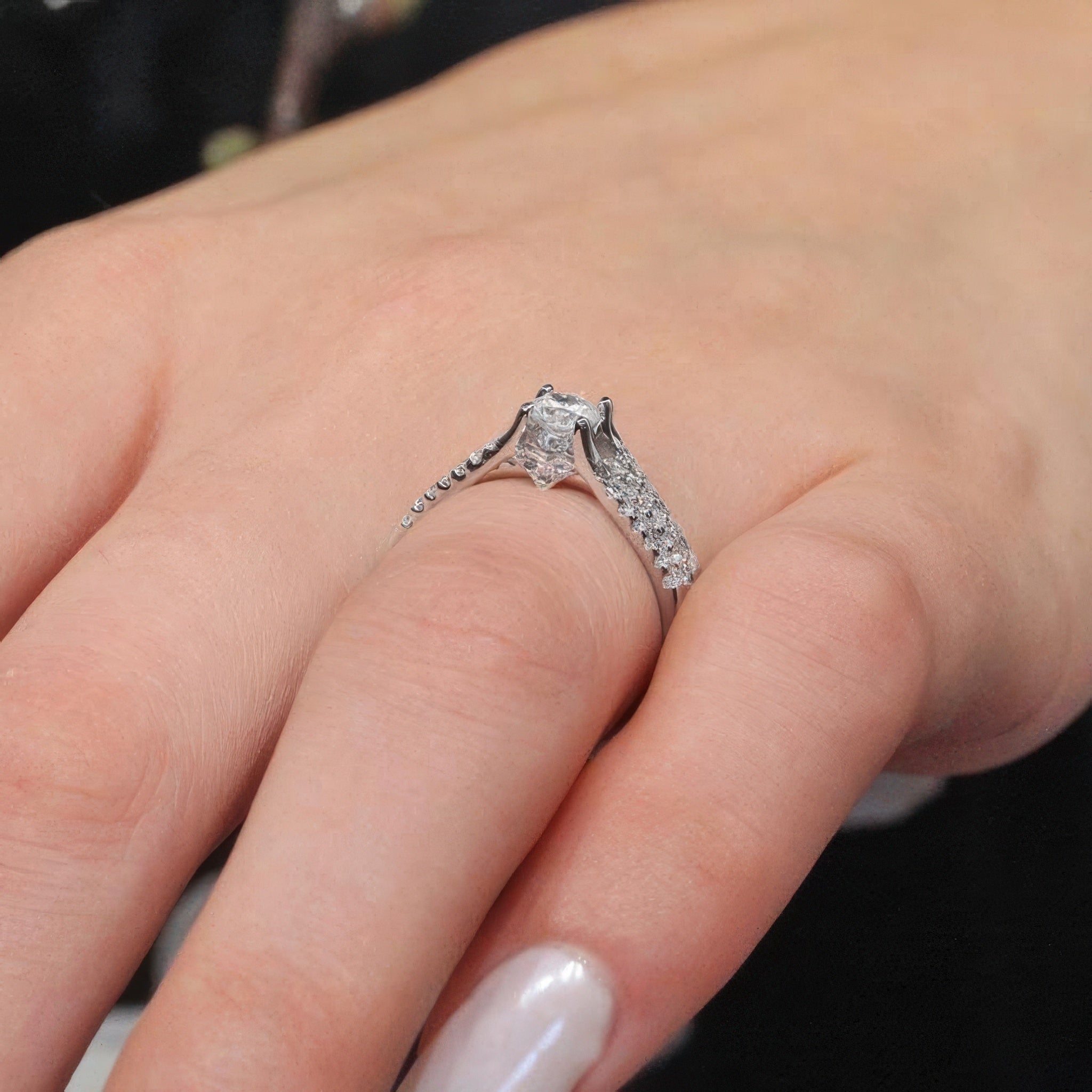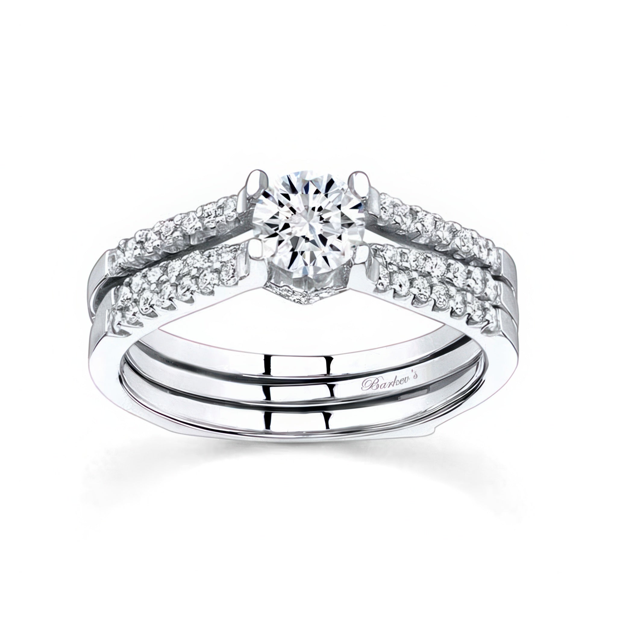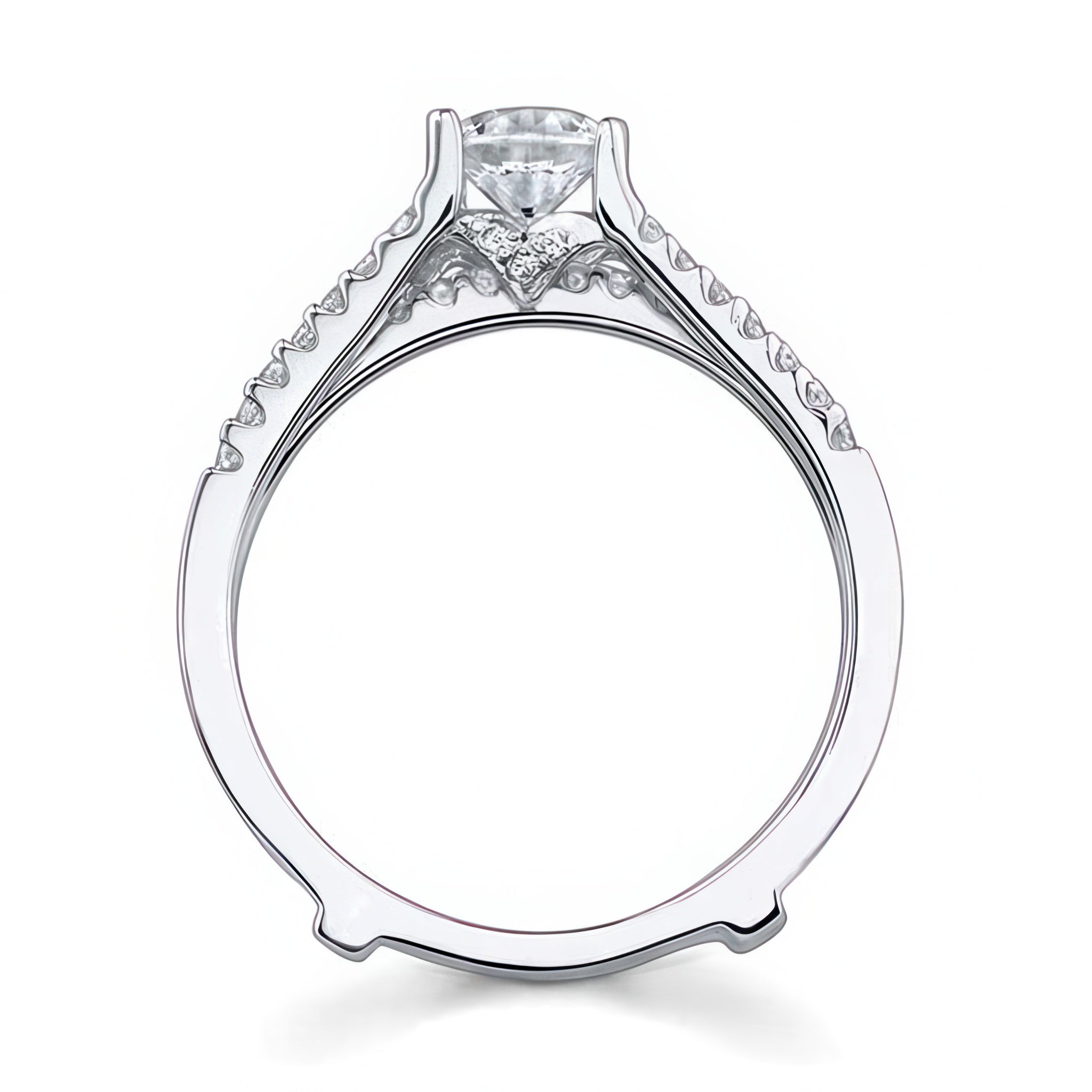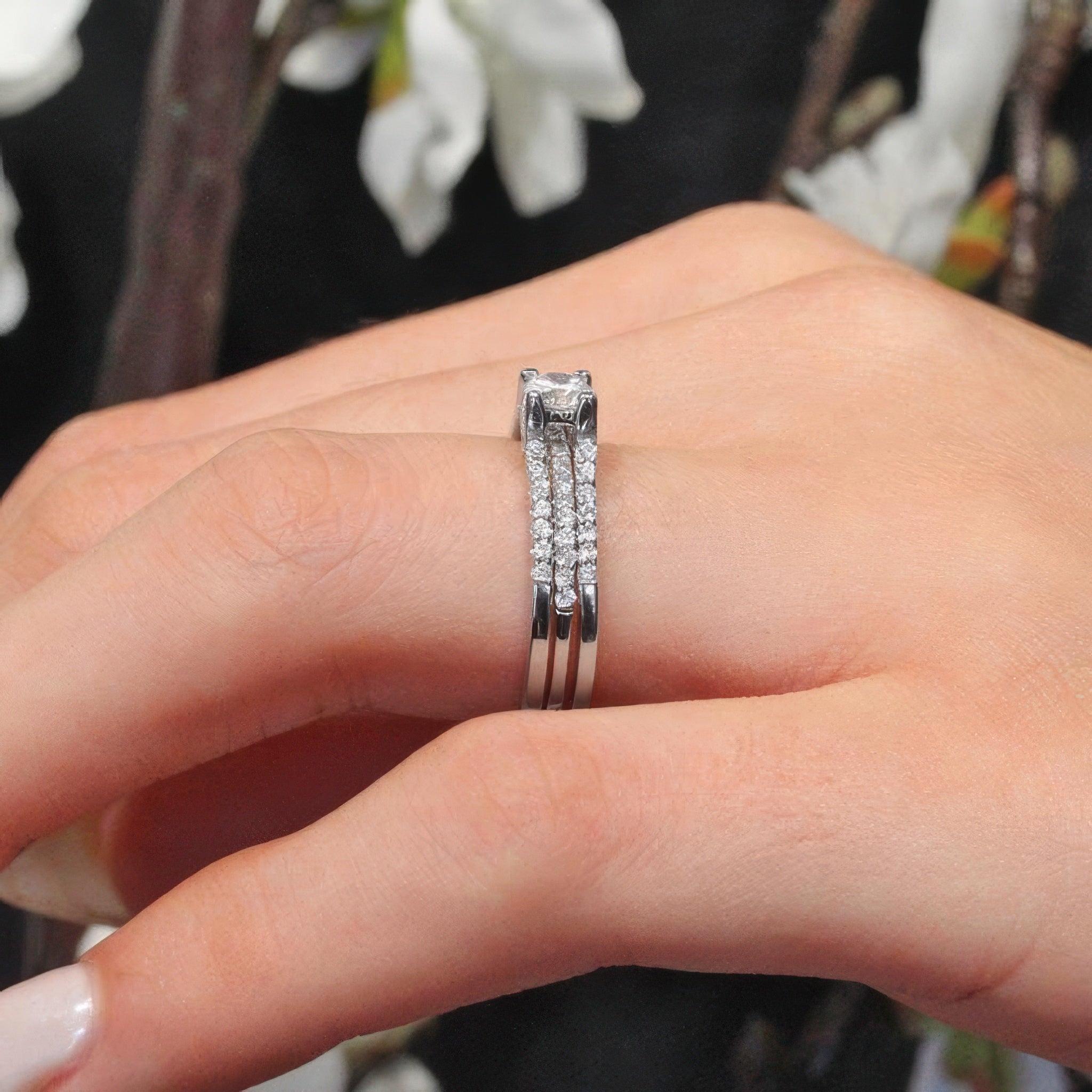 This 3 row moissanite bridal set features a prong set round center and shared prong set diamonds cascading down the shoulders. Comes with a matching diamond wedding band.