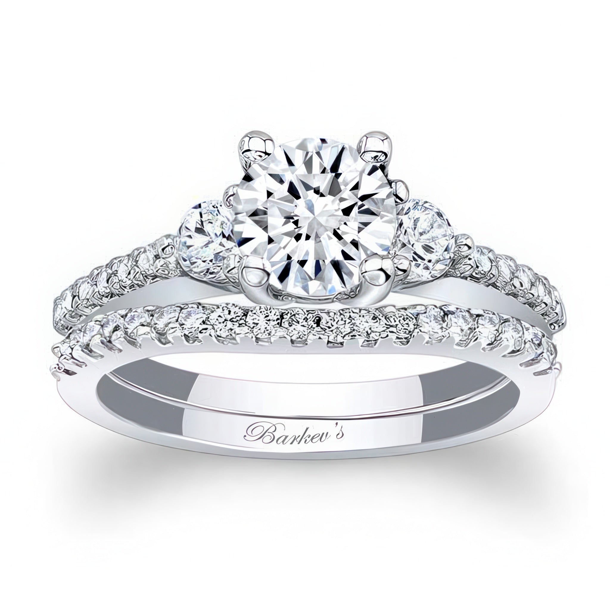 This 3 stone moissanite wedding ring set features an engagement ring with diamonds flanking the prong-set round center. The dainty shoulders and matching band are accented with shared prong set melees adding a finishing touch of elegance to this set.