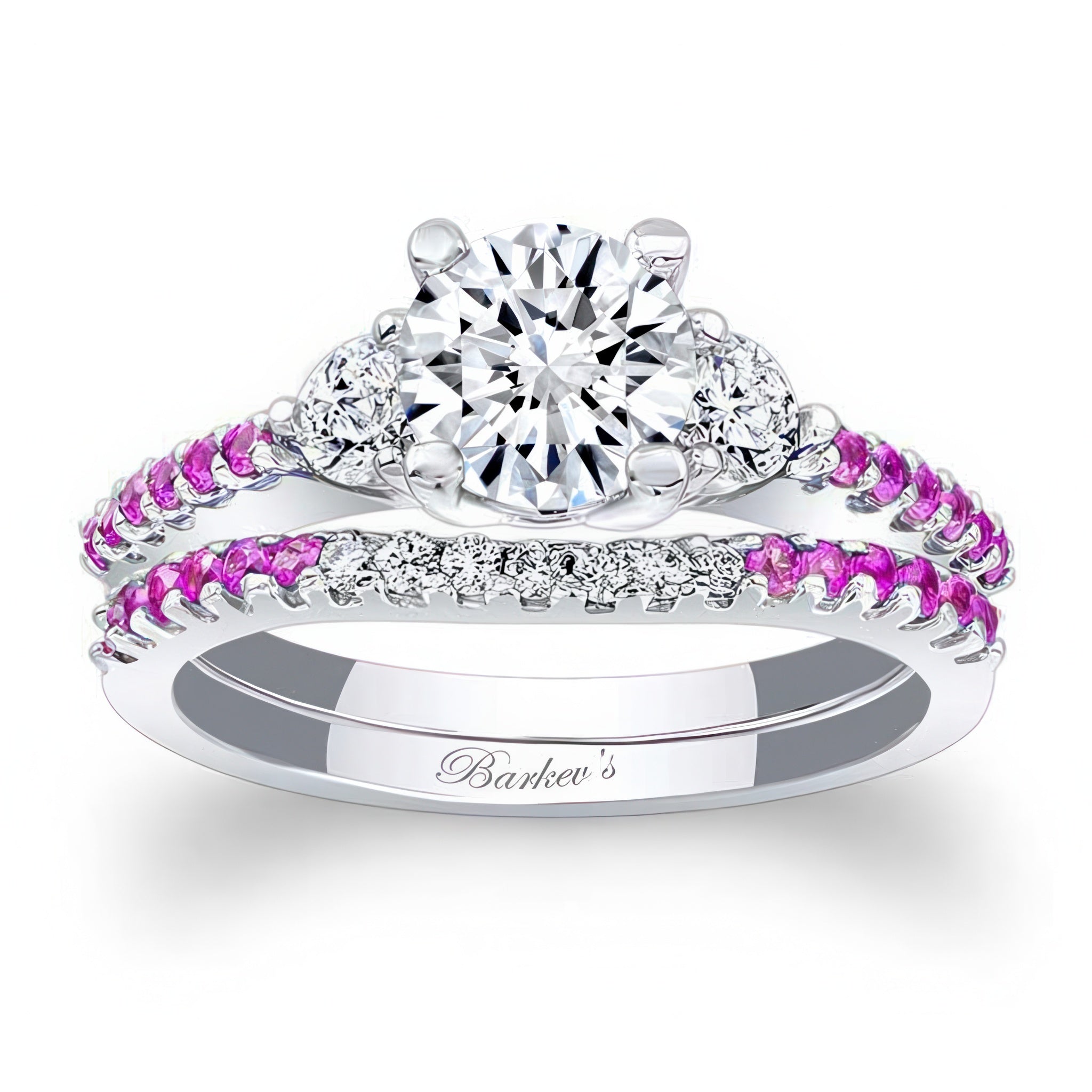 This 3 stone pink sapphire accent moissanite wedding ring set features an engagement ring with diamonds flanking the prong-set round center. The dainty shoulders and matching band are accented with shared prong set melees adding a finishing touch of elegance to this set.
