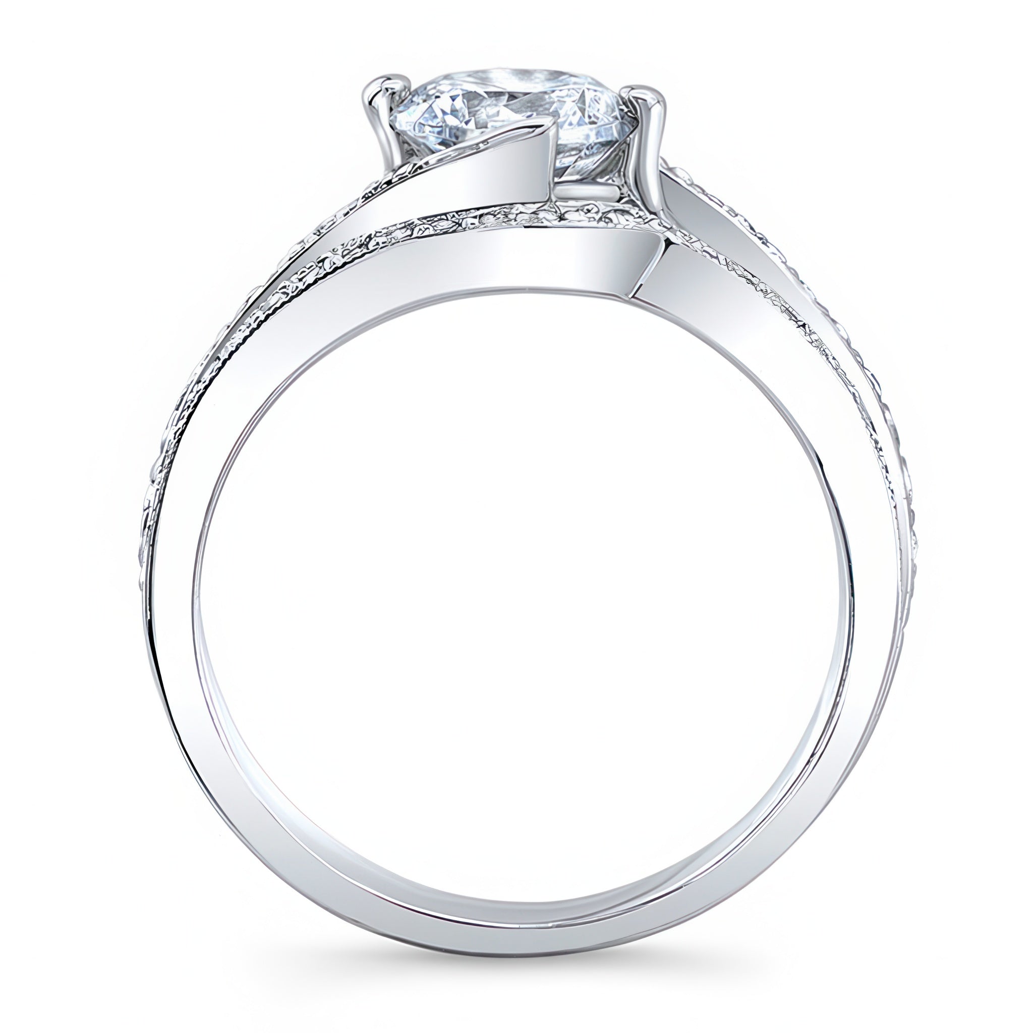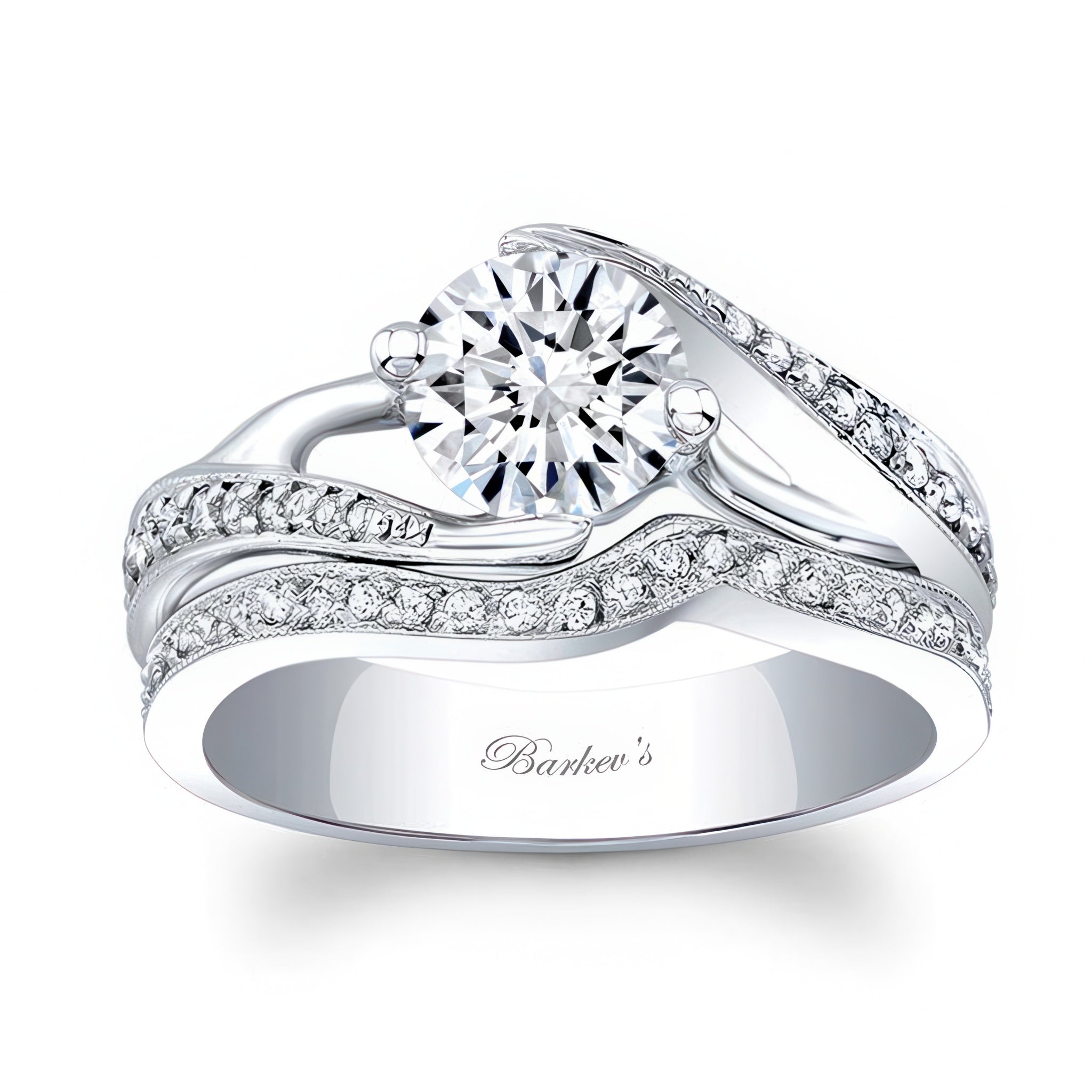 This modern bypass moissanite bridal set has a channel set round center with pave set diamonds on the shoulder and a milgrain finish for a touch of glam. Comes with a matching wedding band.
