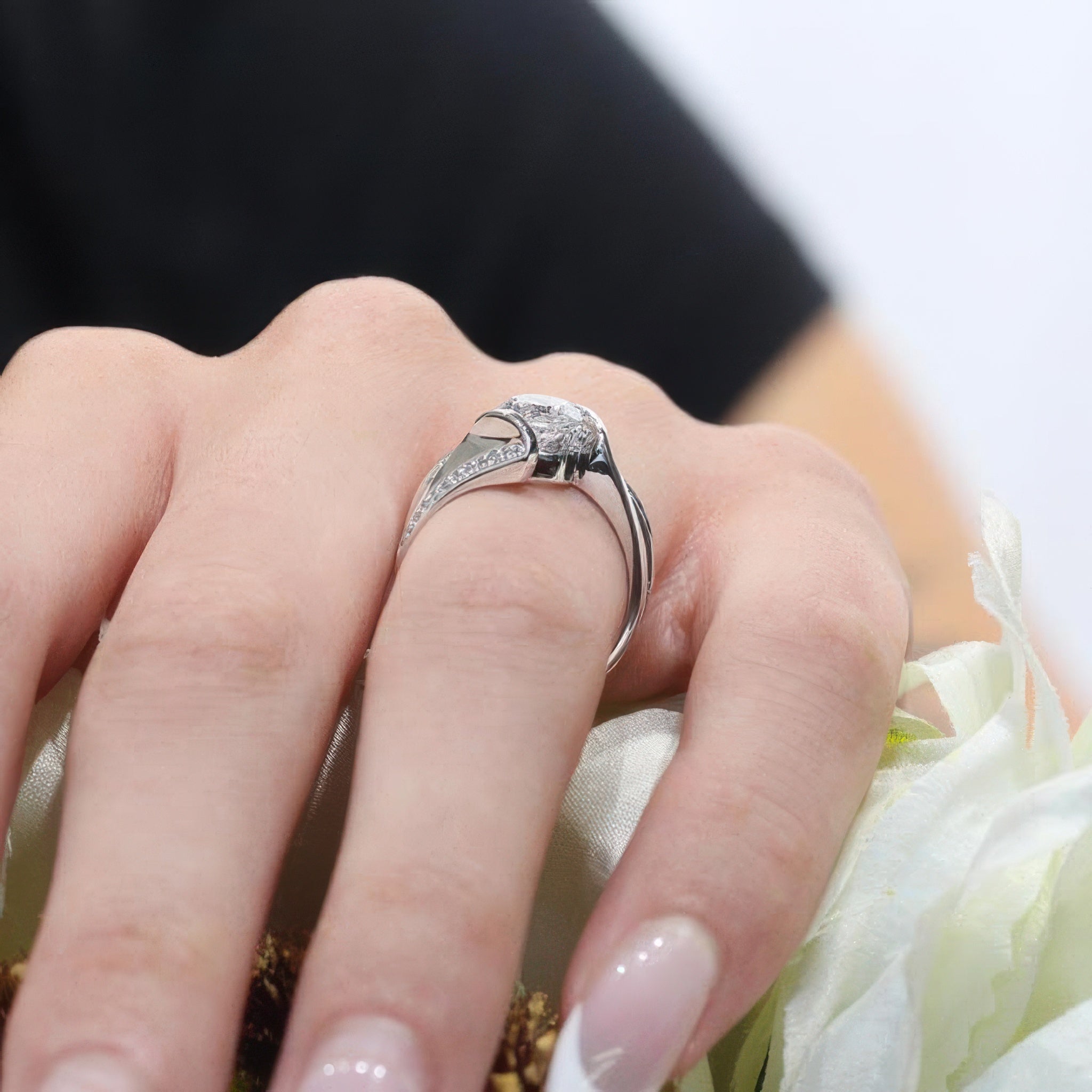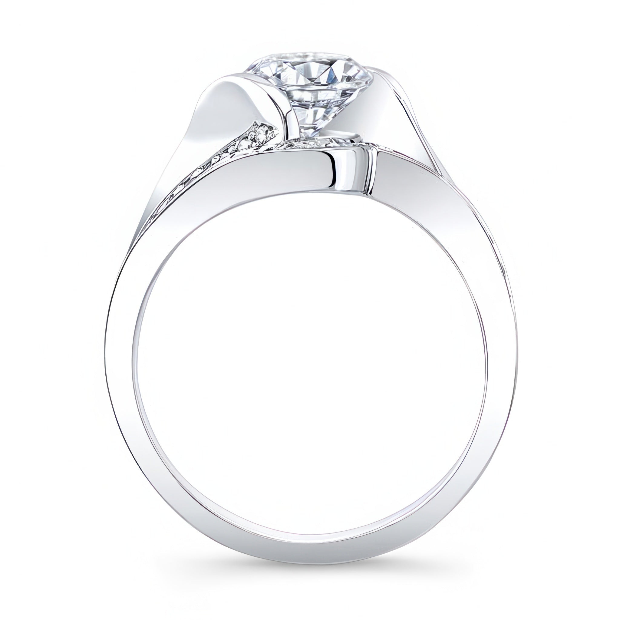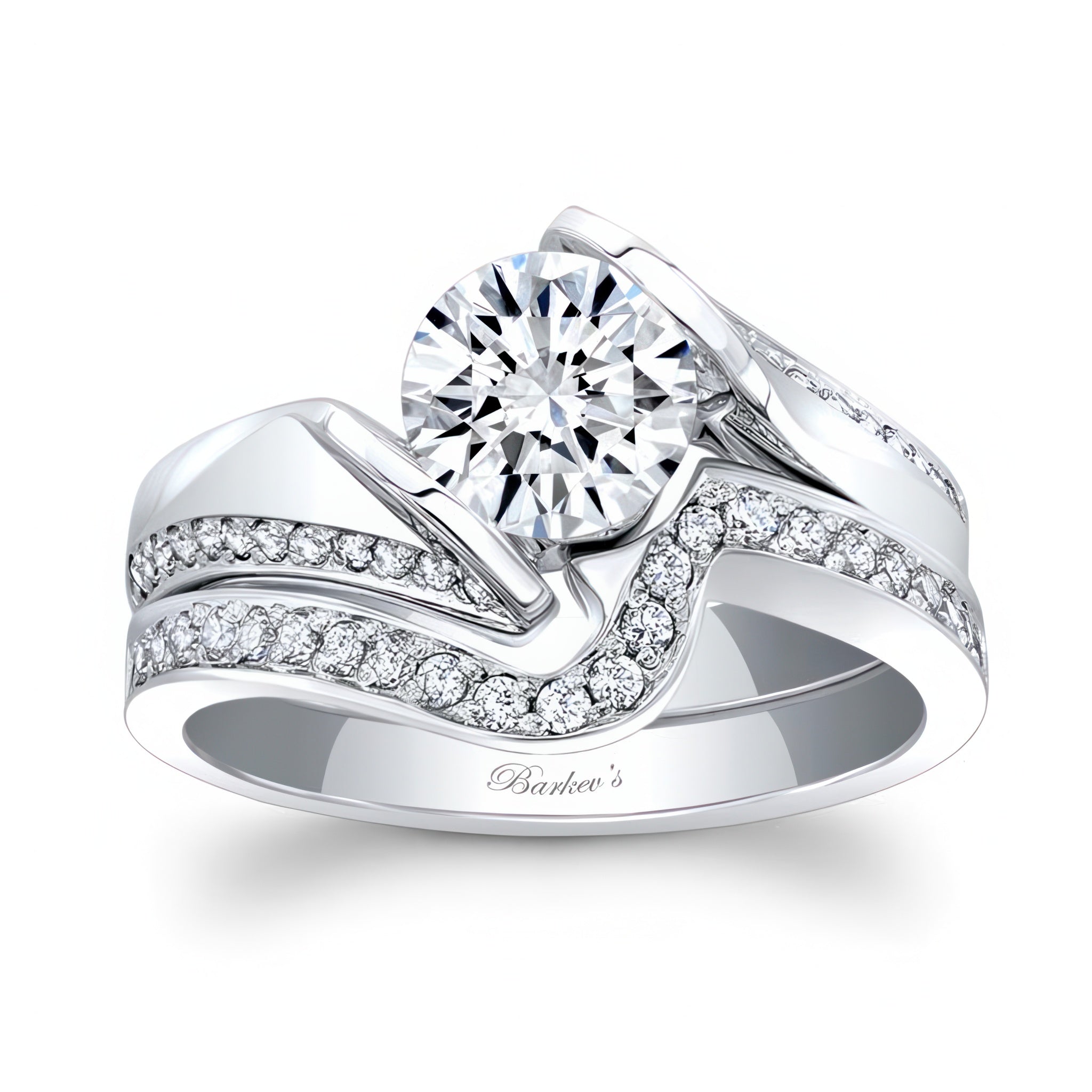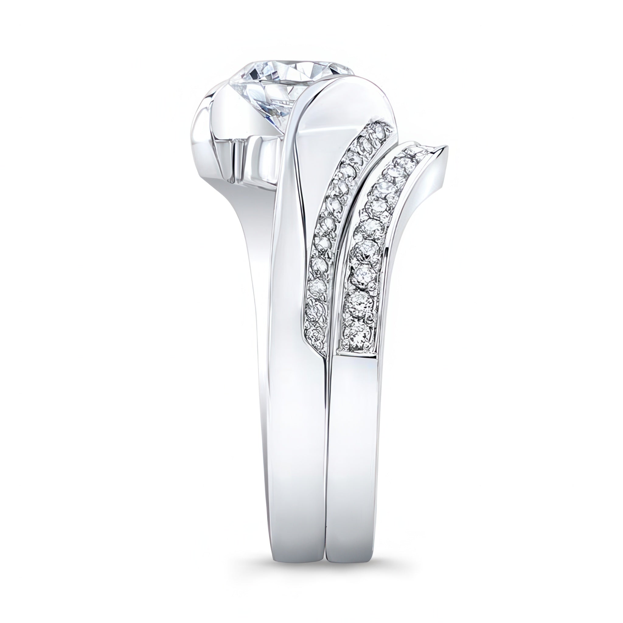 A bold channel moissanite bridal set featuring a channel set round center captured by split twisted ridges with pave set diamonds accenting the shoulders for a stunning touch of sophistication. Comes with a matching wedding band.