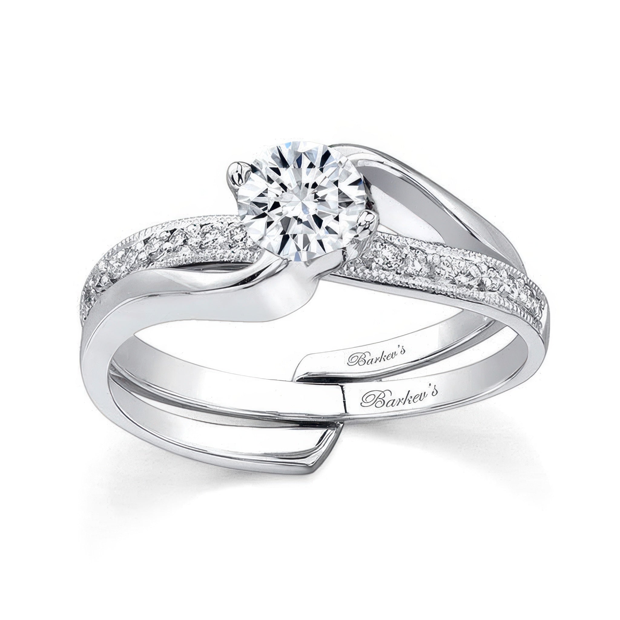 This half carat moissanite milgrain interlocking bridal set features a solitaire ring with twisting shoulders holding a round center and an interlocking pave set diamond wedding band that slips underneath for a touch of elegance.