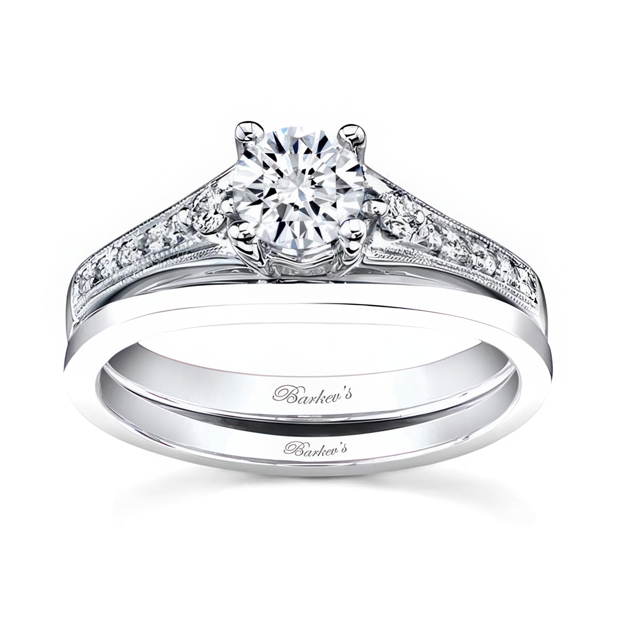 This half carat moissanite pave bridal set features a round center with flanking side stones and pave set diamonds cascading down the shoulders with a milgrain finish. Comes with a plain wedding band.