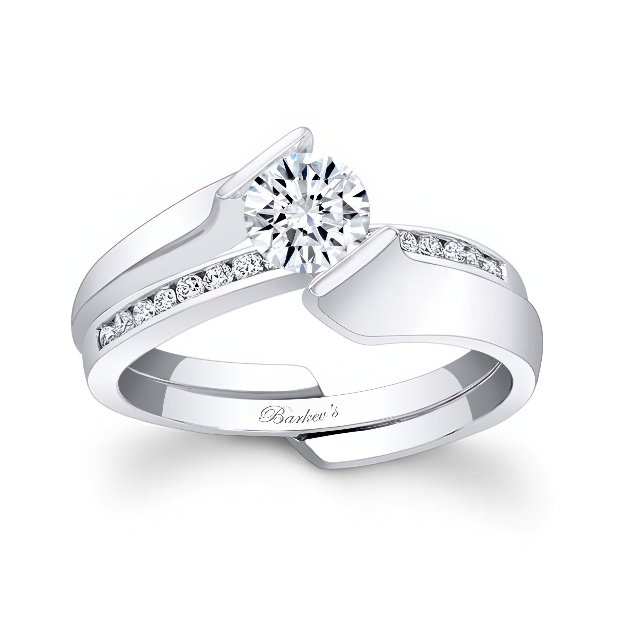 This half carat moissanite solitaire bridal set features a soltaire ring with a channel set round center and a channel set diamond interlocking wedding band.
