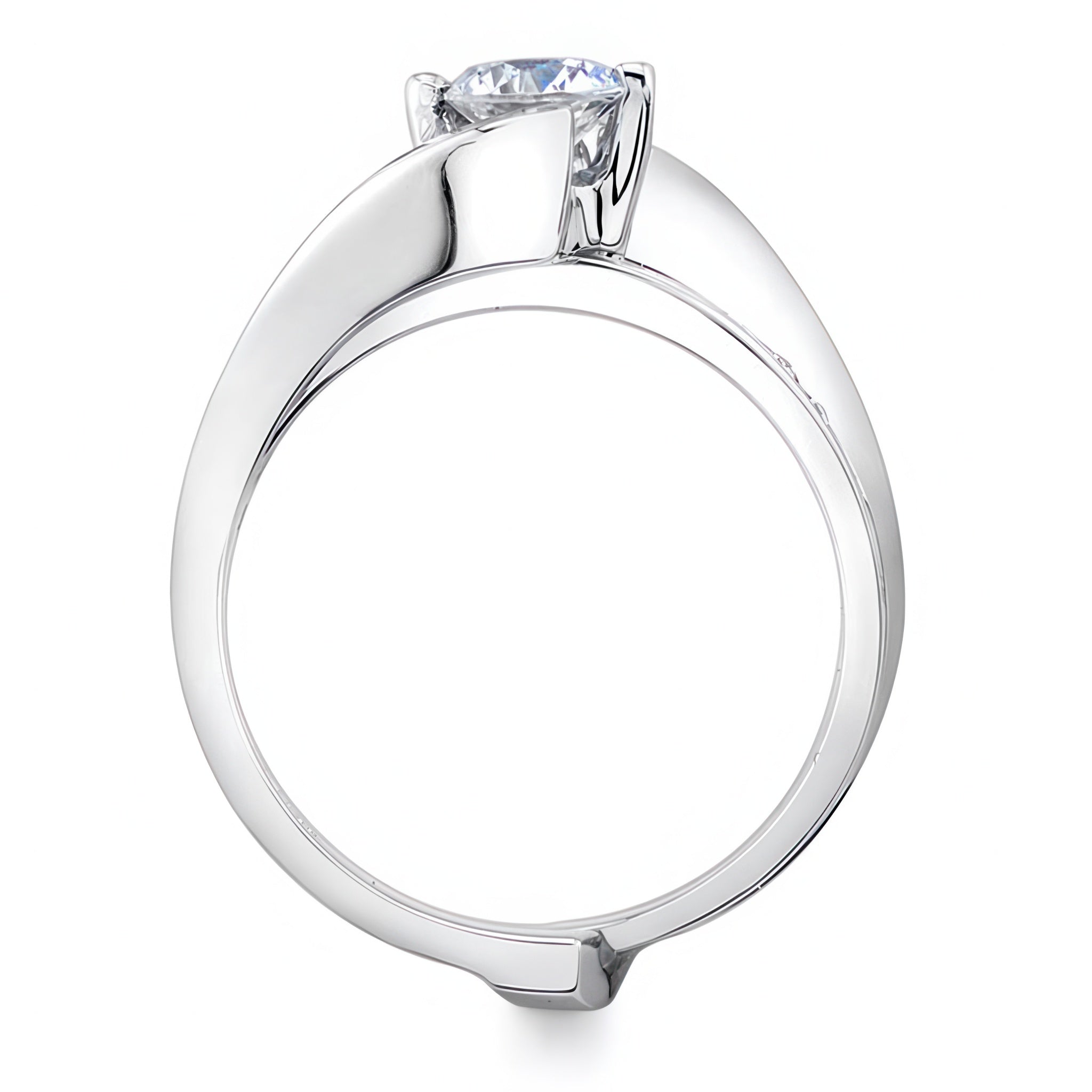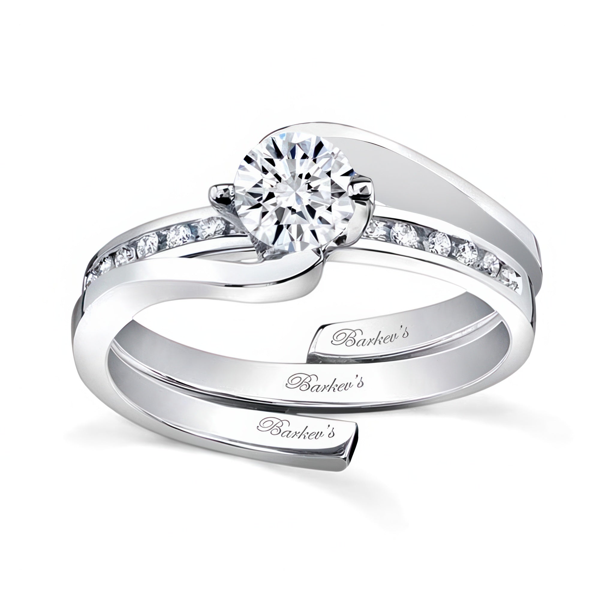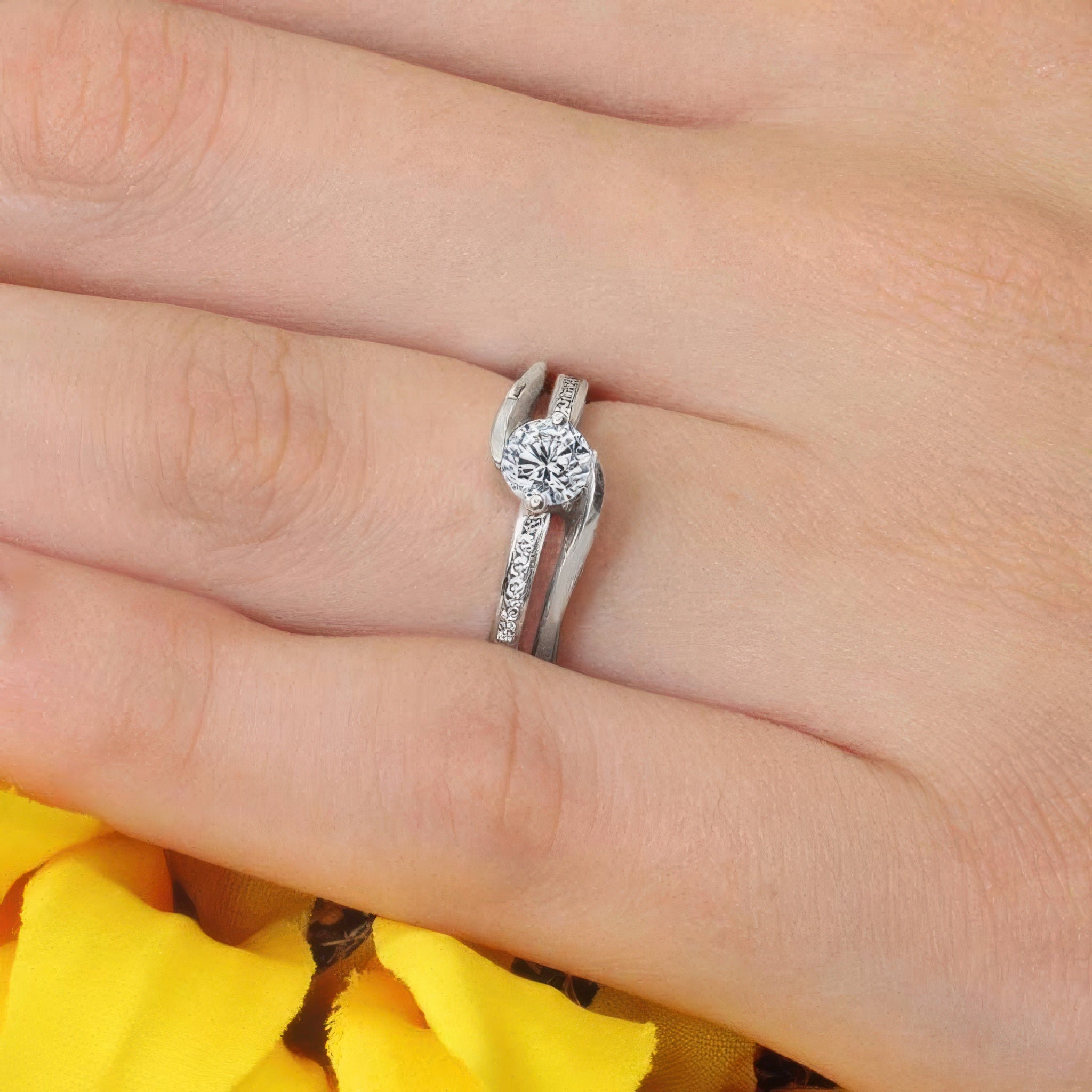 This half prong moissanite bridal set features a half channel half prong set round center and a channel set diamond wedding band for a glamorous look.