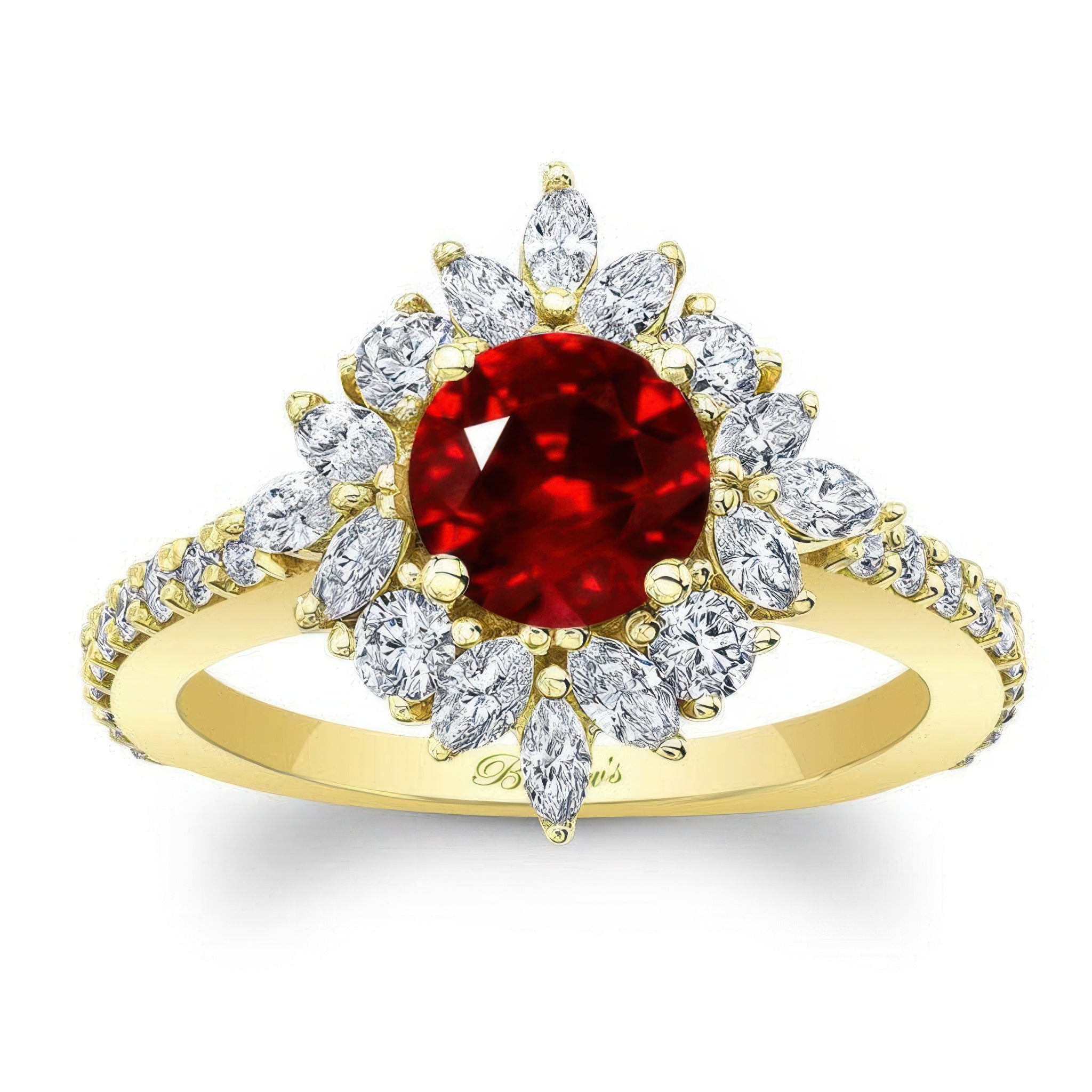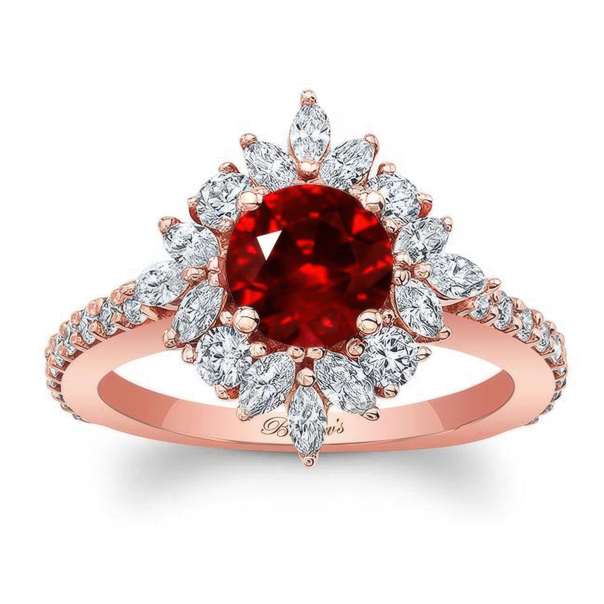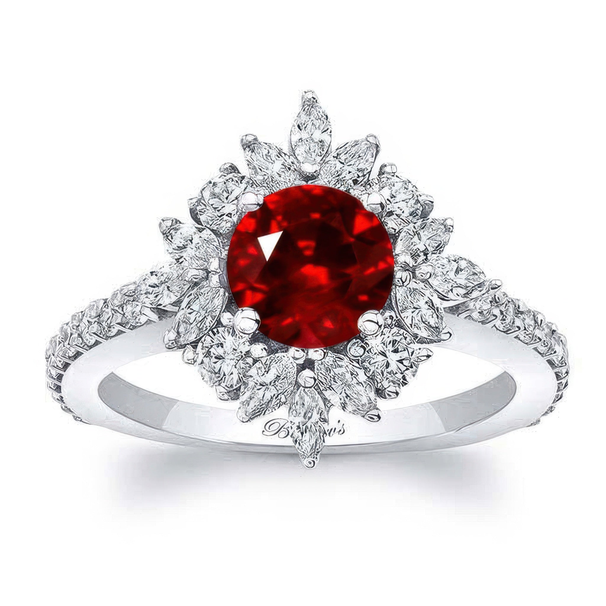 This marquise halo ruby and diamond engagement ring features a prong set round center artfully encircled with marquise and round melees, while shared prong set diamonds grace the shoulders for a timeless look.