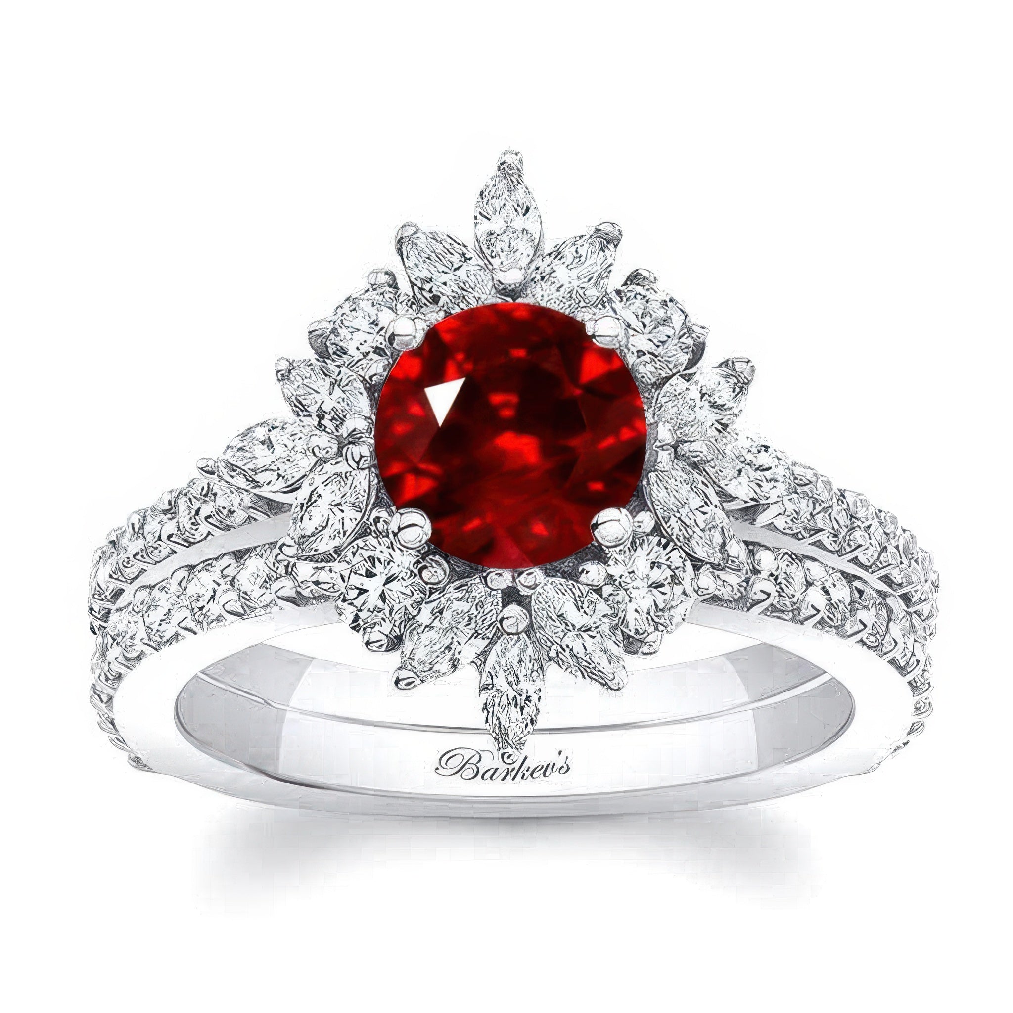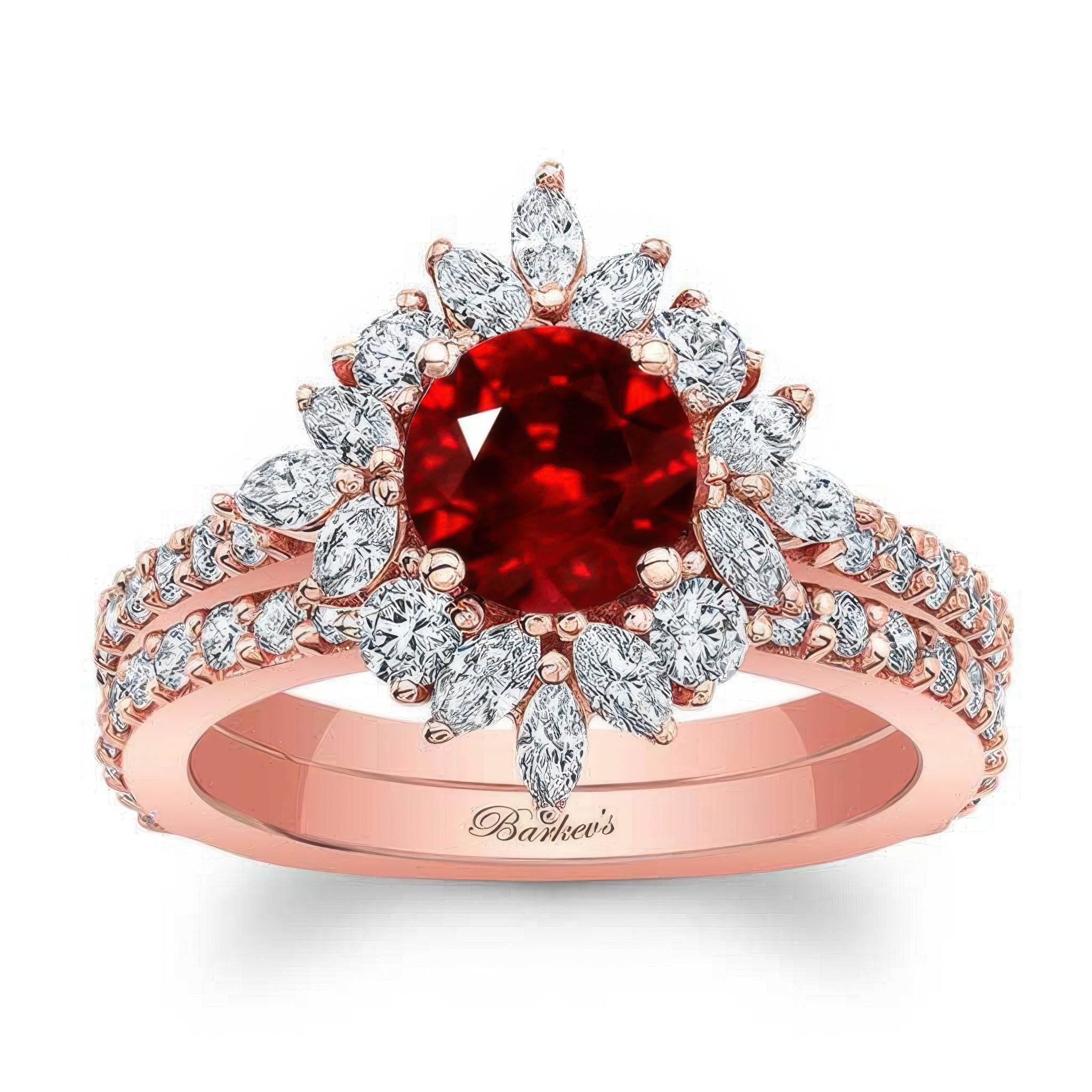 This marquise halo ruby and diamond wedding set features a prong set round center artfully encircled with marquise and round melees, while shared prong set diamonds grace the shoulders and matching wedding band for a timeless look.