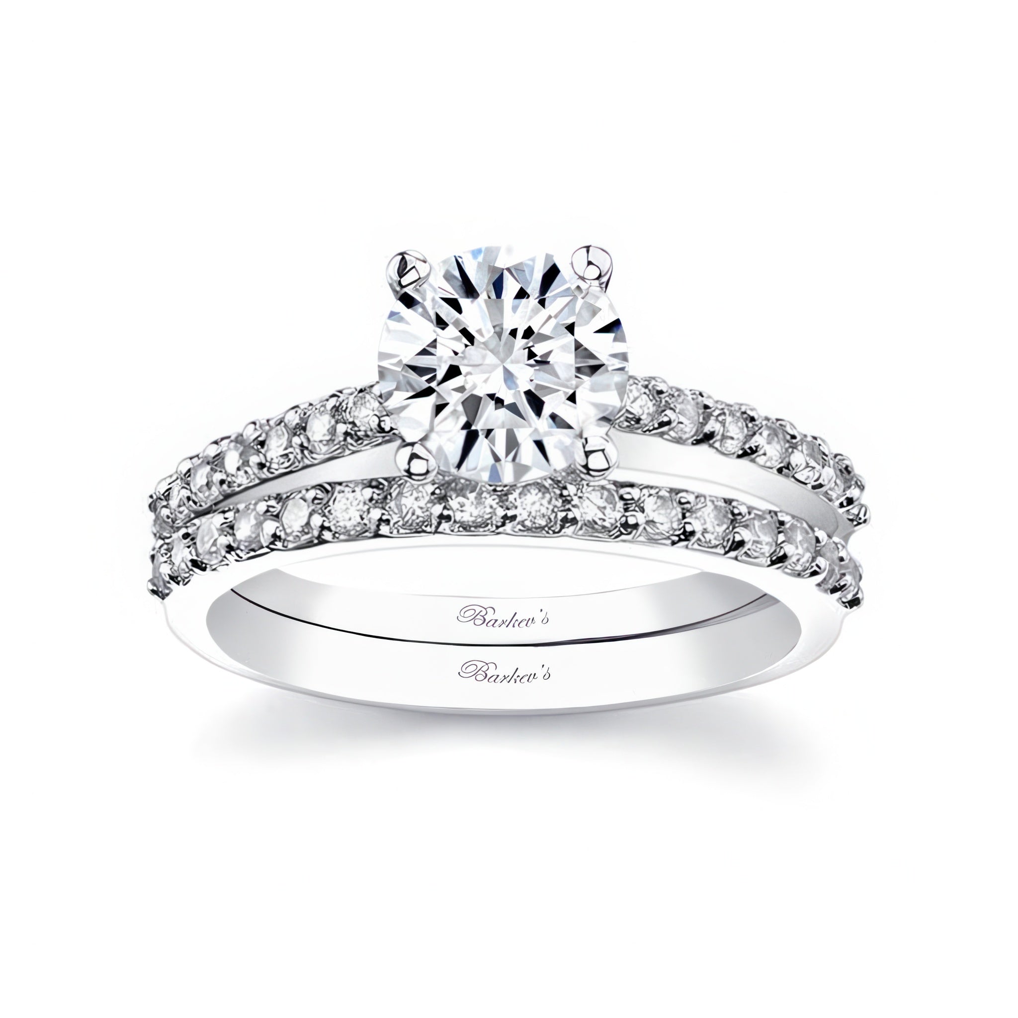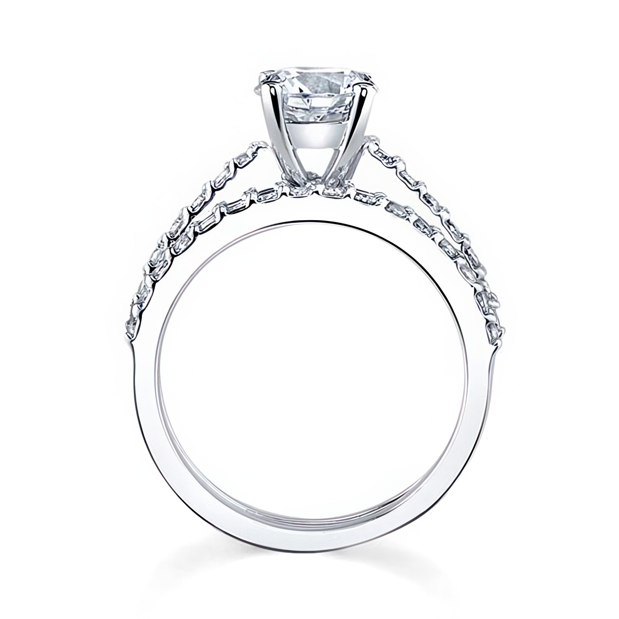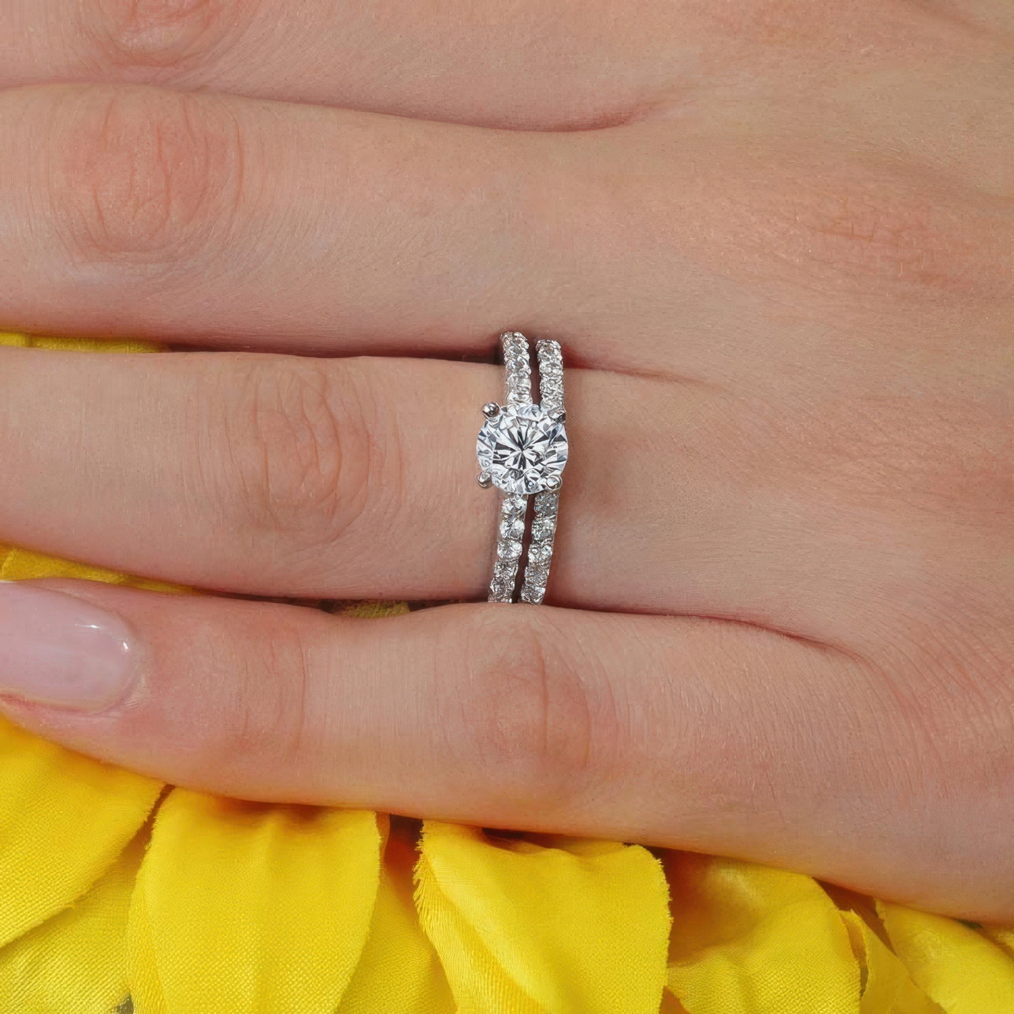This moissanite ring set features a prong set round center with shared prong diamonds adorning the shank. Comes with a matching diamond wedding band.