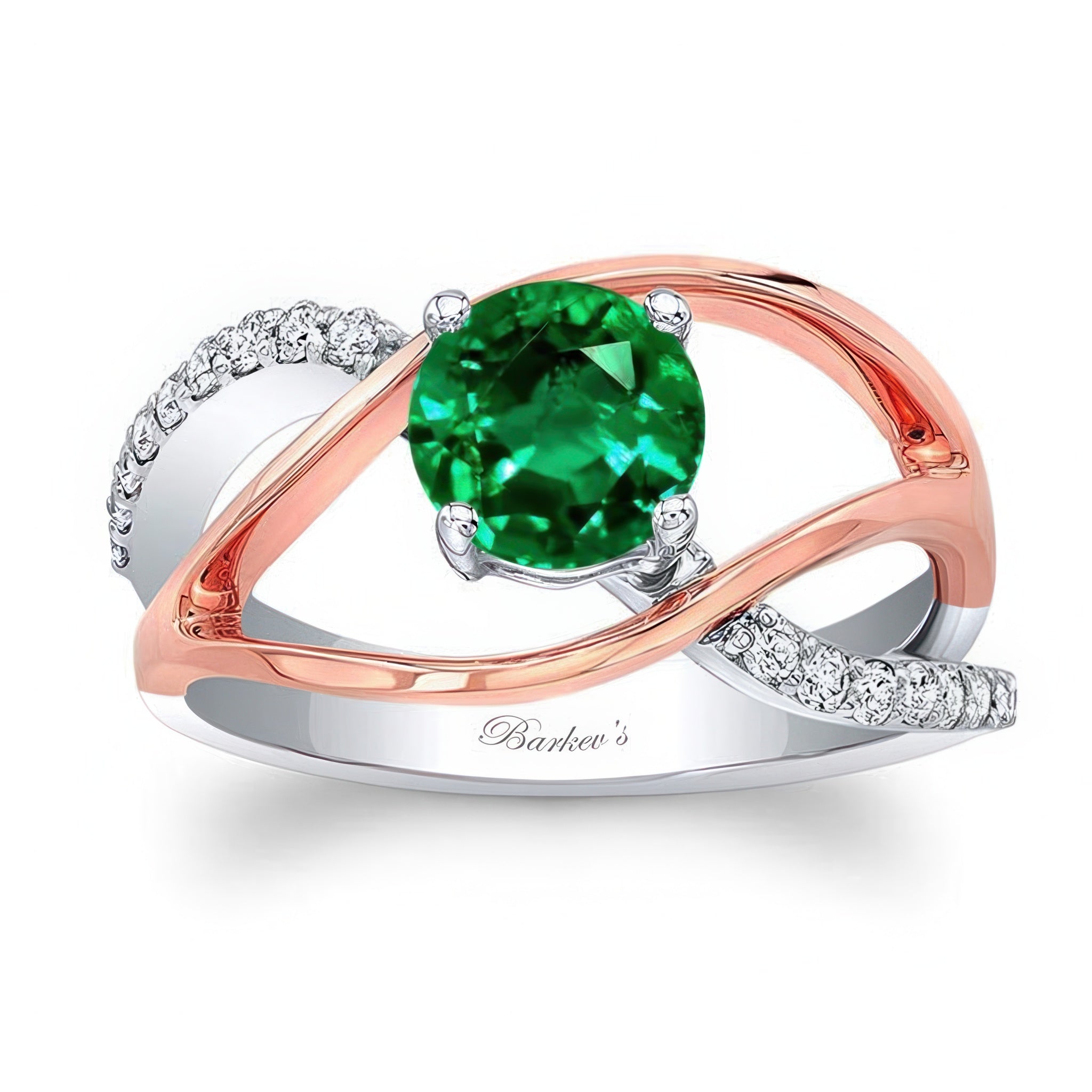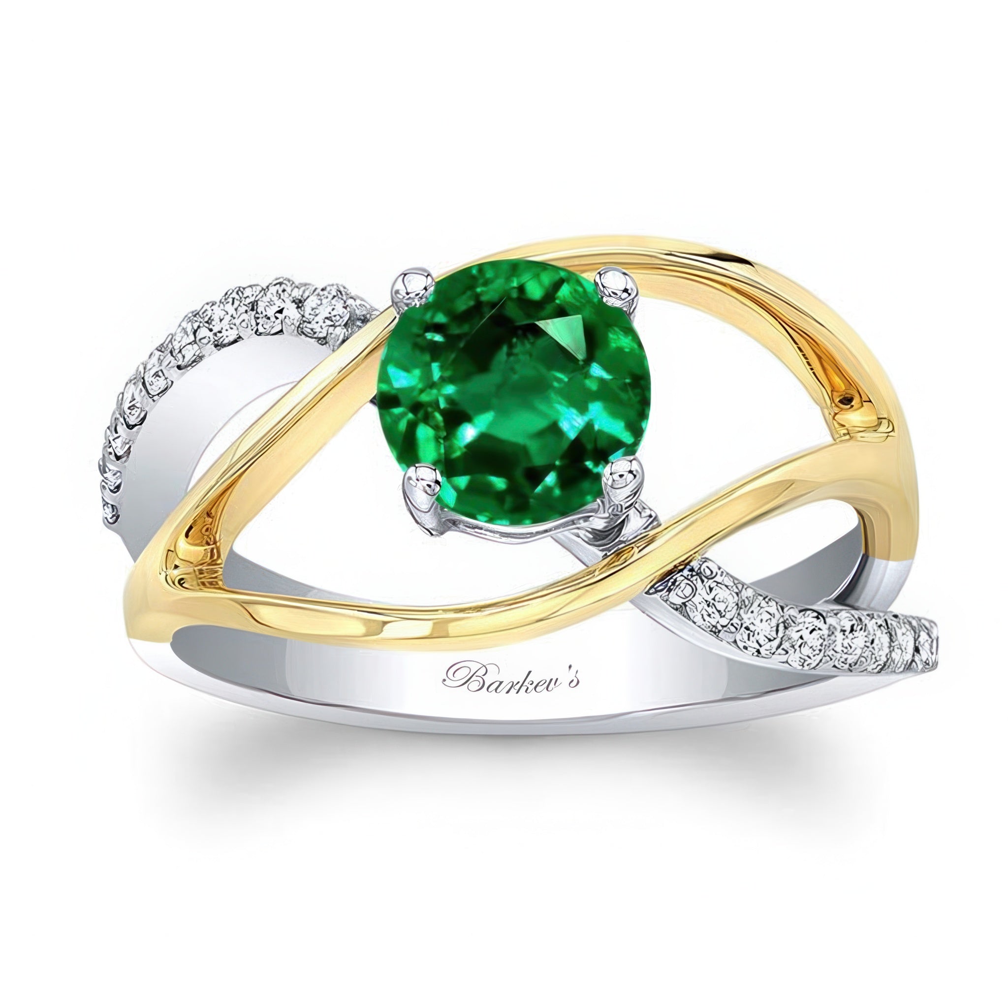 This open shank emerald and diamond ring features a prong set round center with shared prong set diamond accents while two high polished ridges curve around the middle on each side for an elegant touch of glam.