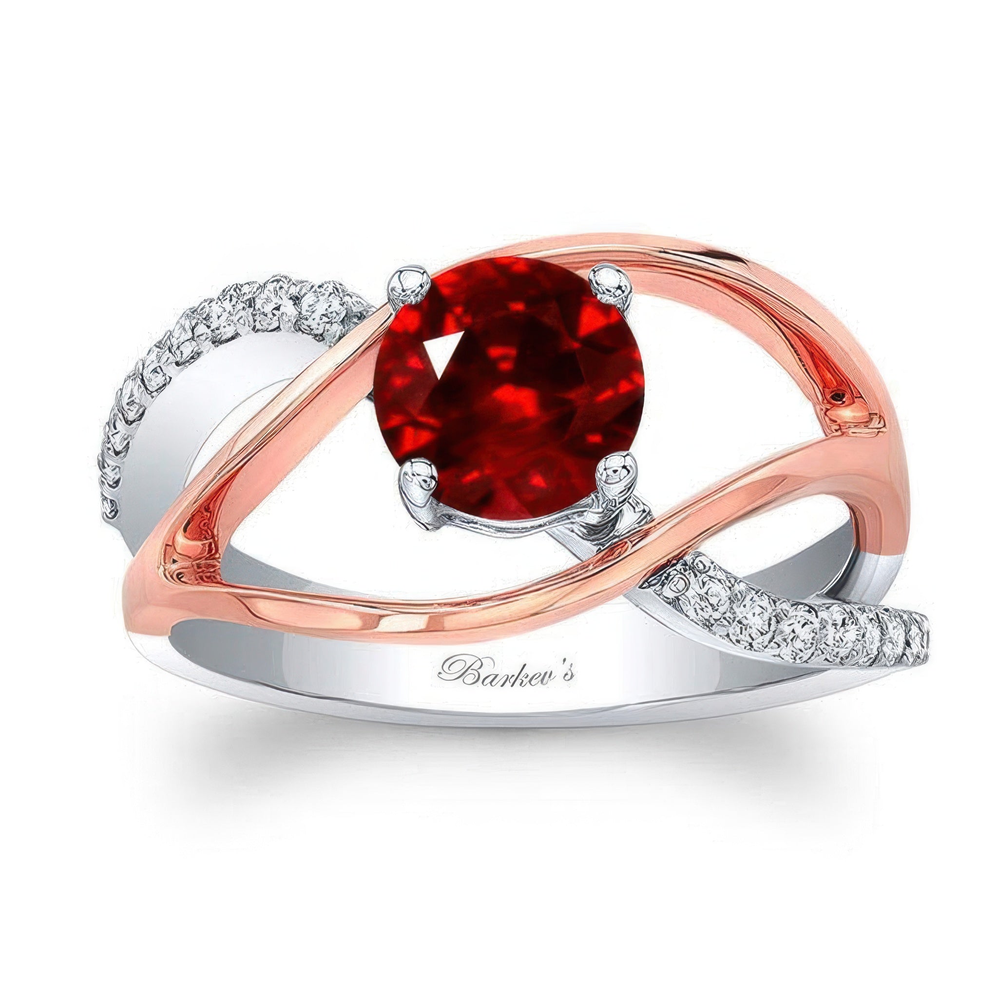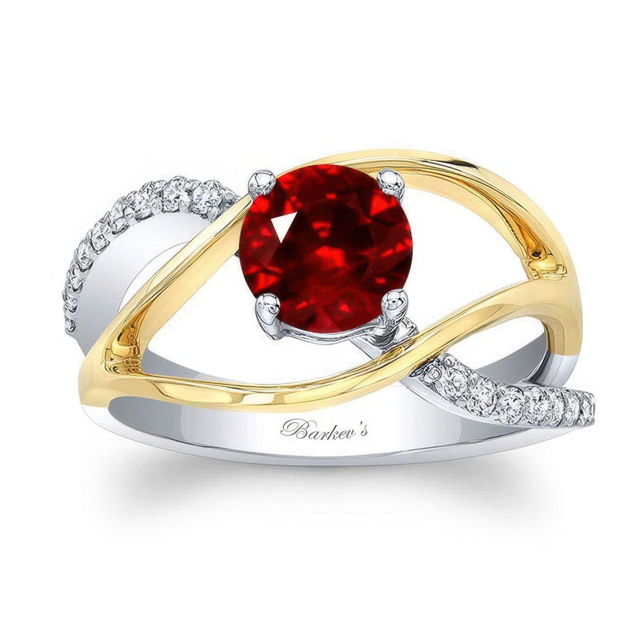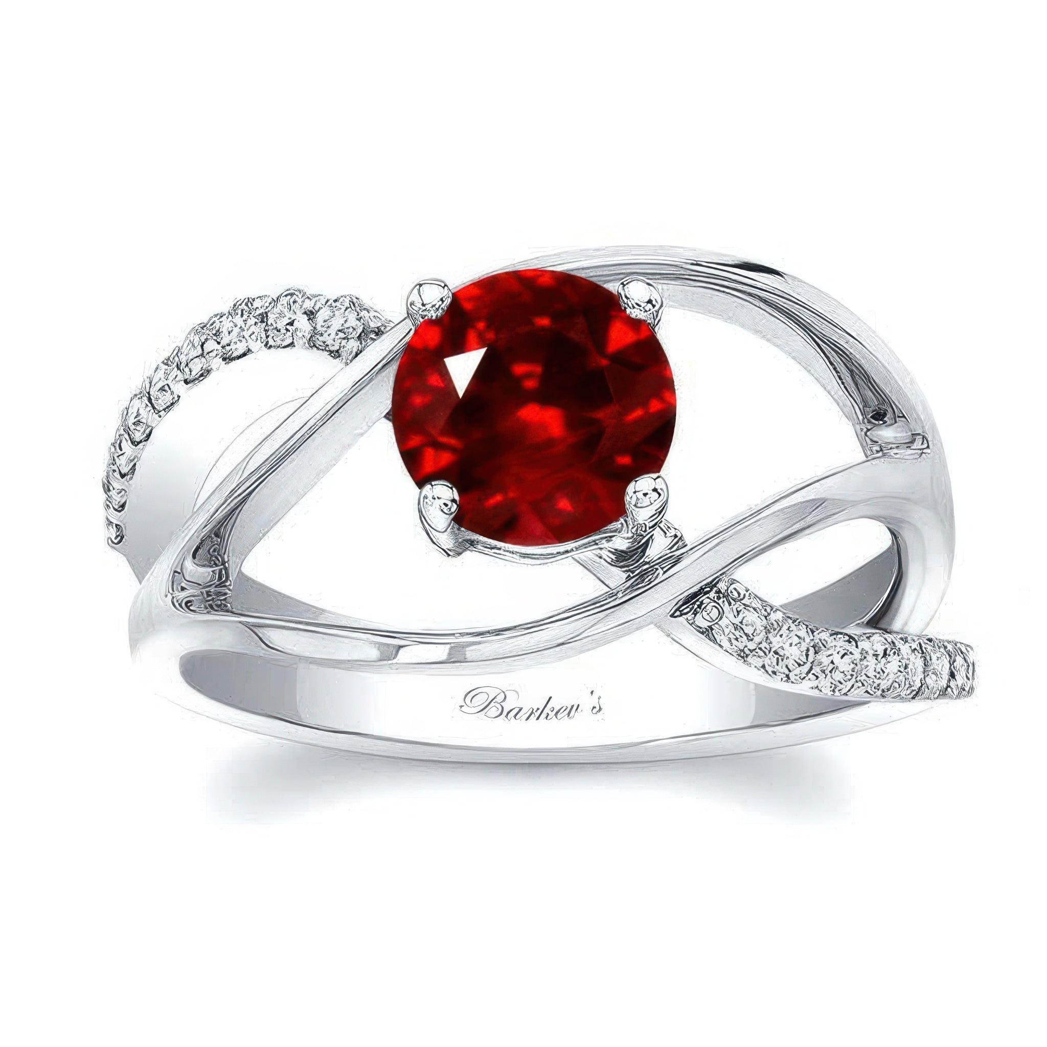 This open shank ruby and diamond ring features a prong set round center with shared prong set diamond accents while two high polished ridges curve around the middle on each side for an elegant touch of glam.