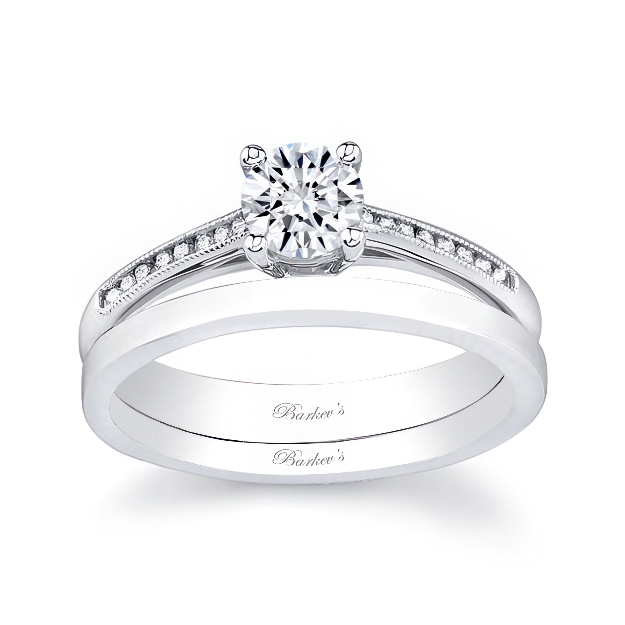 This round moissanite wedding set features a prong set round center with channel set diamonds running down the shoulders and a milgrain finish. Comes with a matching plain wedding band.