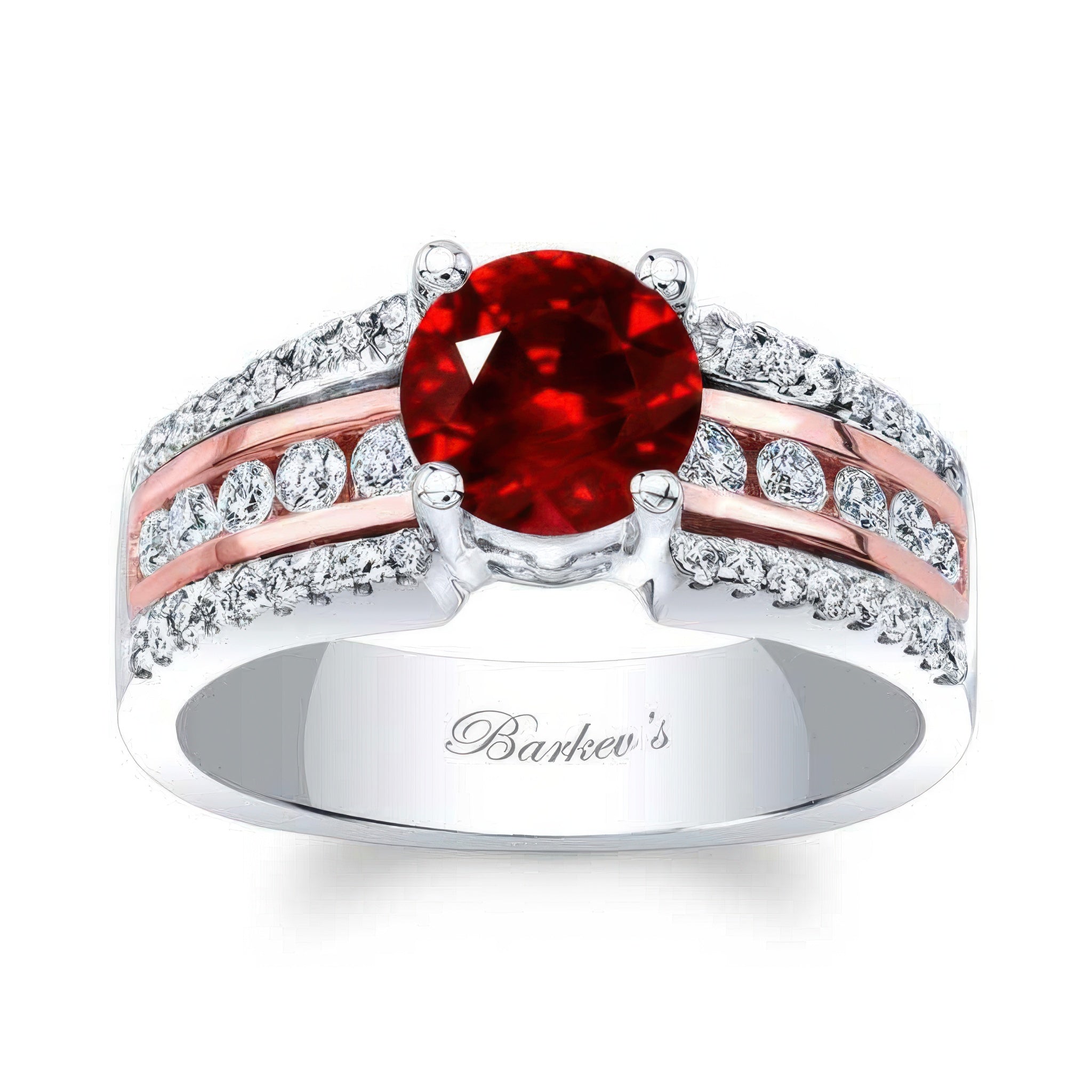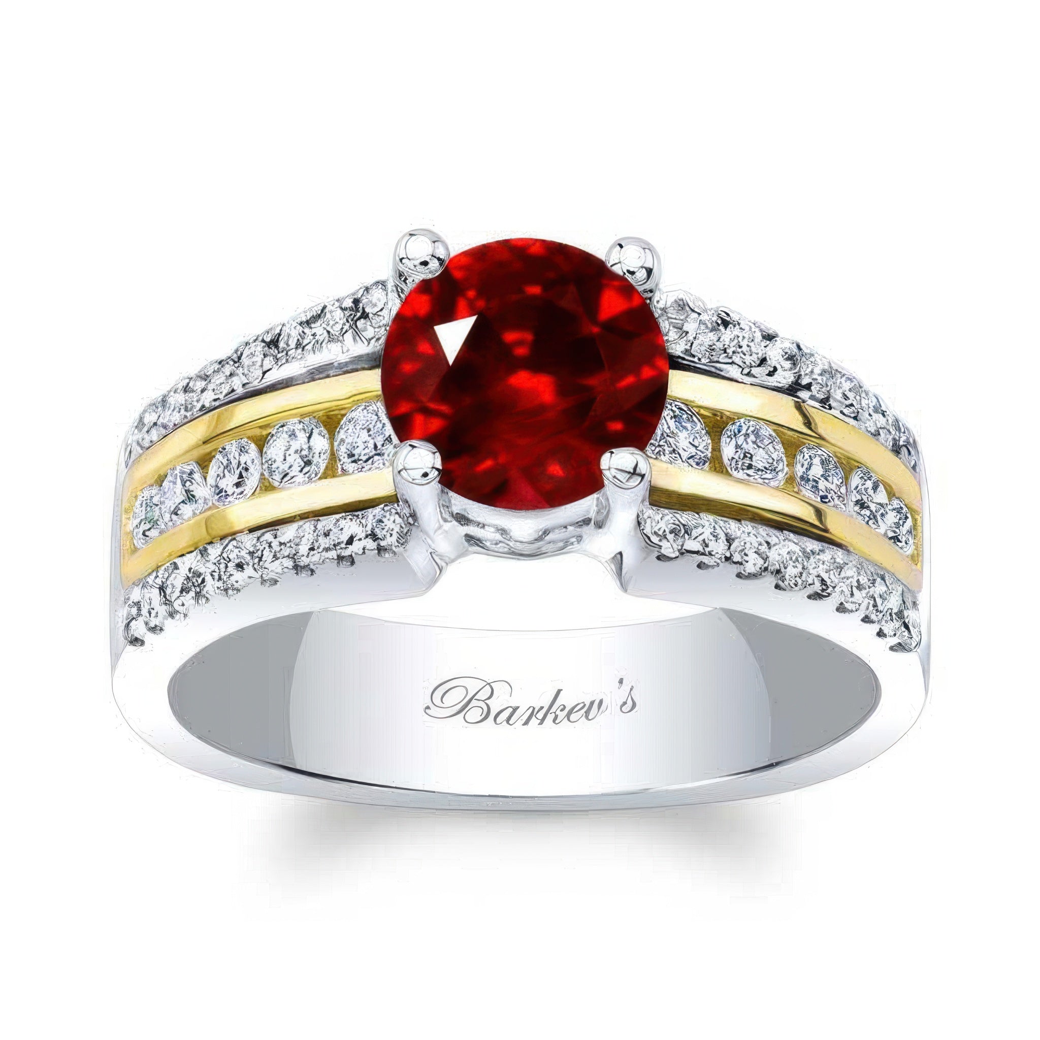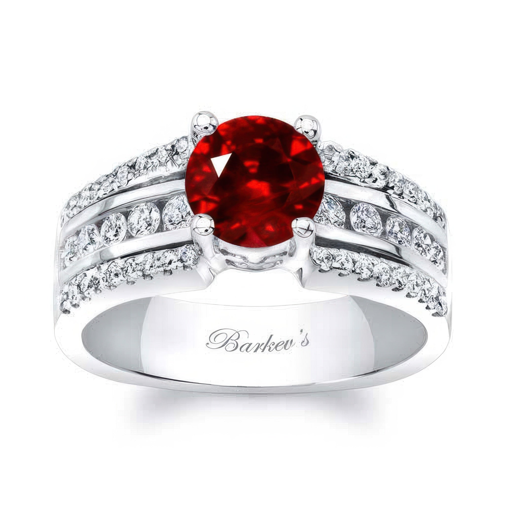 Romance is in the air with this round ruby and diamond channel set engagement ring featuring a prong set round center with three rows of diamonds cascading down the shoulders with the center row being channel set for an updated traditional look.