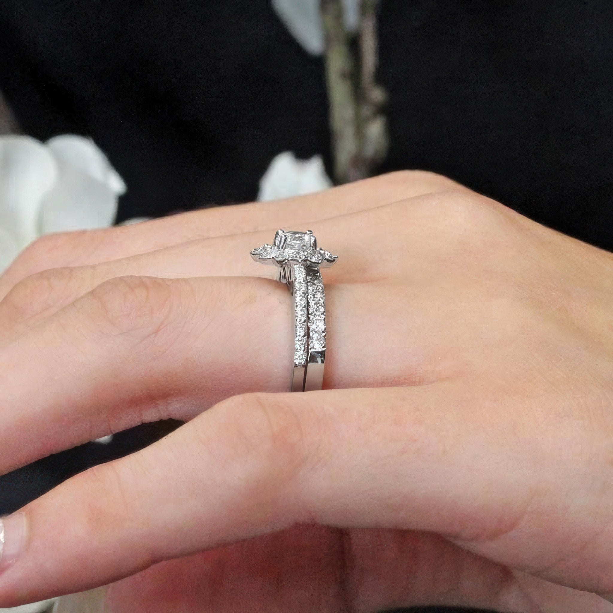 This starnish halo moissanite bridal set features our exclusive star design with a prong set round center encircled in a starburst halo of diamonds and shared prong set diamonds cascading down the shoulders. Comes with a matching wedding band.