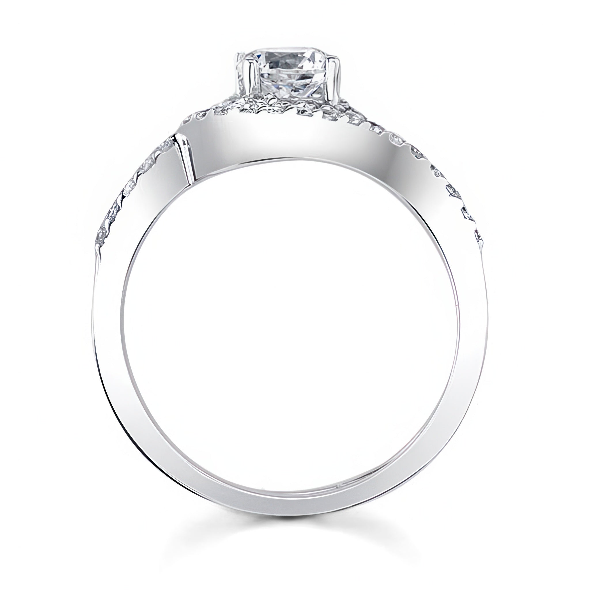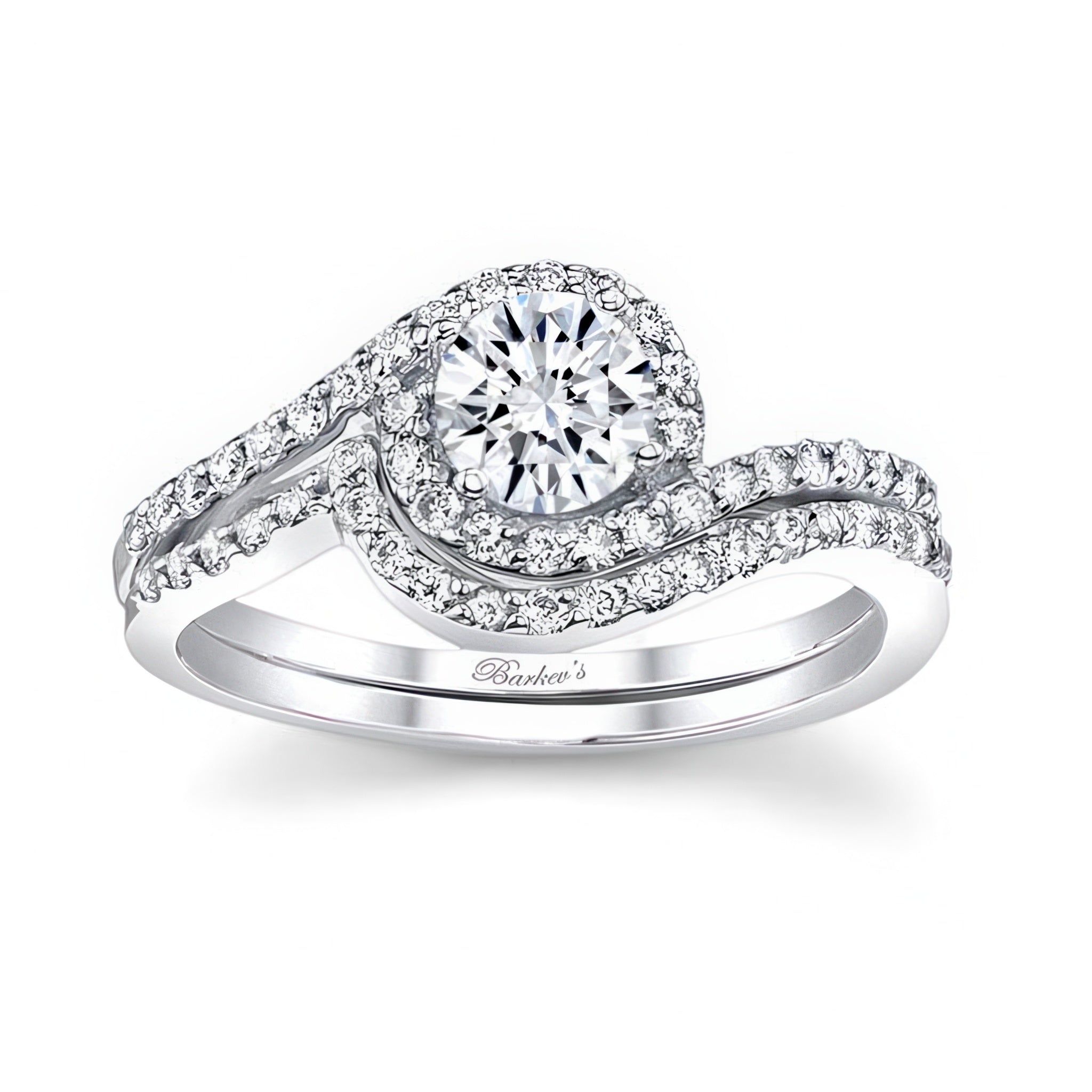 This swirl moissanite wedding ring set features a prong set round center while shared prong set diamonds swirl around and cascade down the shoulders. Comes with a matching diamond wedding band.
