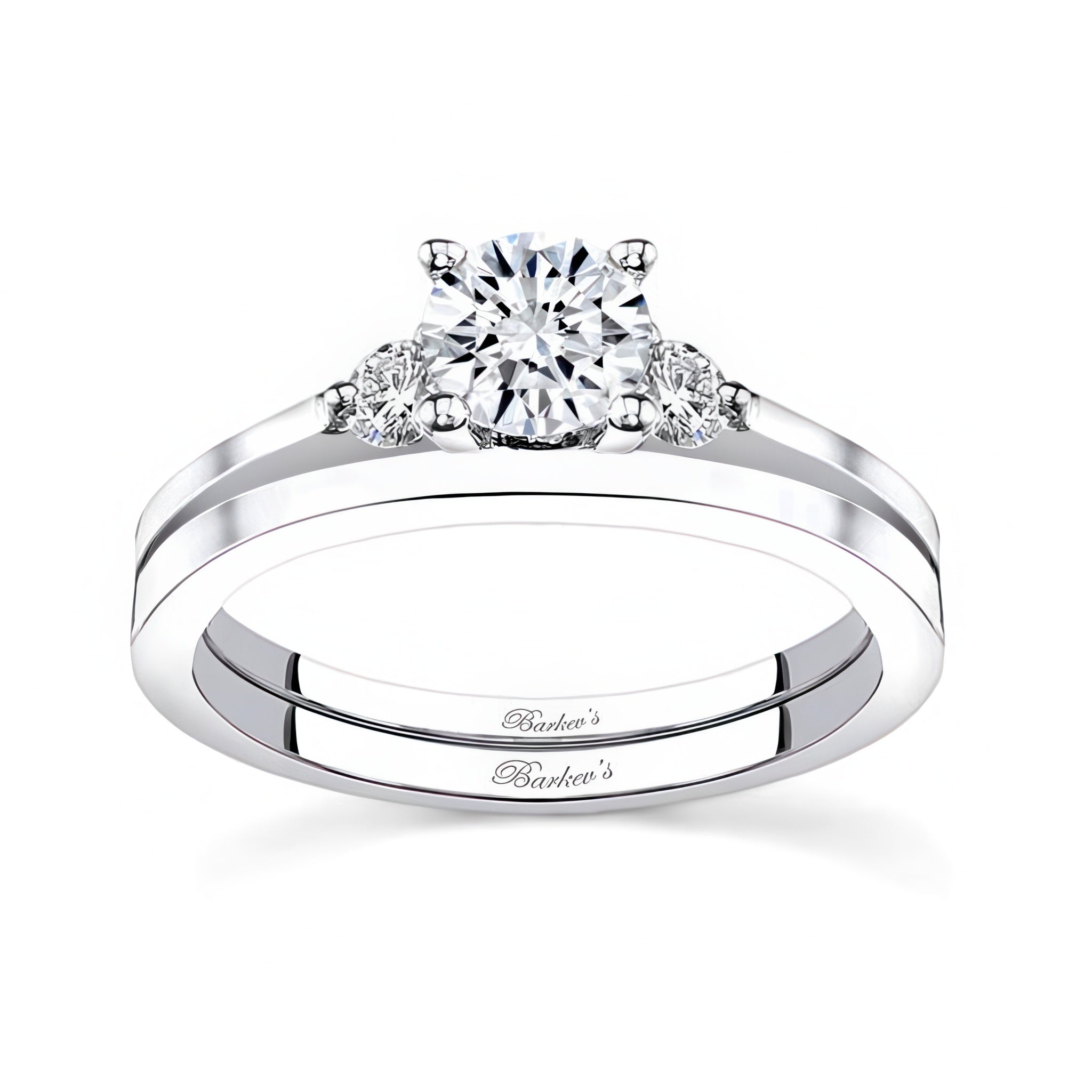 This three stone moissanite wedding set features a prong set round center with flanking diamonds on the sides and a narrow plain wedding band for a sophisticated look.