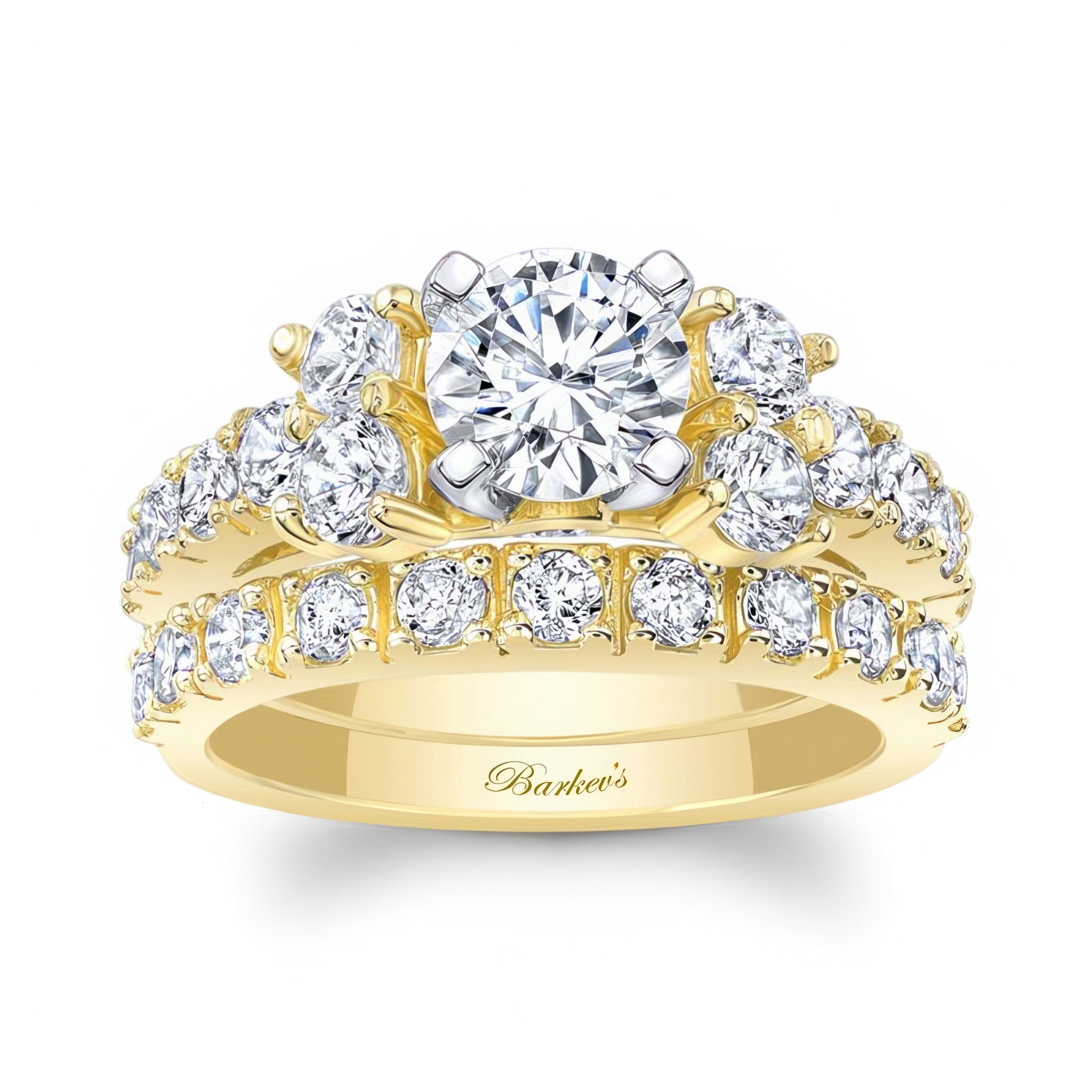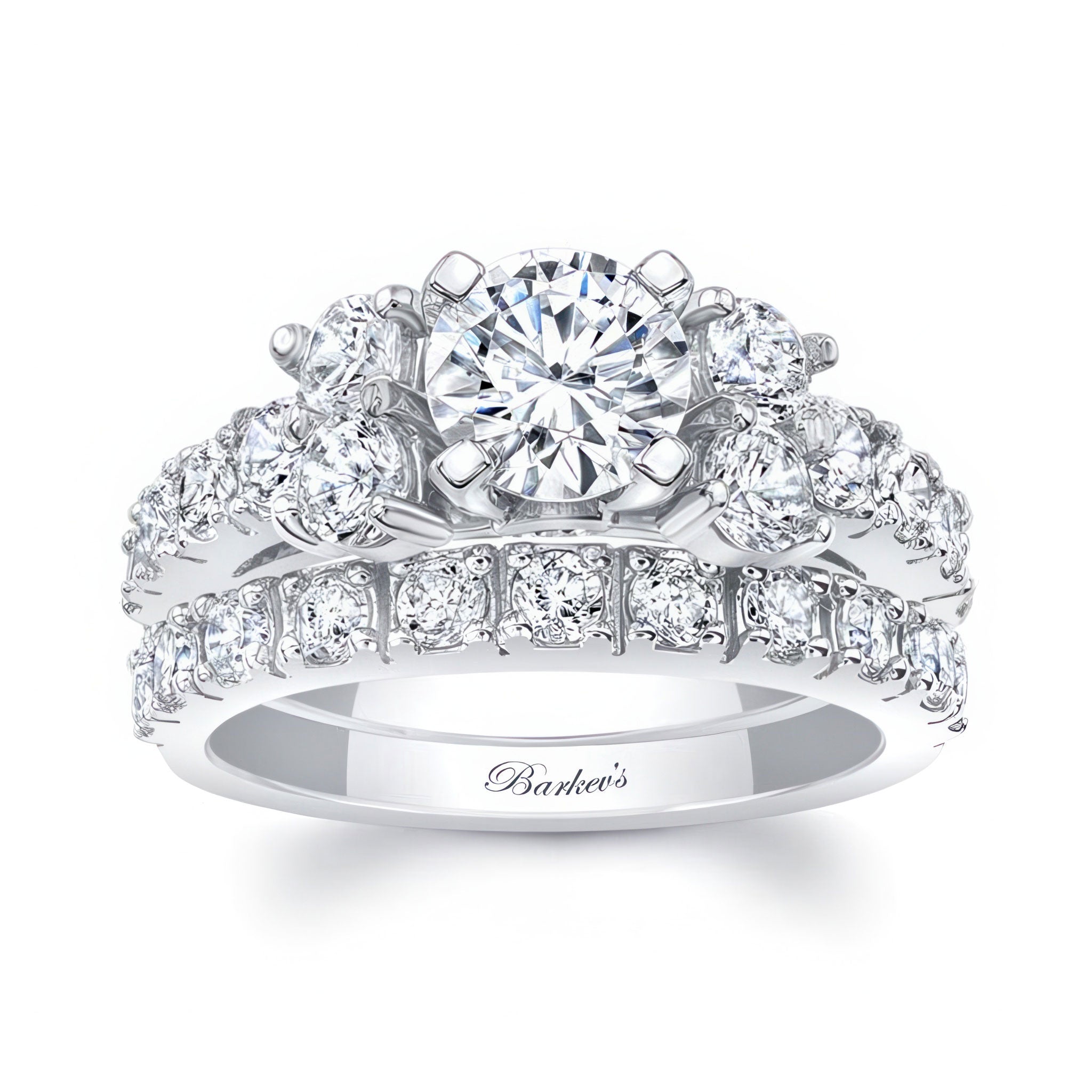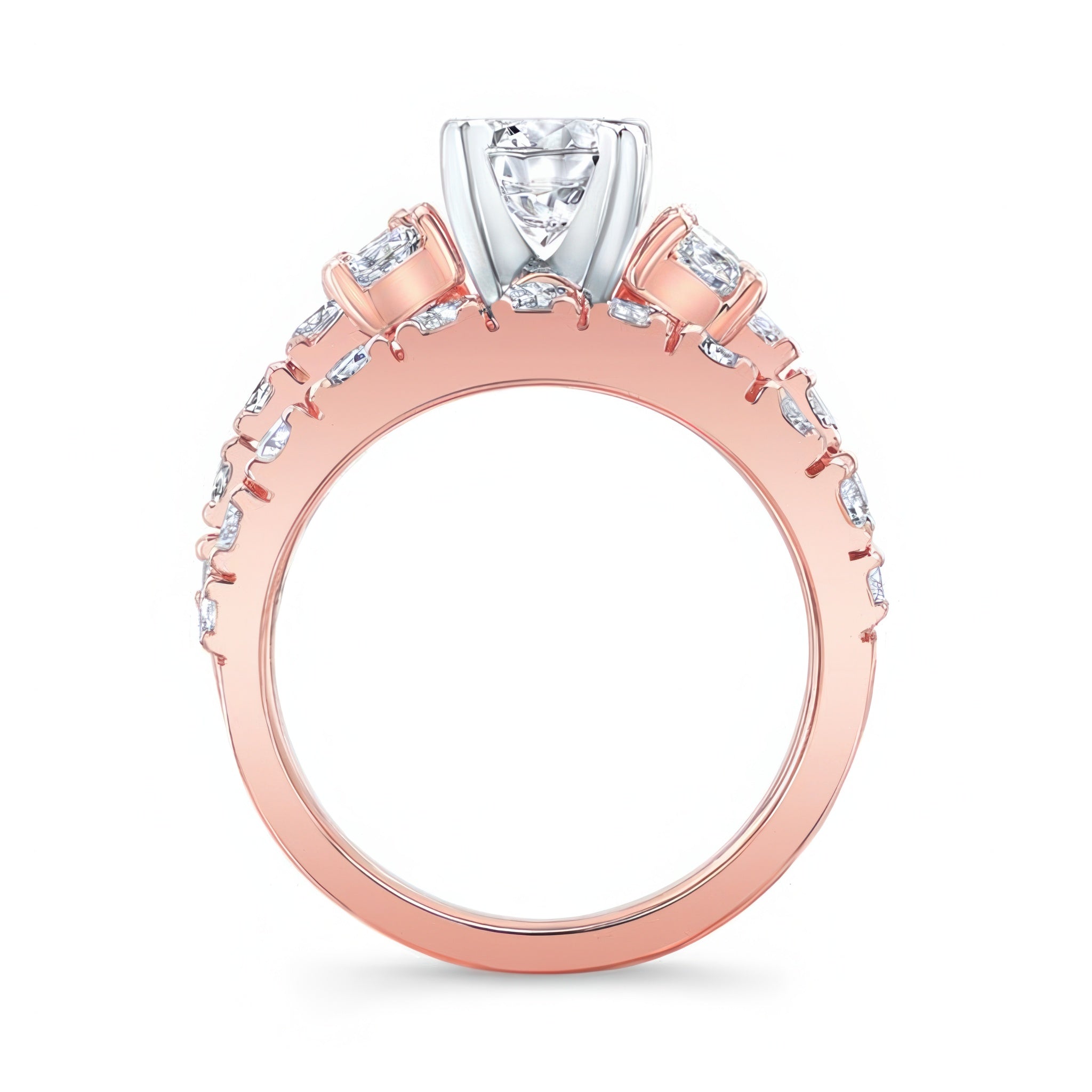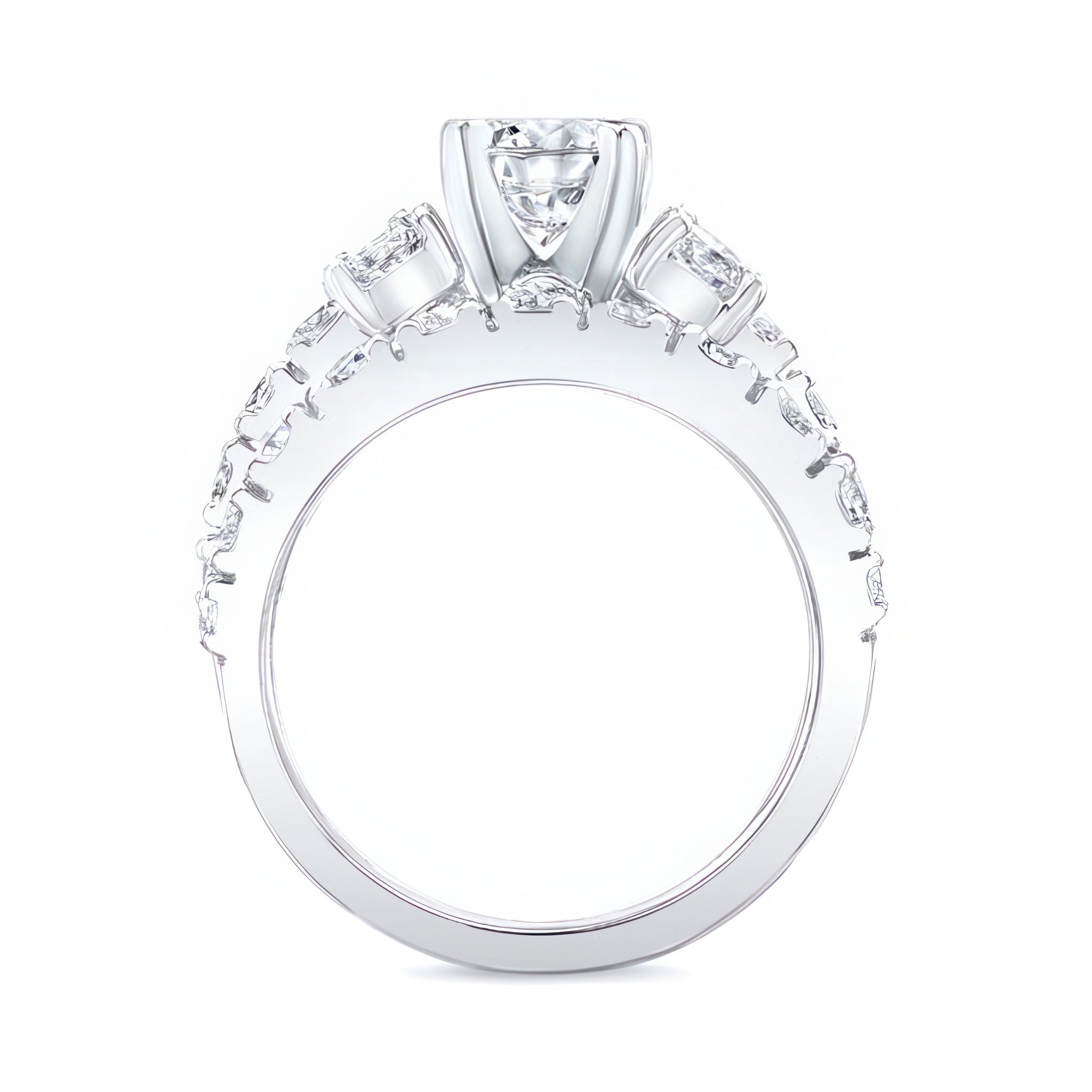 An elegantly unique moissanite diamond bridal set featuring a round center that's framed by two smaller diamonds on each side while other melees continue along the shank gradually decreasing in size. The profile view also features a surprise bezel set diamond for a truly stunning look. Comes with a matching wedding band.
