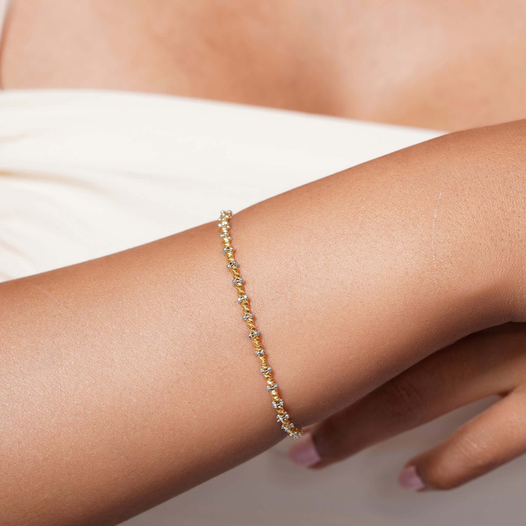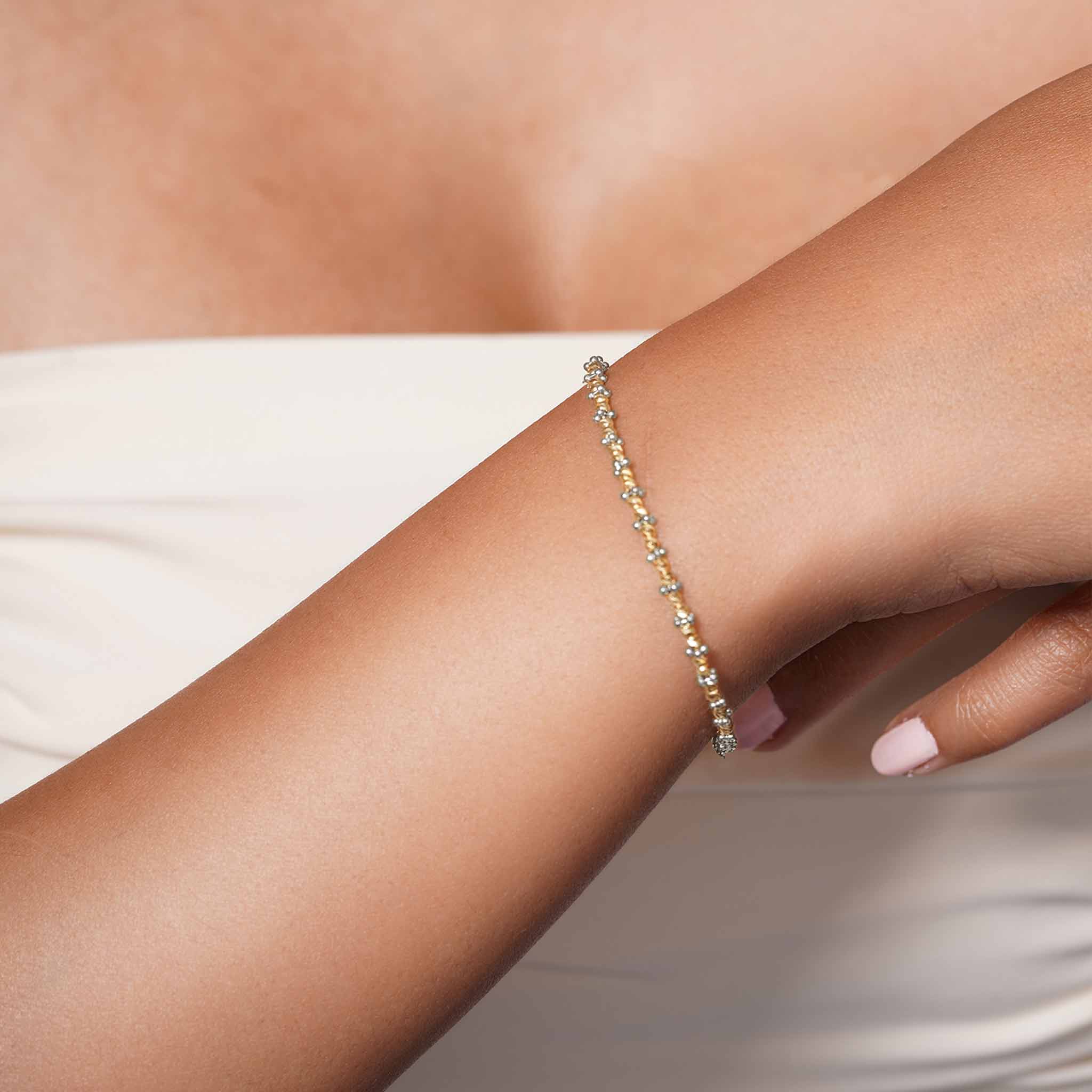Available in yellow or two-tone yellow-and-white gold, this bracelet complements the matching necklace and earrings, creating a sparkling ensemble that’s perfect for both casual days and special occasions.