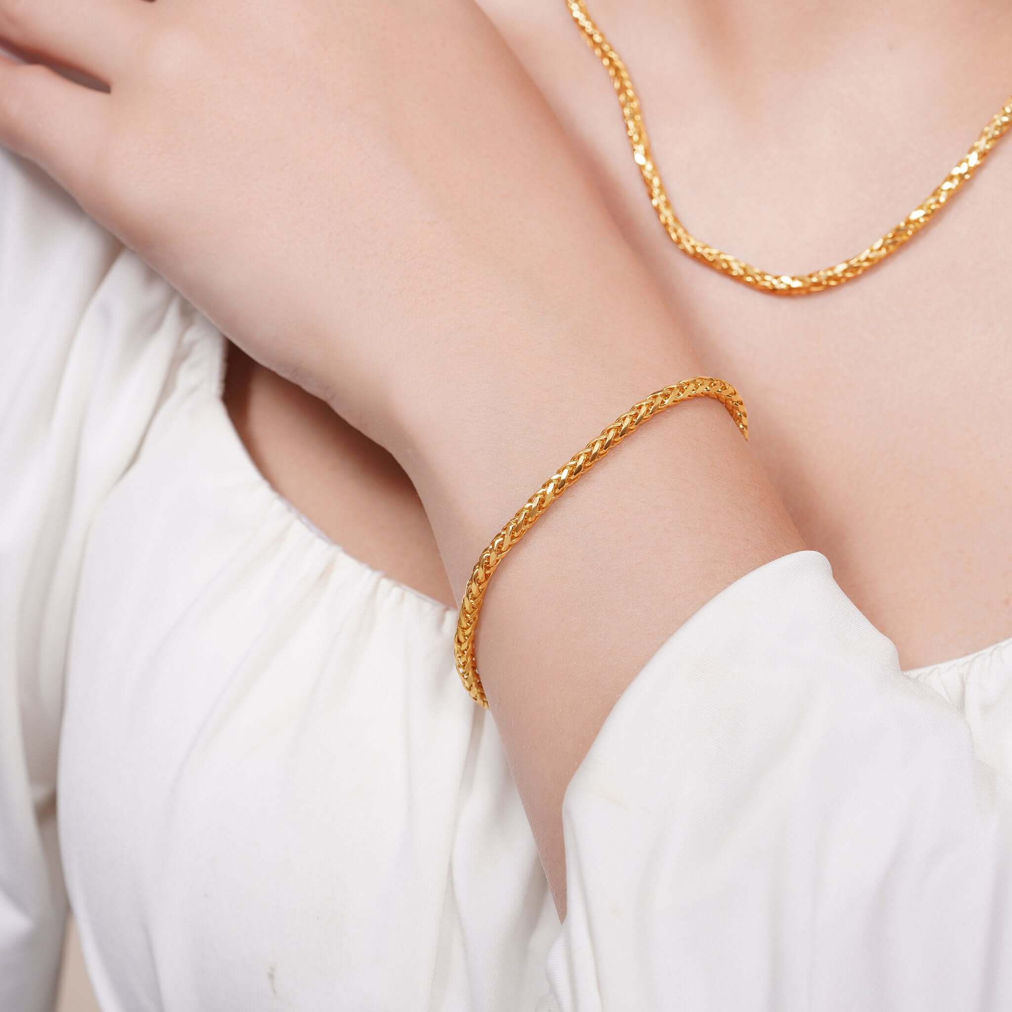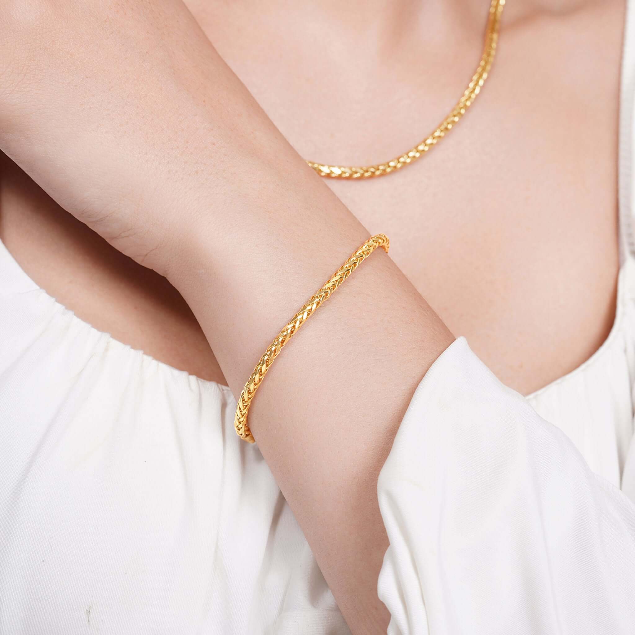 This Lightweight Wheat Gold Bracelet showcases a classic braided wheat design, offering a smooth, lightweight feel with built-in durability for daily wear.