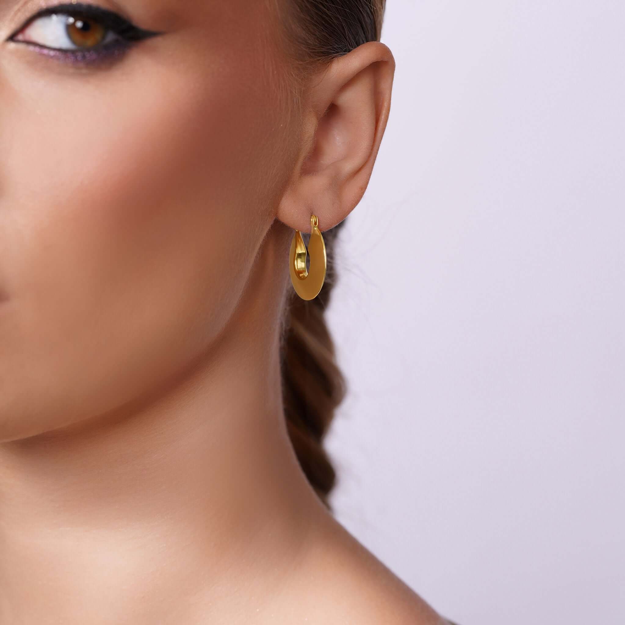 Crafted in 14k gold, our Flat Disk Gold Hoop Earrings feature a wide, flat surface that reflects light with sharp, directional shine. The sleek, geometric profile sets them apart from traditional round hoops, offering a sculptural look that’s modern and bold