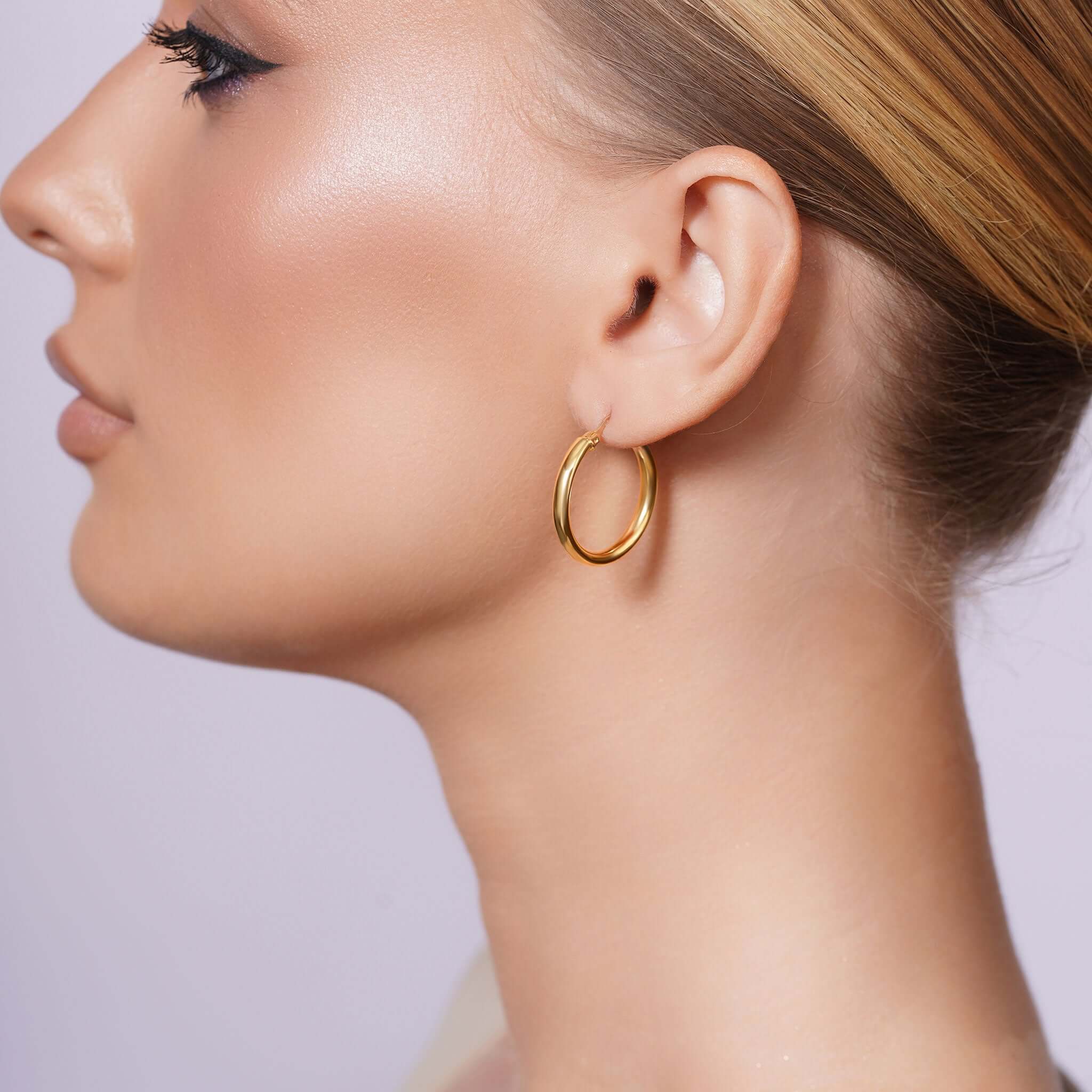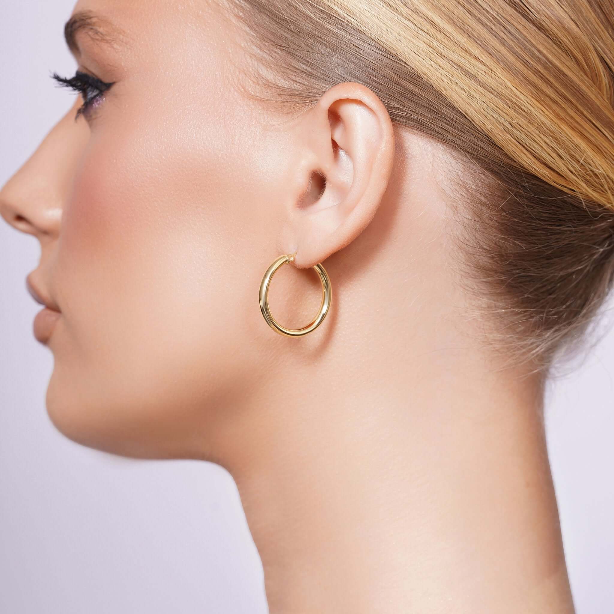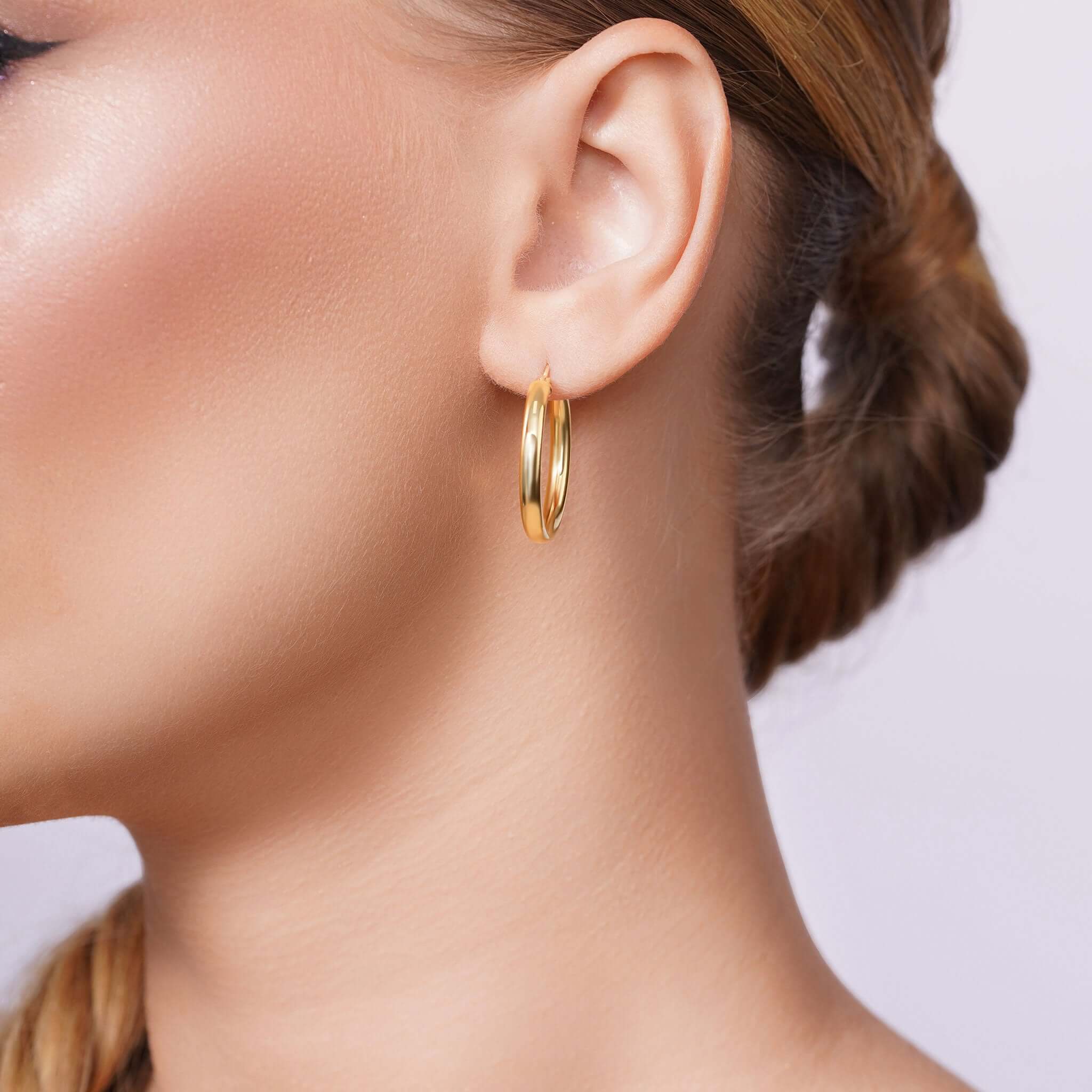Their smooth, 3mm width polished surface reflects light with a soft, warm glow, making them the kind of piece that elevates everything you wear. The round silhouette flatters all face shapes, while the sleek profile adds just the right amount of presence without feeling heavy or overdone.