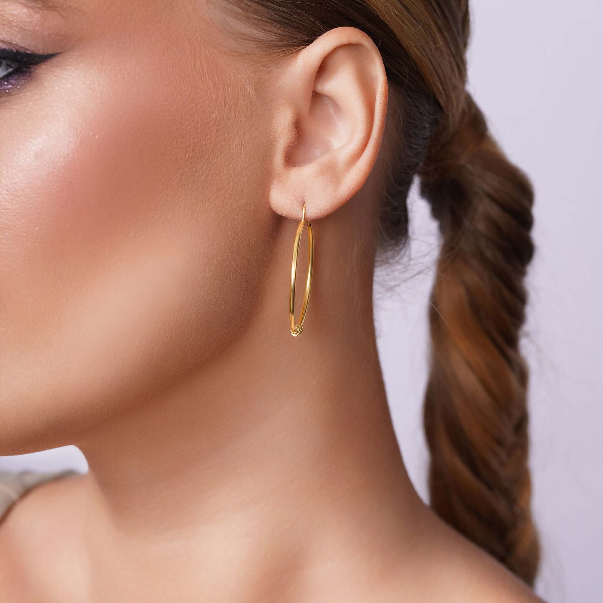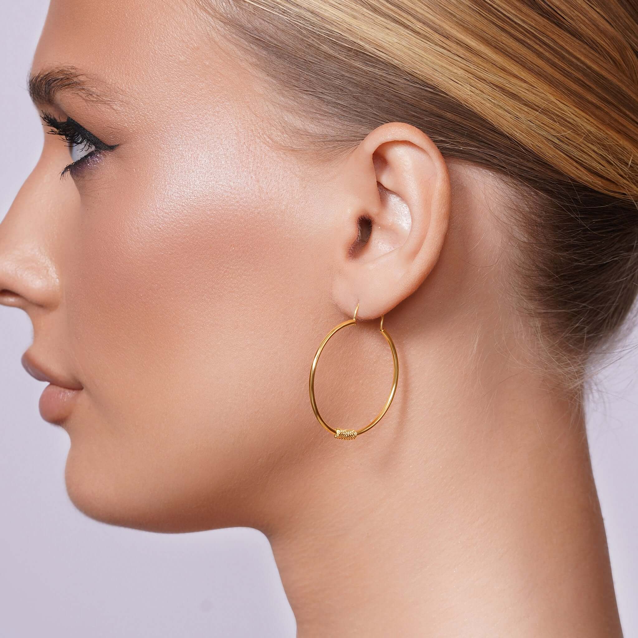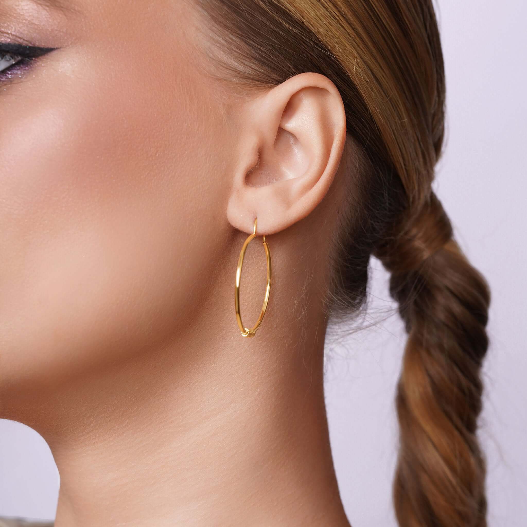 What sets these hoops apart is the innovative endless closure, carefully bent to hug the natural contours of the ear. This design subtly tucks the hoop just beneath the earlobe, offering a sleek silhouette that feels both secure and effortlessly modern.