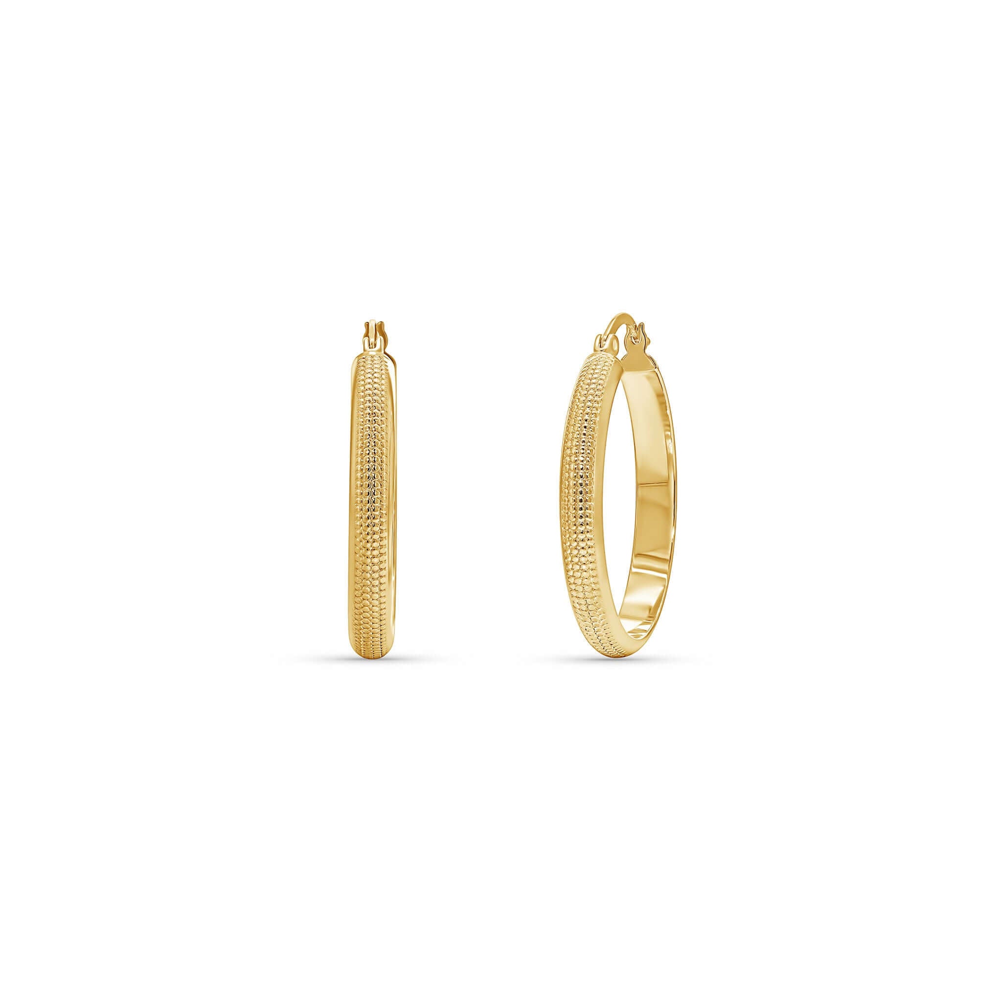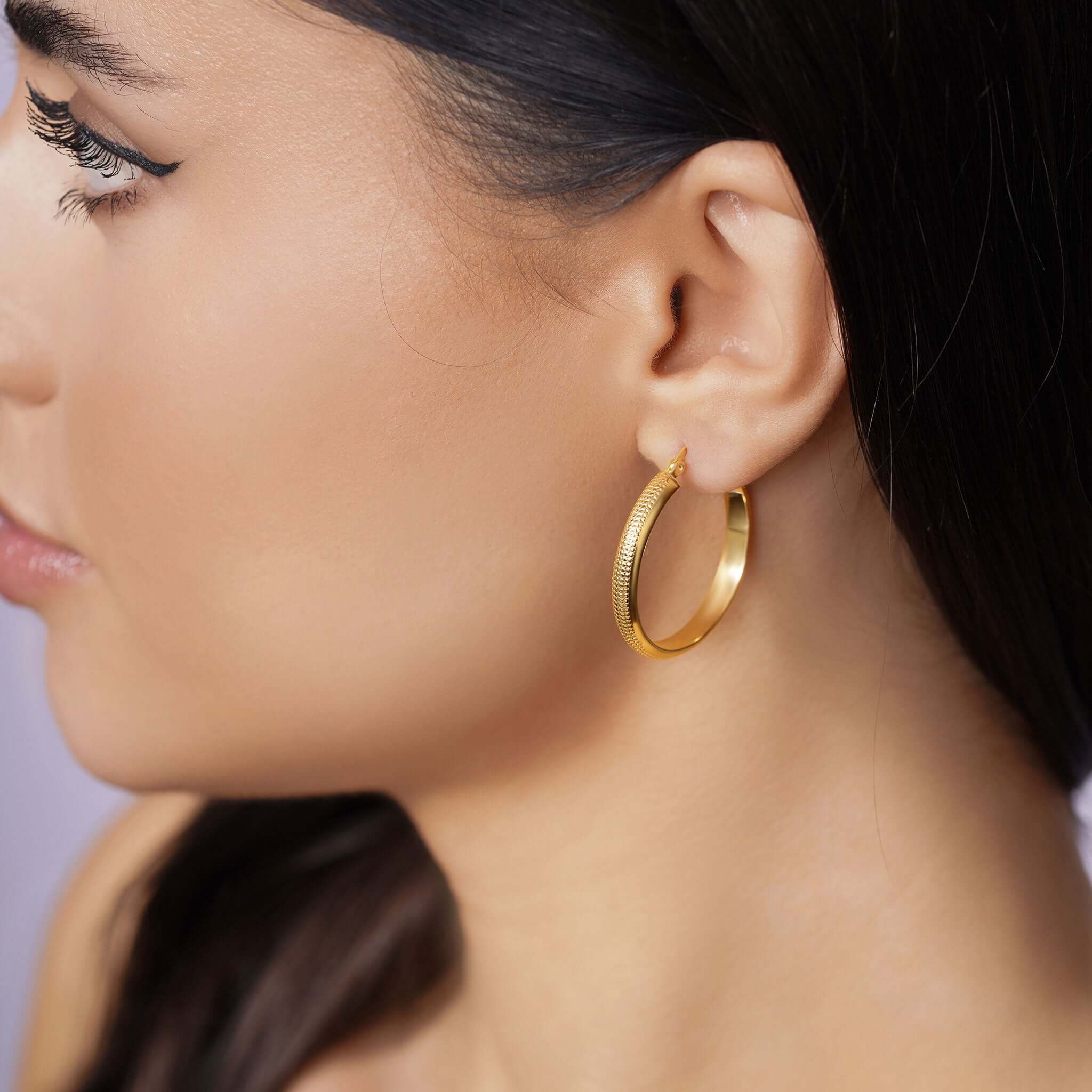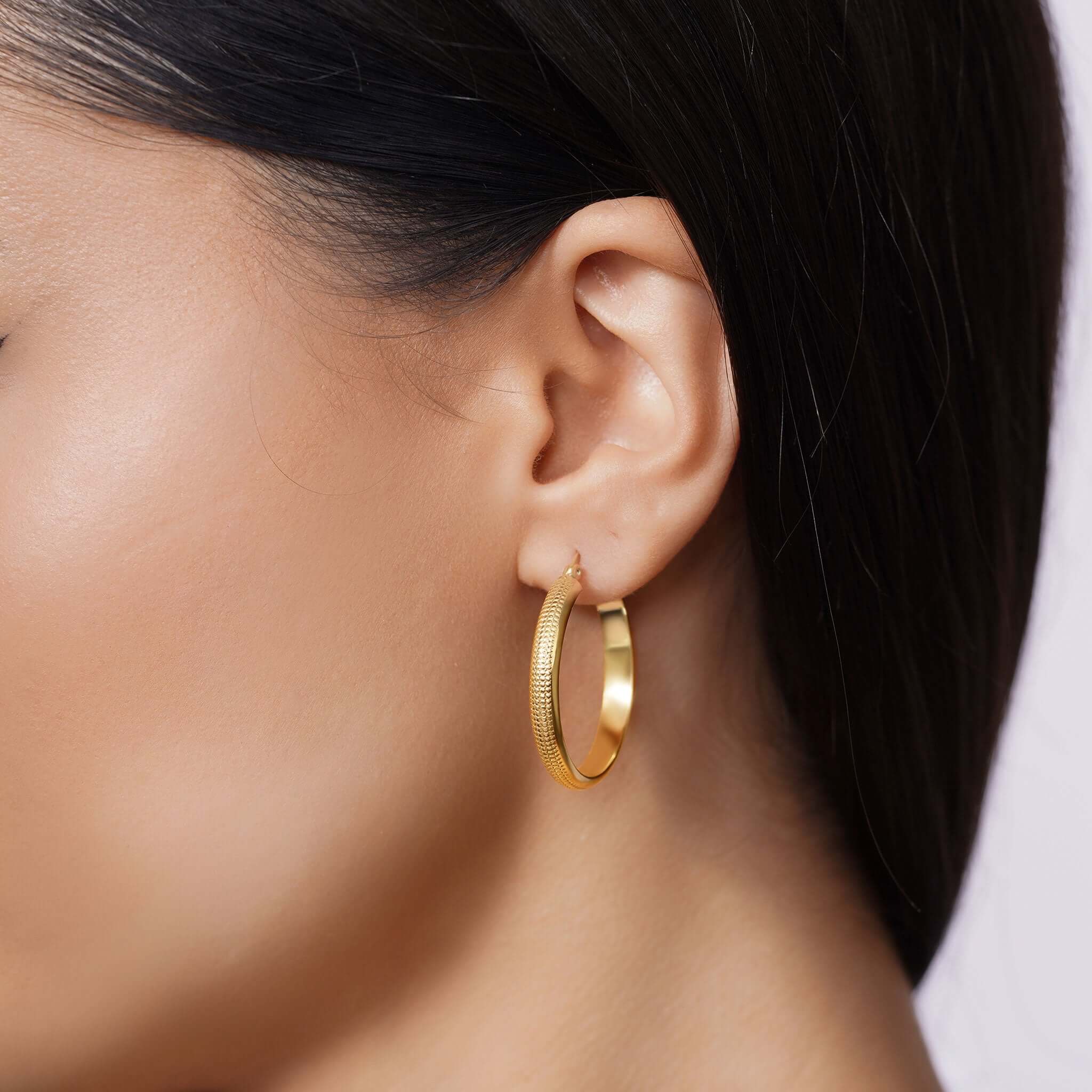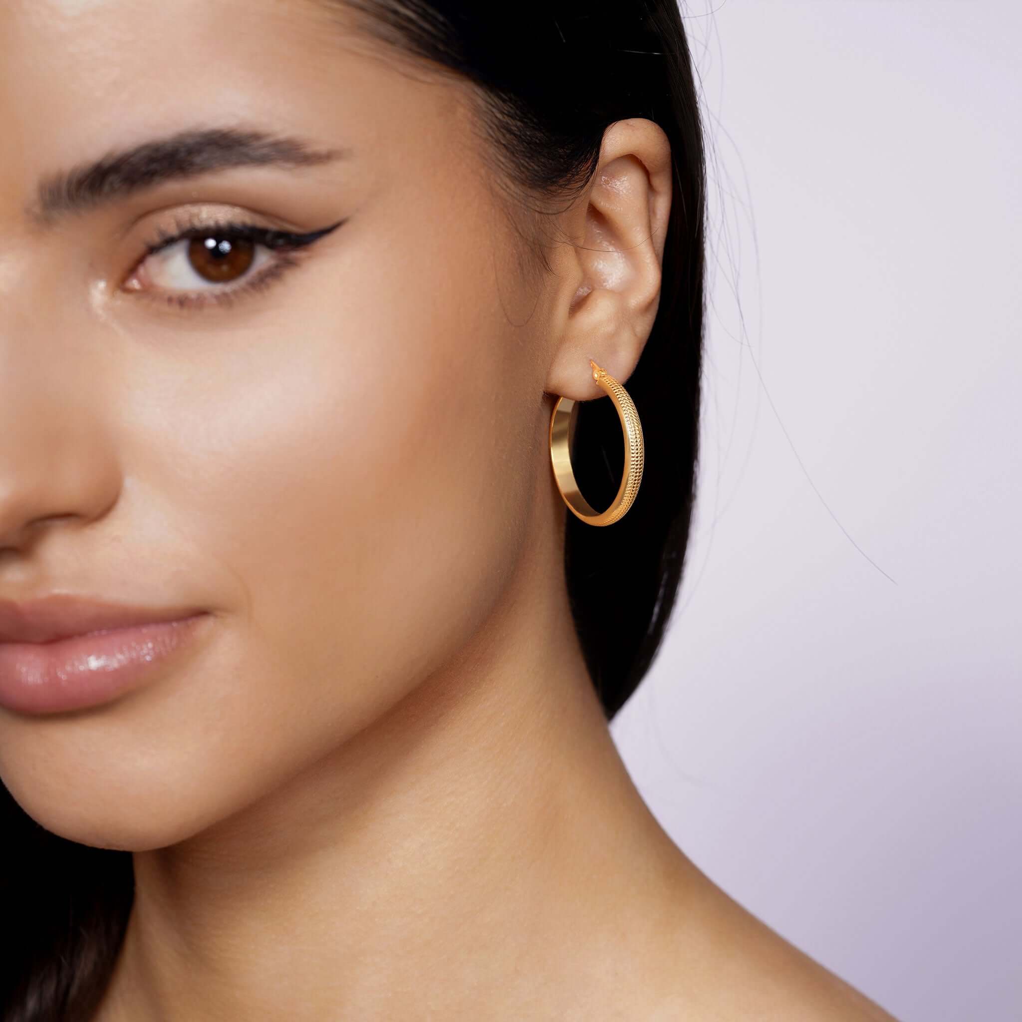 The tactile texture adds a unique shimmer that catches the light from every angle, while the dome style creates soft curves that flatter every face shape. Crafted in durable 14K gold, they’re designed to last and shine for years to come.