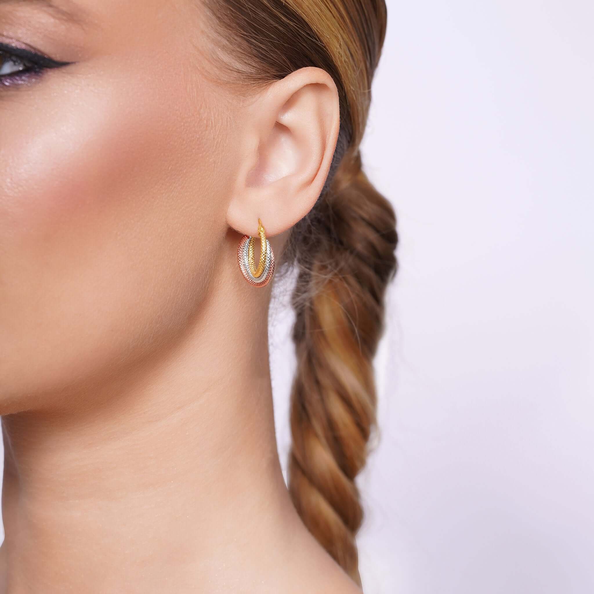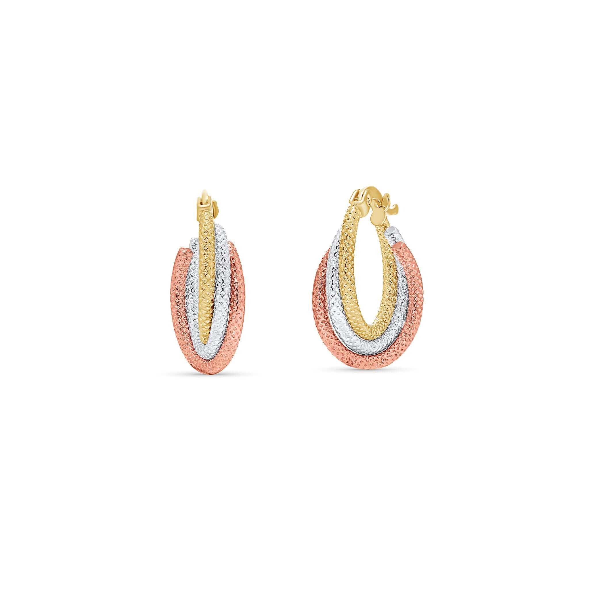 Three tones. One graceful motion. Our Tri Color Gold Overlapping Hoop Earrings bring harmony to your jewelry collection with round, textured hoops in perfectly layered yellow, white, and rose gold. Each 14k gold hoop is delicately detailed with a fine texture that softly reflects light — creating depth without overpowering your look.