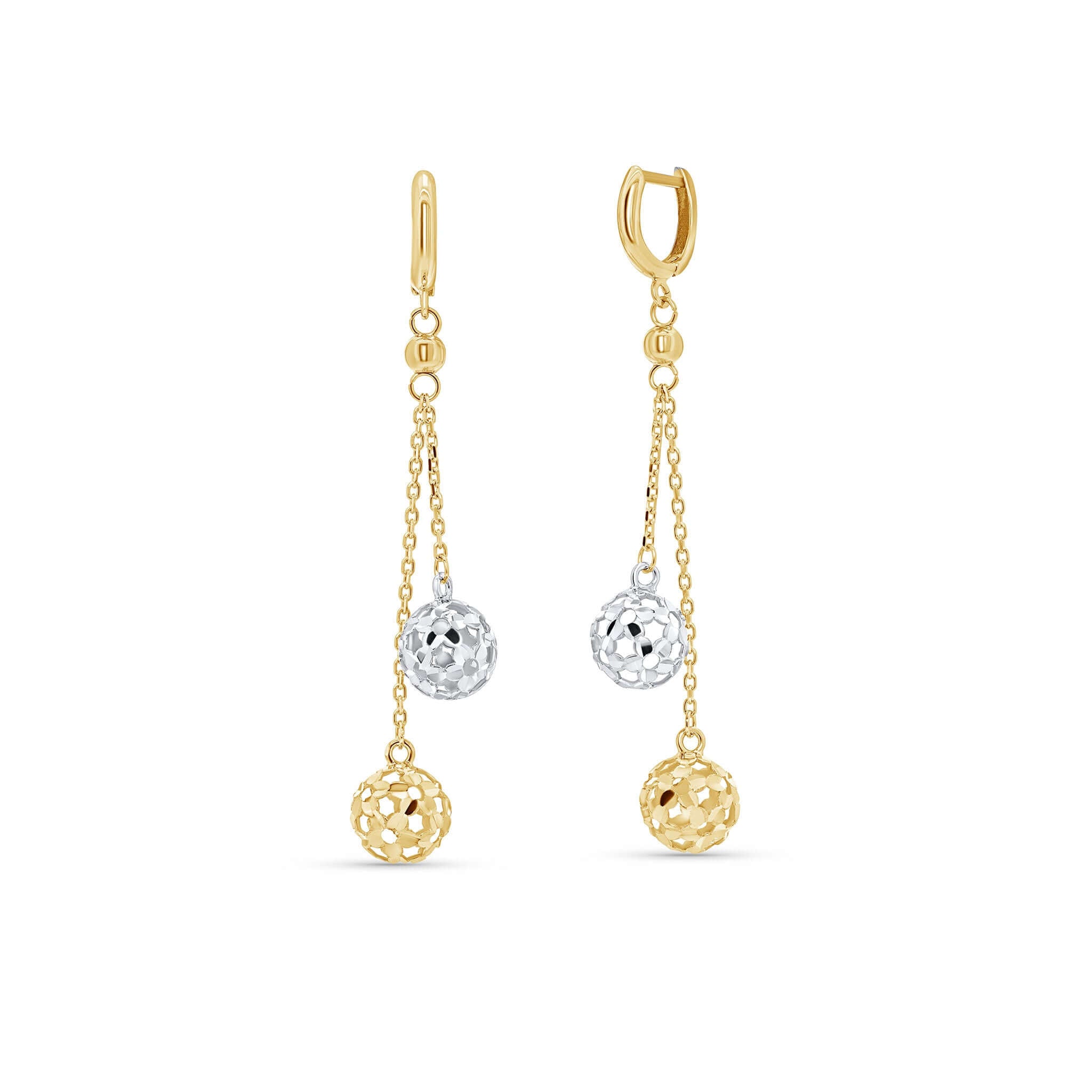Each ball gently sways from a polished 14k yellow gold chain, creating subtle movement that catches the eye. The contrast between the warm yellow gold and the cool white gold adds depth and dimension.