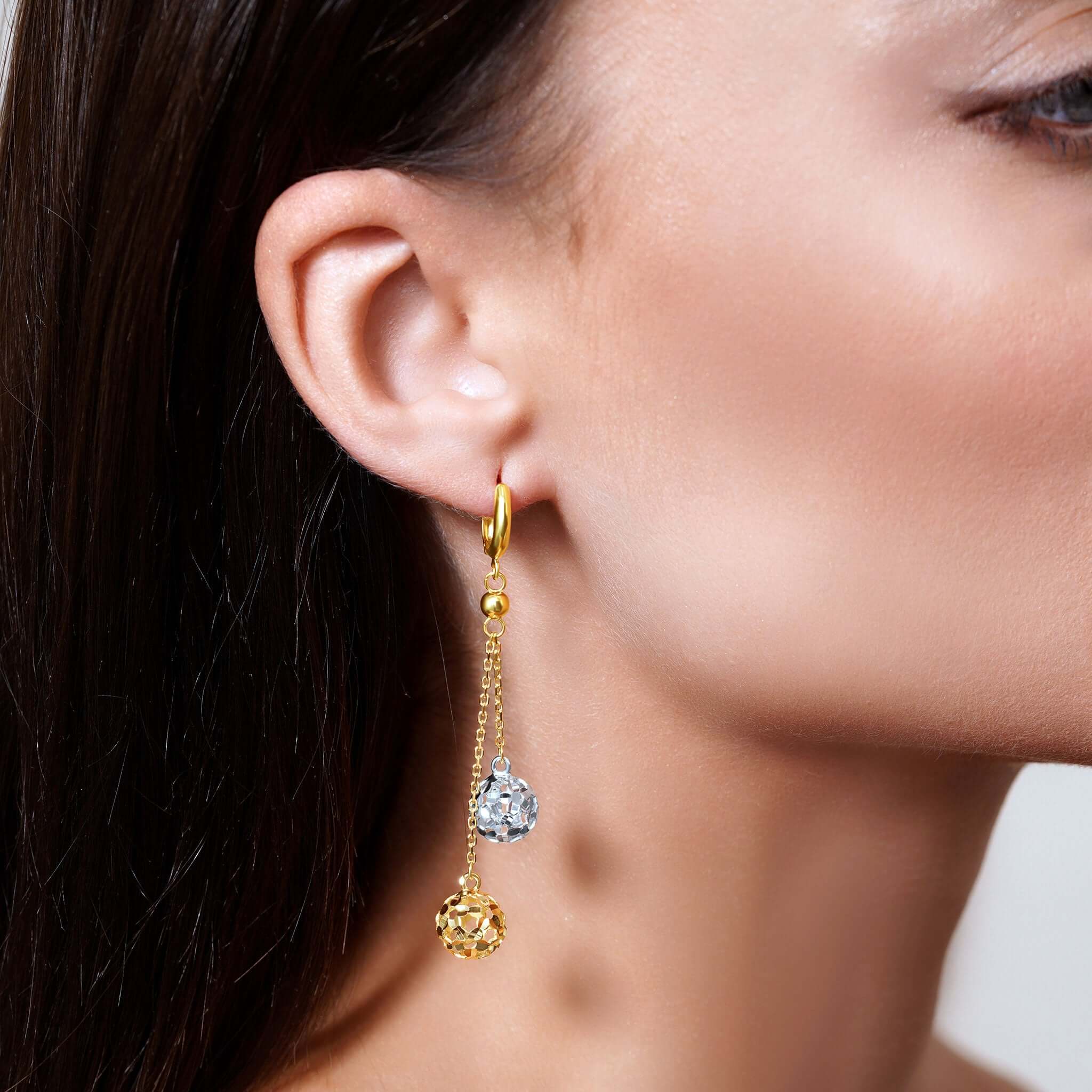 This Two Tone Dangle Ball Gold Earrings are all about lightness, movement, and intricate craftsmanship. Suspended from fine yellow gold chains, two hollow gold spheres — one in white gold, the other in yellow — feature delicate cutout flower patterns that bring an airy, floral texture to this elegant design.
