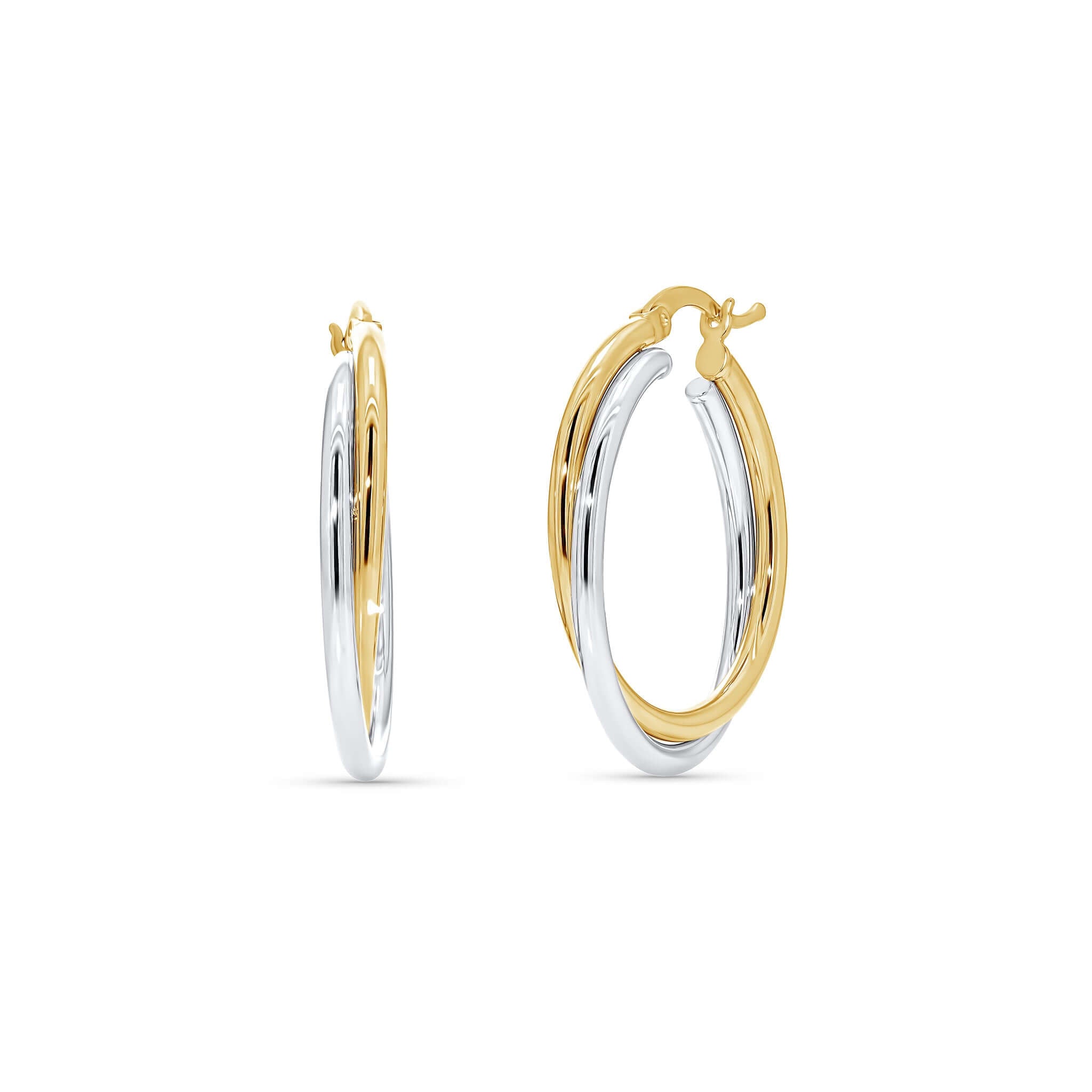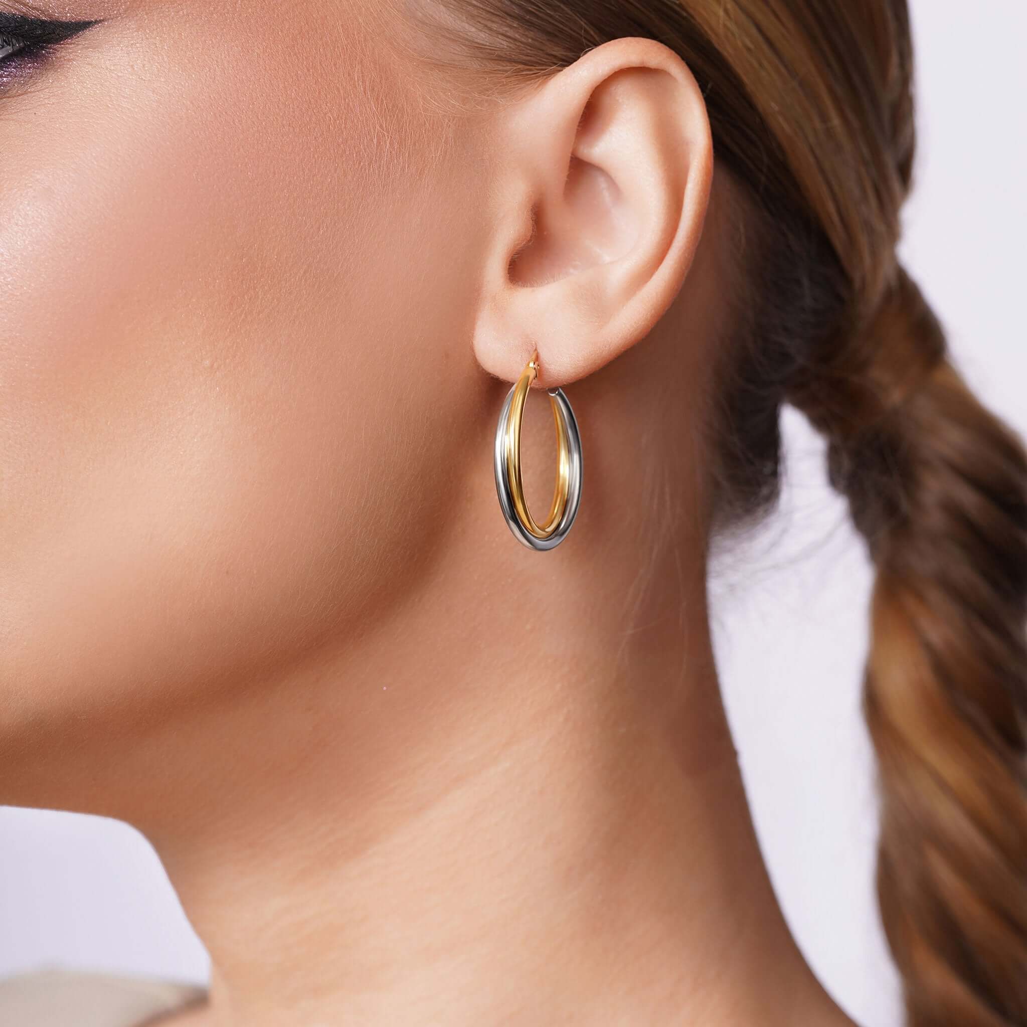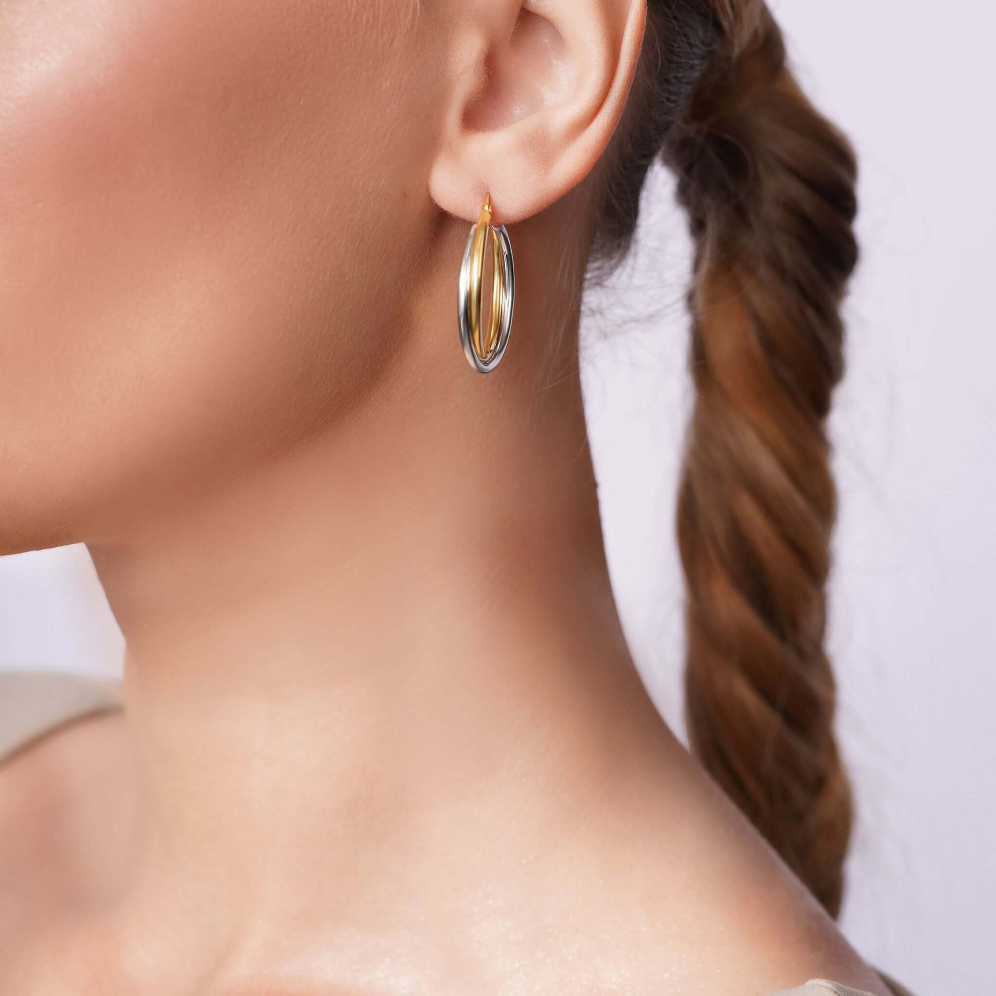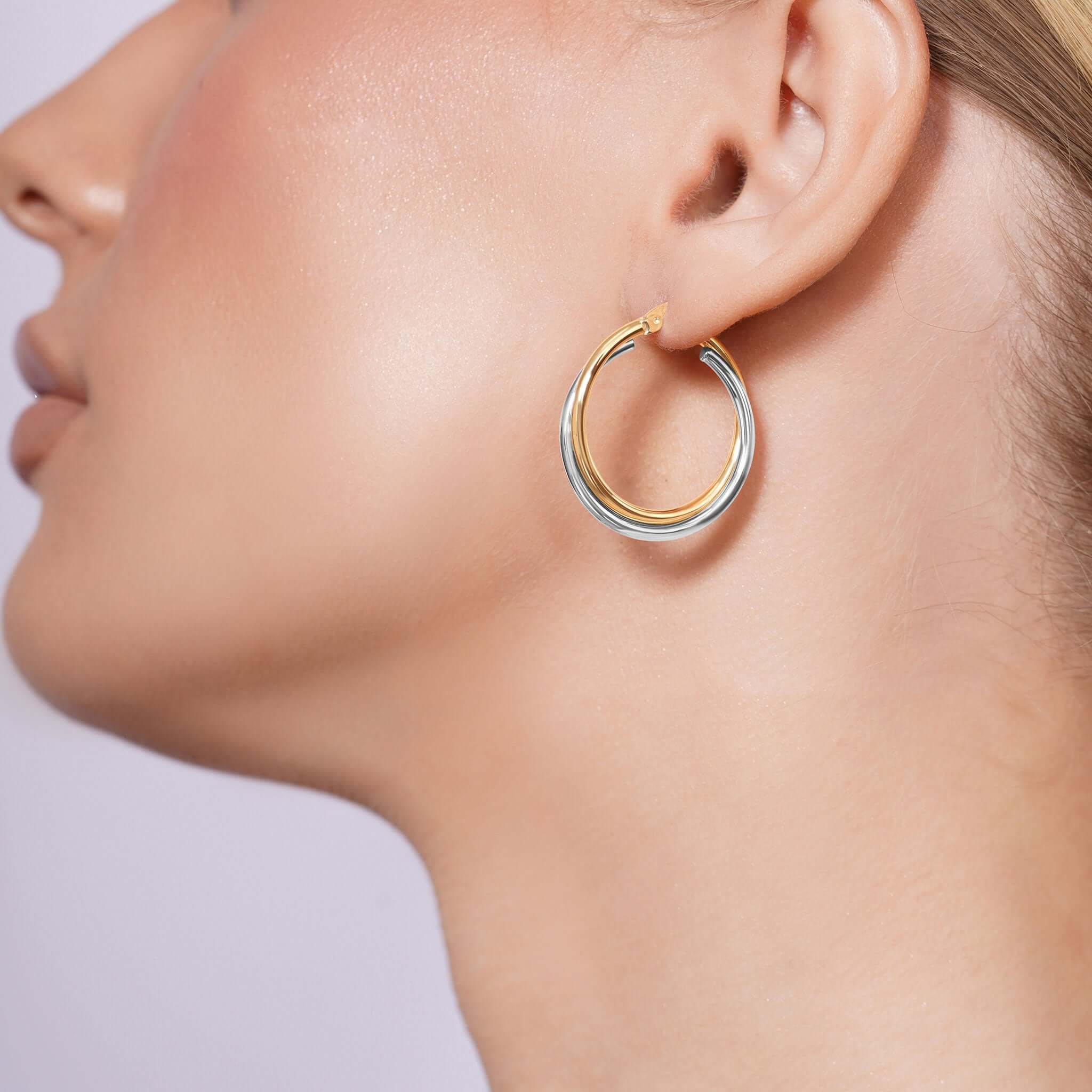 The Two Tone Double Hoop Gold Earrings features two interlocked hoops — one in radiant yellow gold, the other in sleek white gold — a design that creates a layered look in one seamless piece.