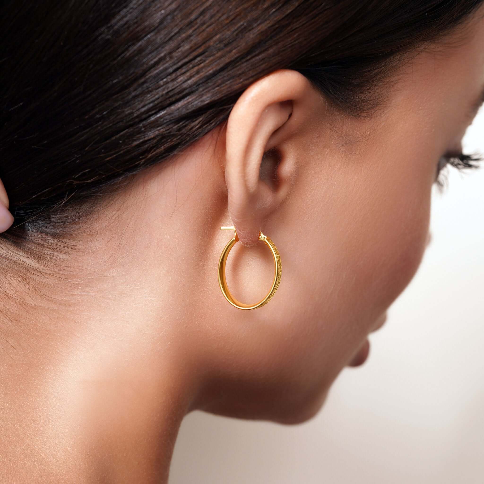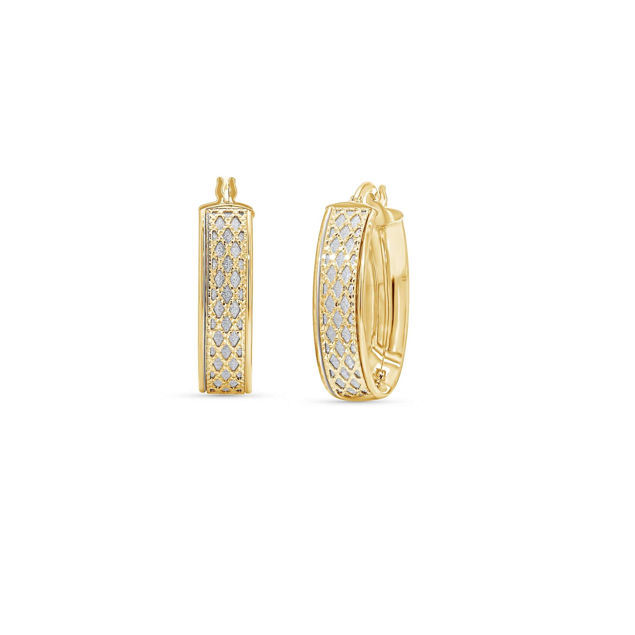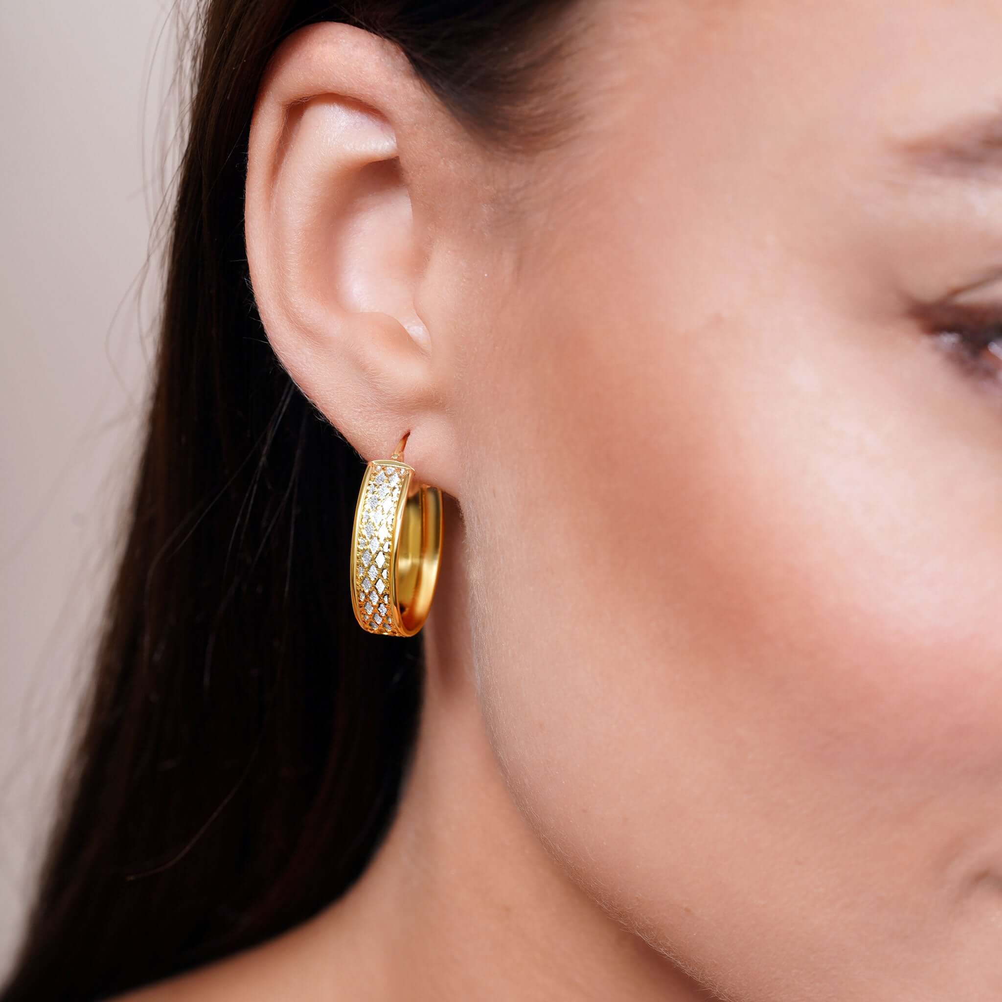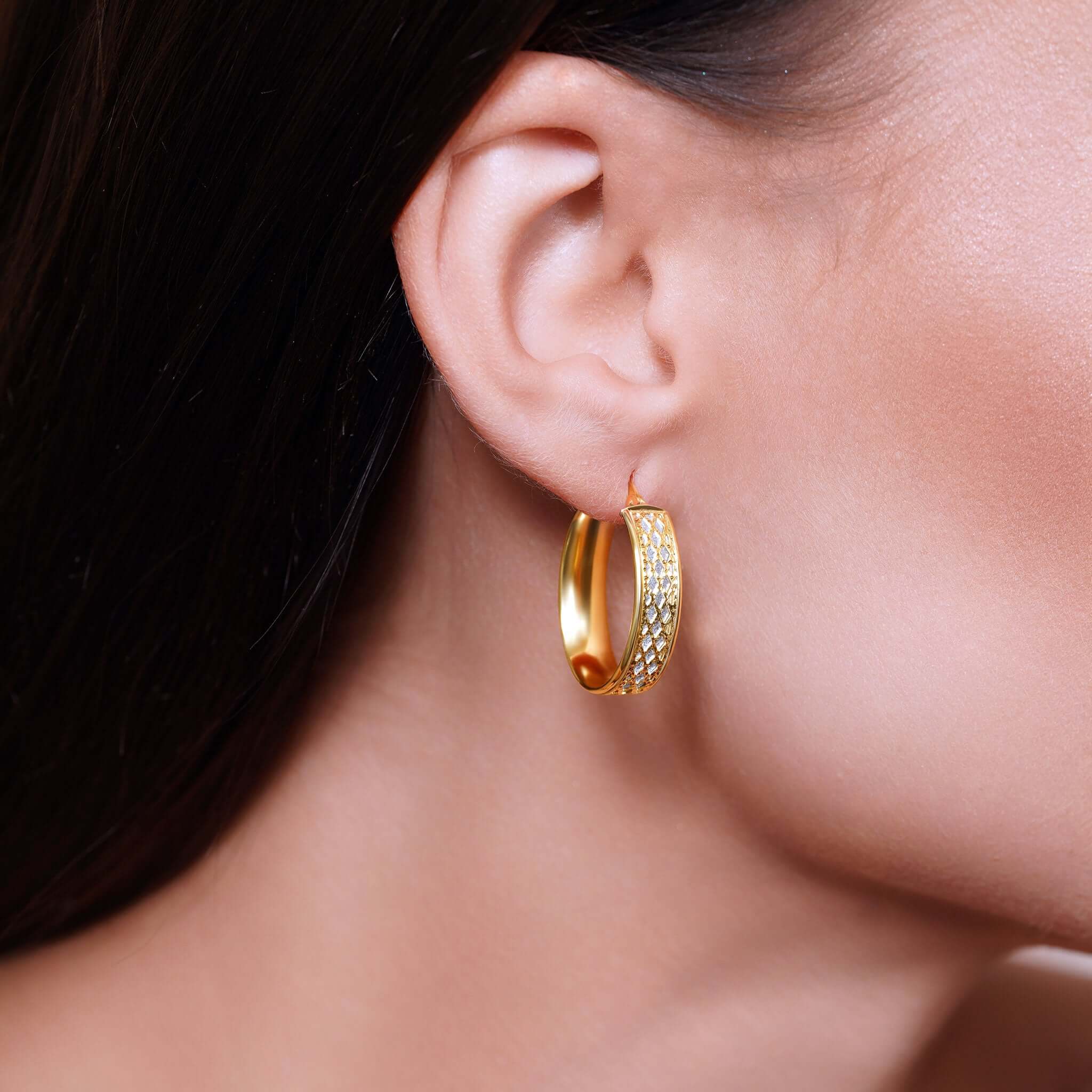 A criss-cross of light and texture — these Two Tone Textured Oval Gold Earrings bring a unique mix of pattern, shine, and shape to your jewelry collection. Made in 14k gold, these earrings feature a bold oval silhouette with a flat, wide surface measuring 0.71 inches.