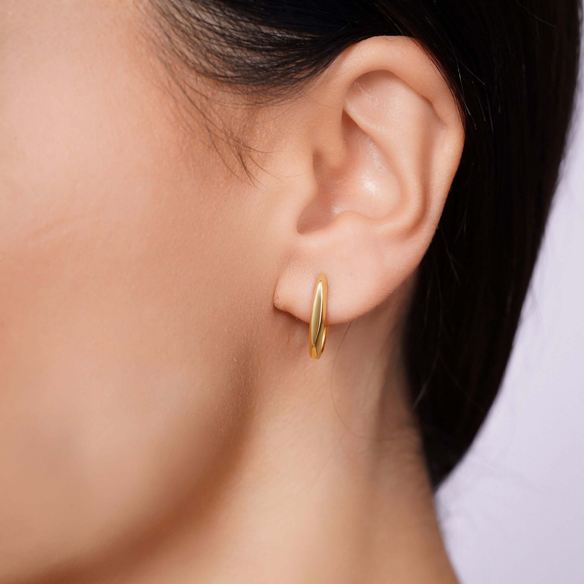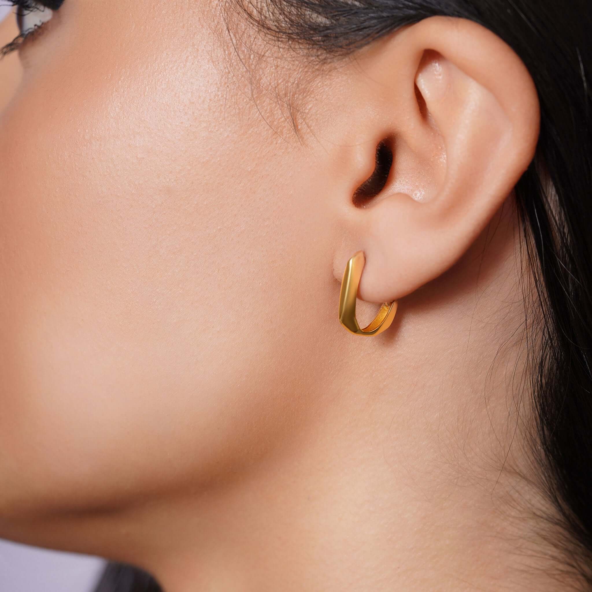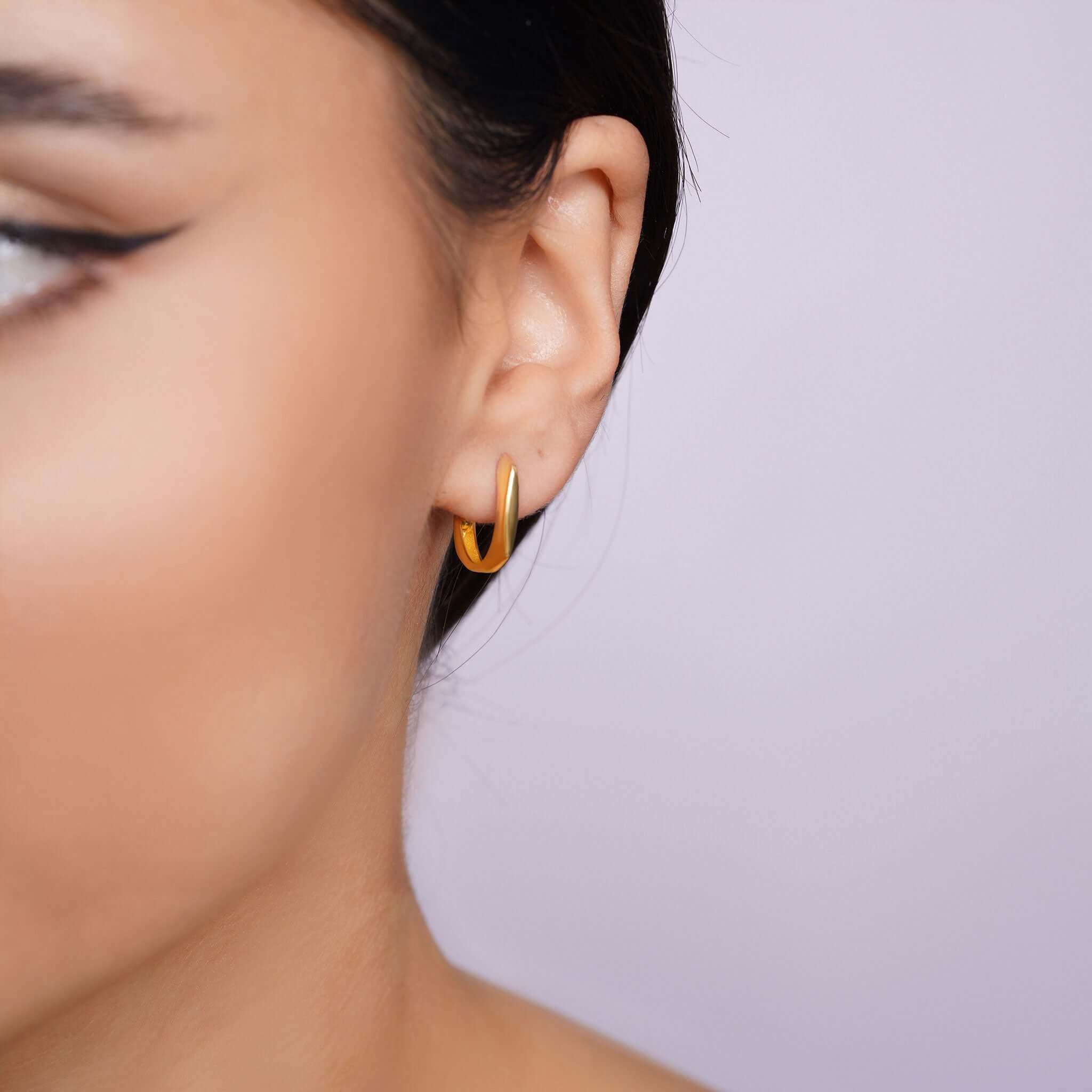 These U Shape Plain Gold Huggie Earrings feature a bold U-shaped silhouette with clean, flat surfaces sculpted across the front, bottom, and back for a modern, architectural look. The sharp edges add a contemporary edge to the classic huggie style, making these earrings a standout minimalist statement.
