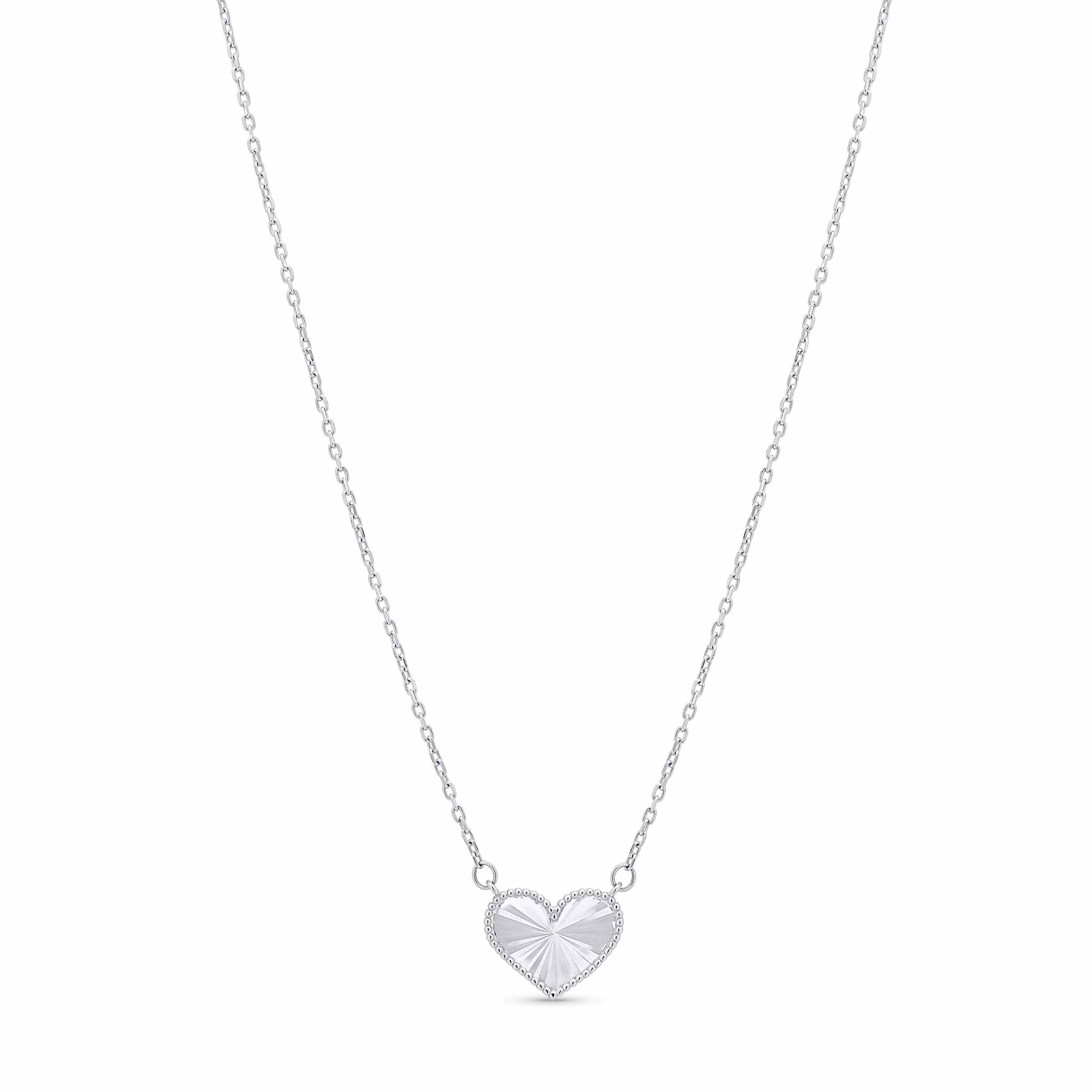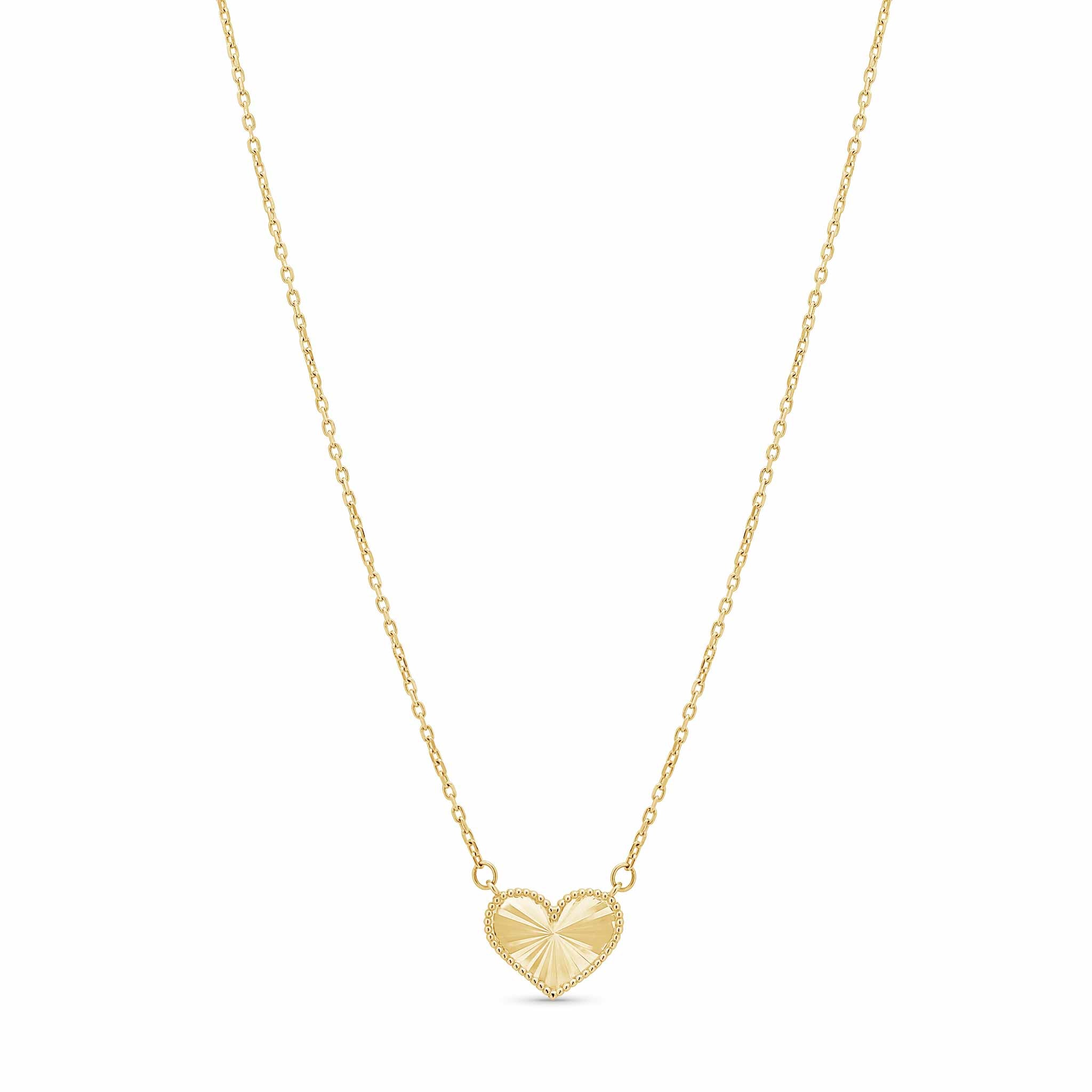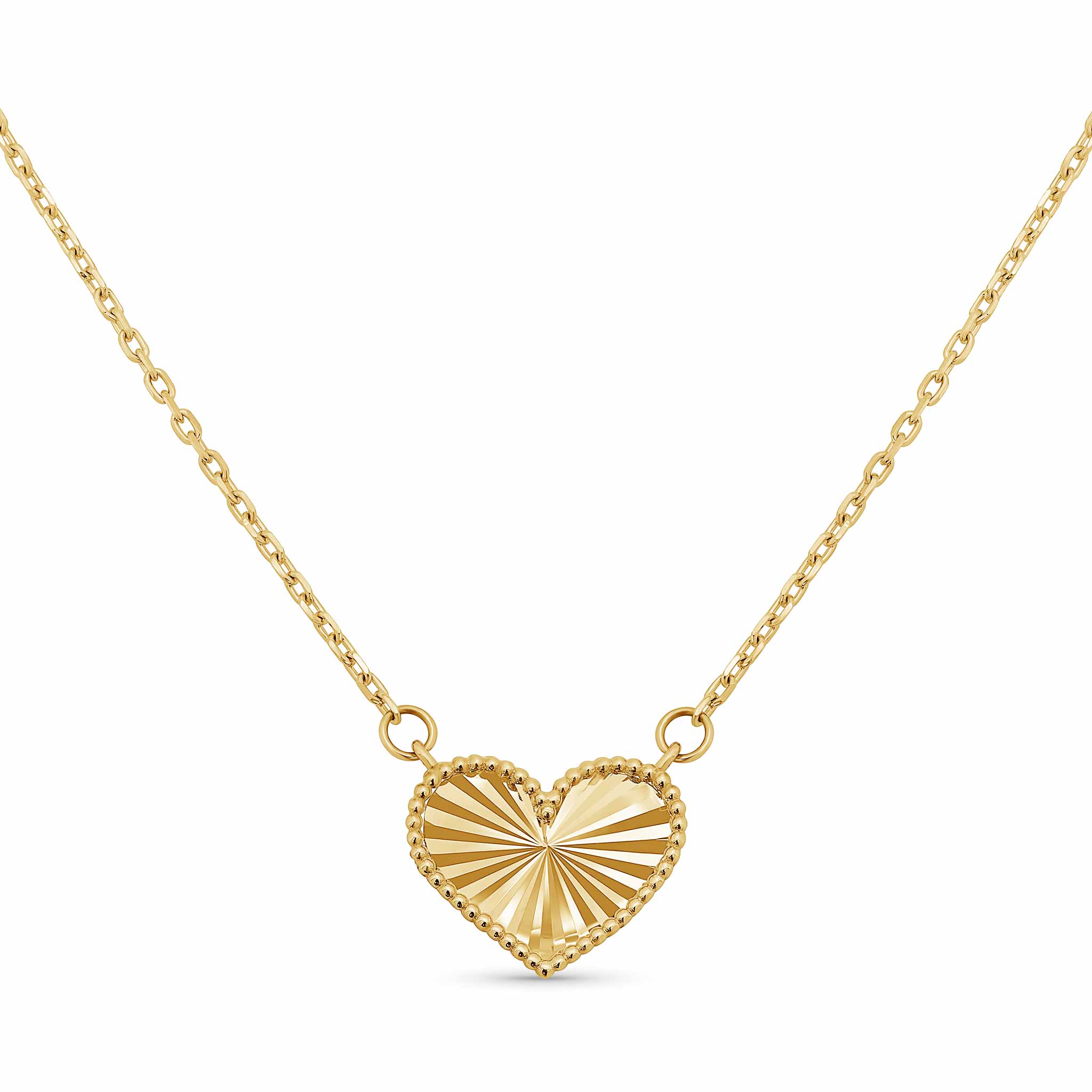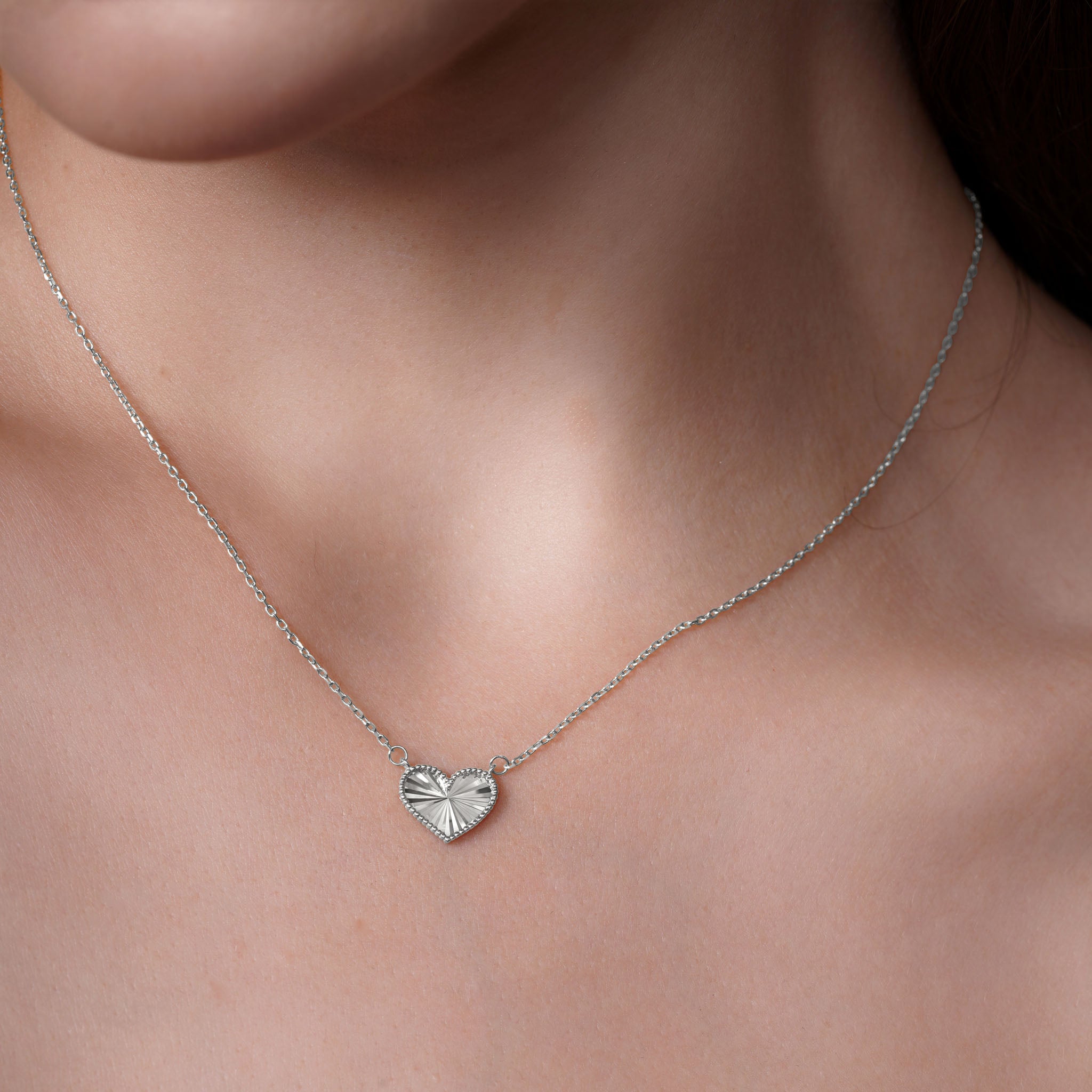 A heart full of texture and light, our Engraved Heart Necklace is a heart-shaped pendant featuring a beaded border, encasing a textured center that mimics the graceful pleats of a folding fan, creating a radiant, sunburst-like effect.