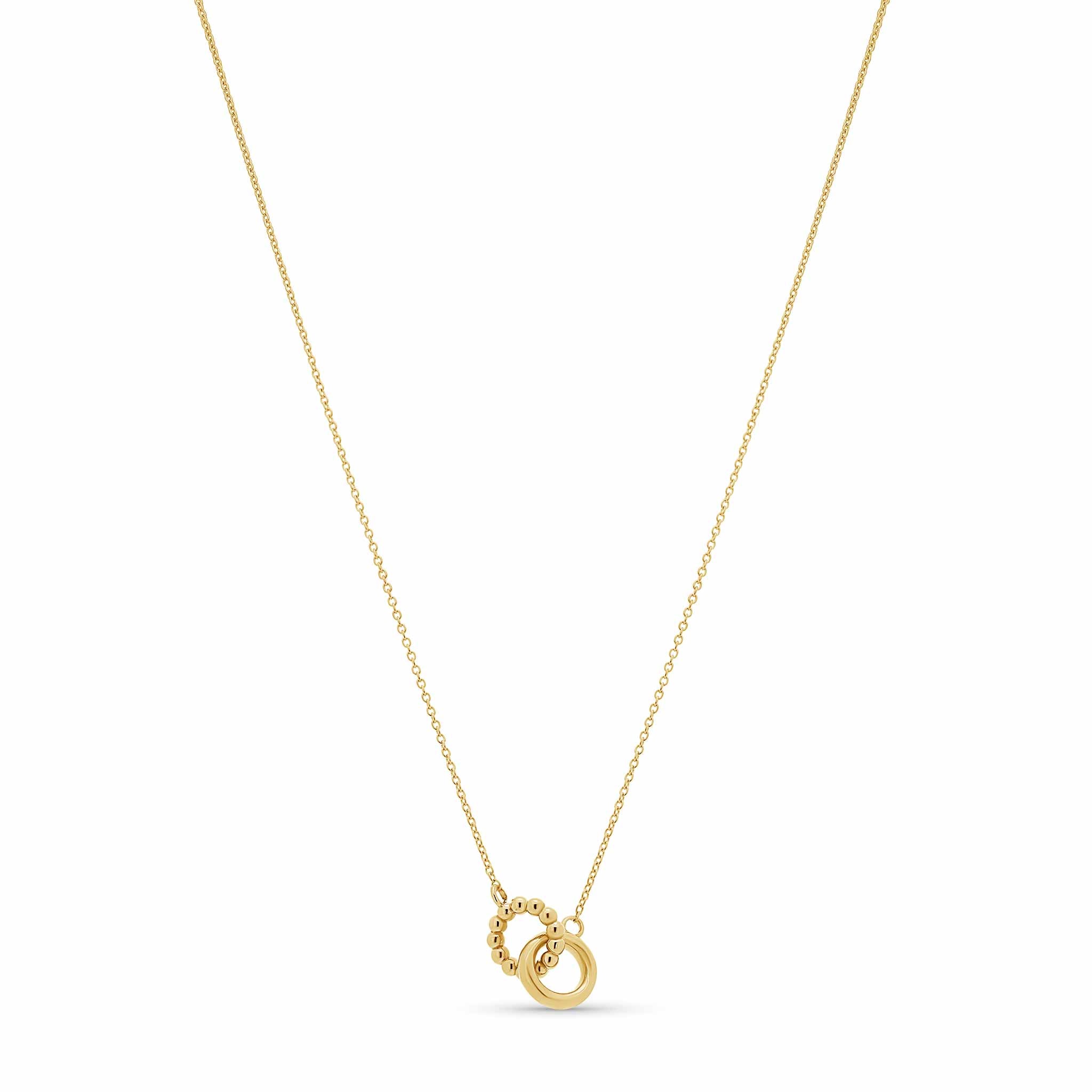 This elegant gold double circle necklace features two intertwined circles—one sleek and polished, the other adorned with delicate beading. Available in a variety of gold tones, including stunning two-tone options, it offers versatile style that complements any outfit with subtle sophistication. Crafted to symbolize connection and unity, this necklace is a refined choice for everyday wear or special occasions.