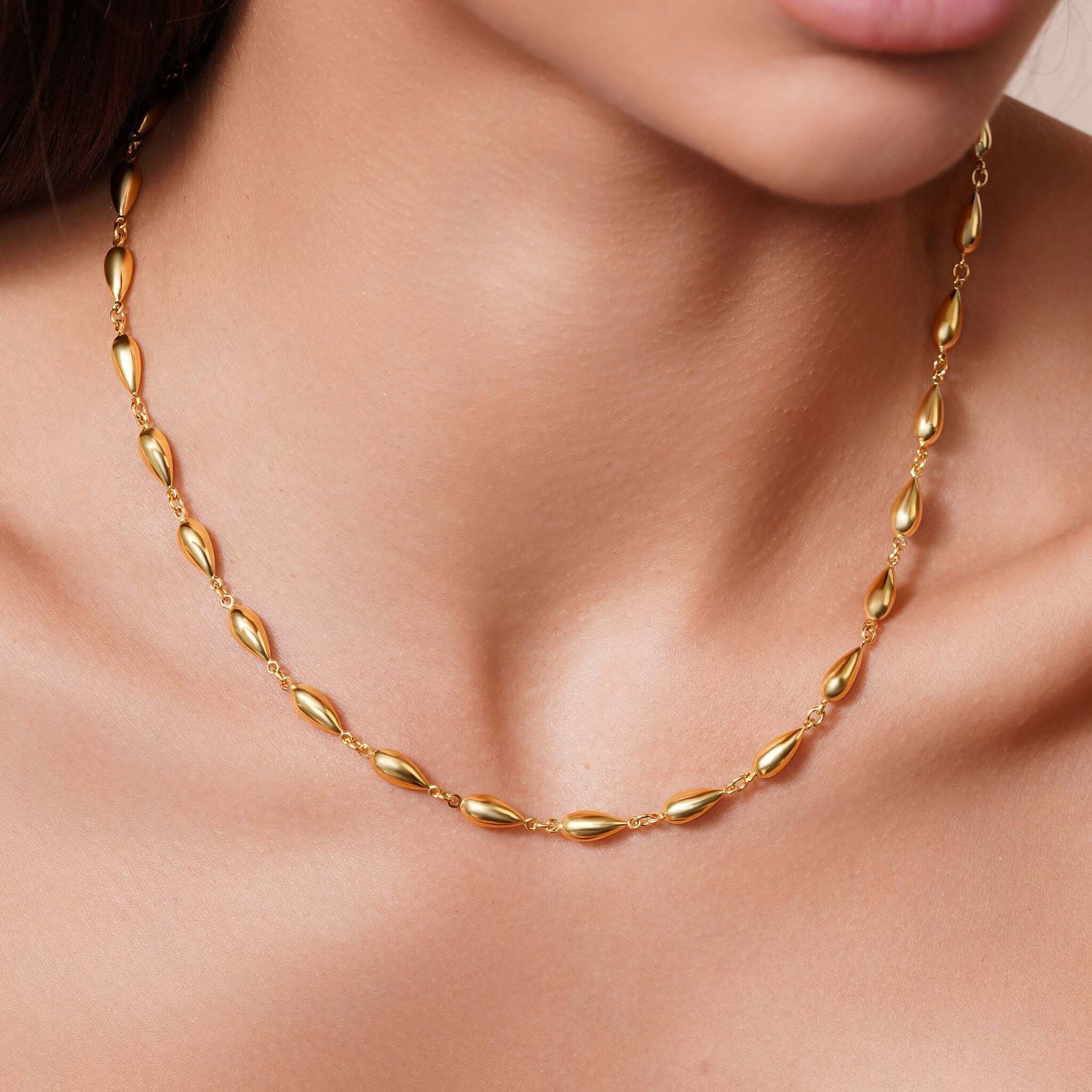 This Gold Teardrops Necklace is crafted to make an impression. Designed with a series of connected teardrop-shaped links, this piece forms a fluid silhouette that drapes beautifully along the neckline. Each teardrop is shaped with smooth, rounded edges and polished to a high shine, creating a rhythmic flow of light and form across the collarbone.