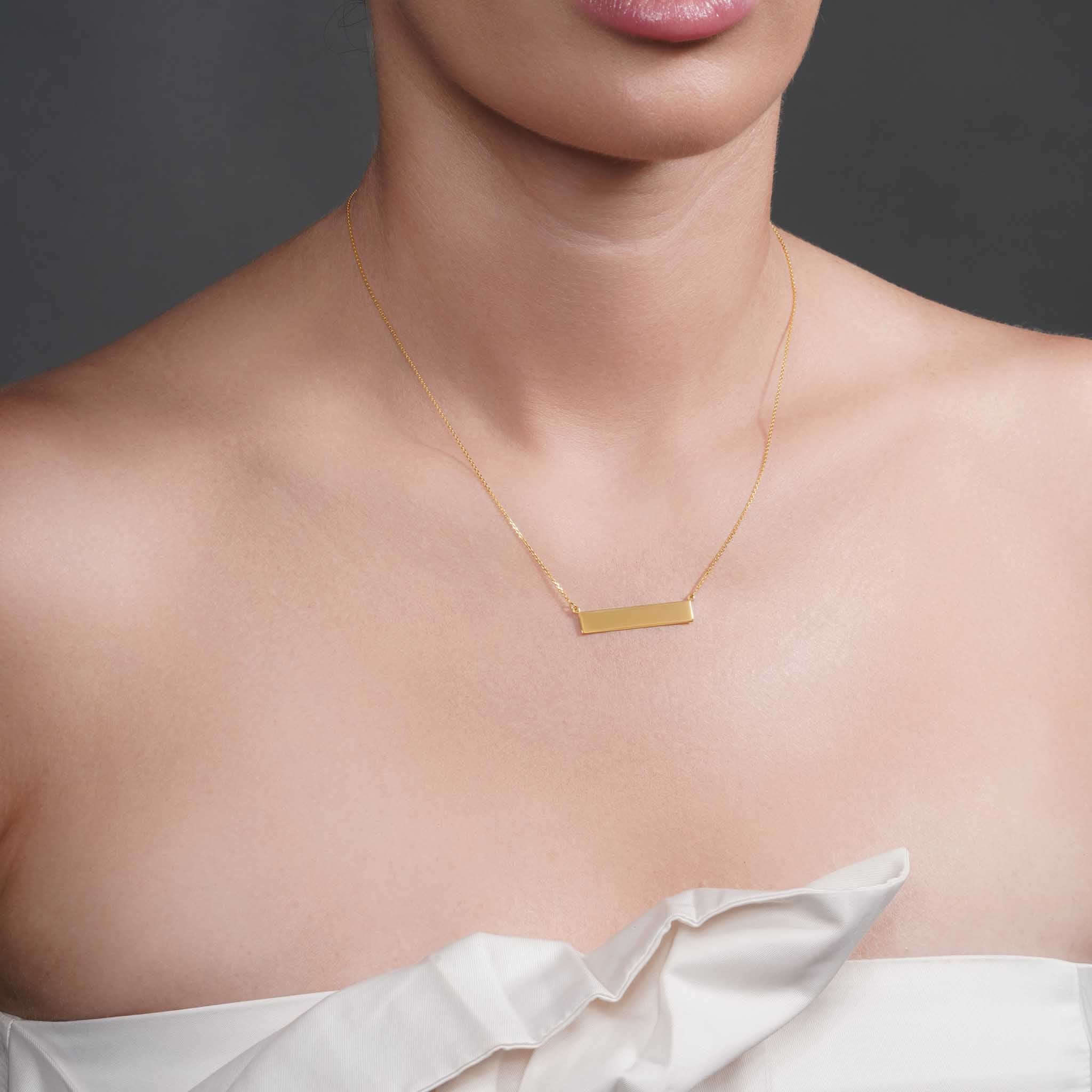 This Horizontal Gold Bar Necklace blends minimalist elegance with personal expression. Crafted in either 14k yellow gold or 14k white gold, it has a sleek bar pendant that sits horizontally across your collarbone, making for a clean, modern silhouette.