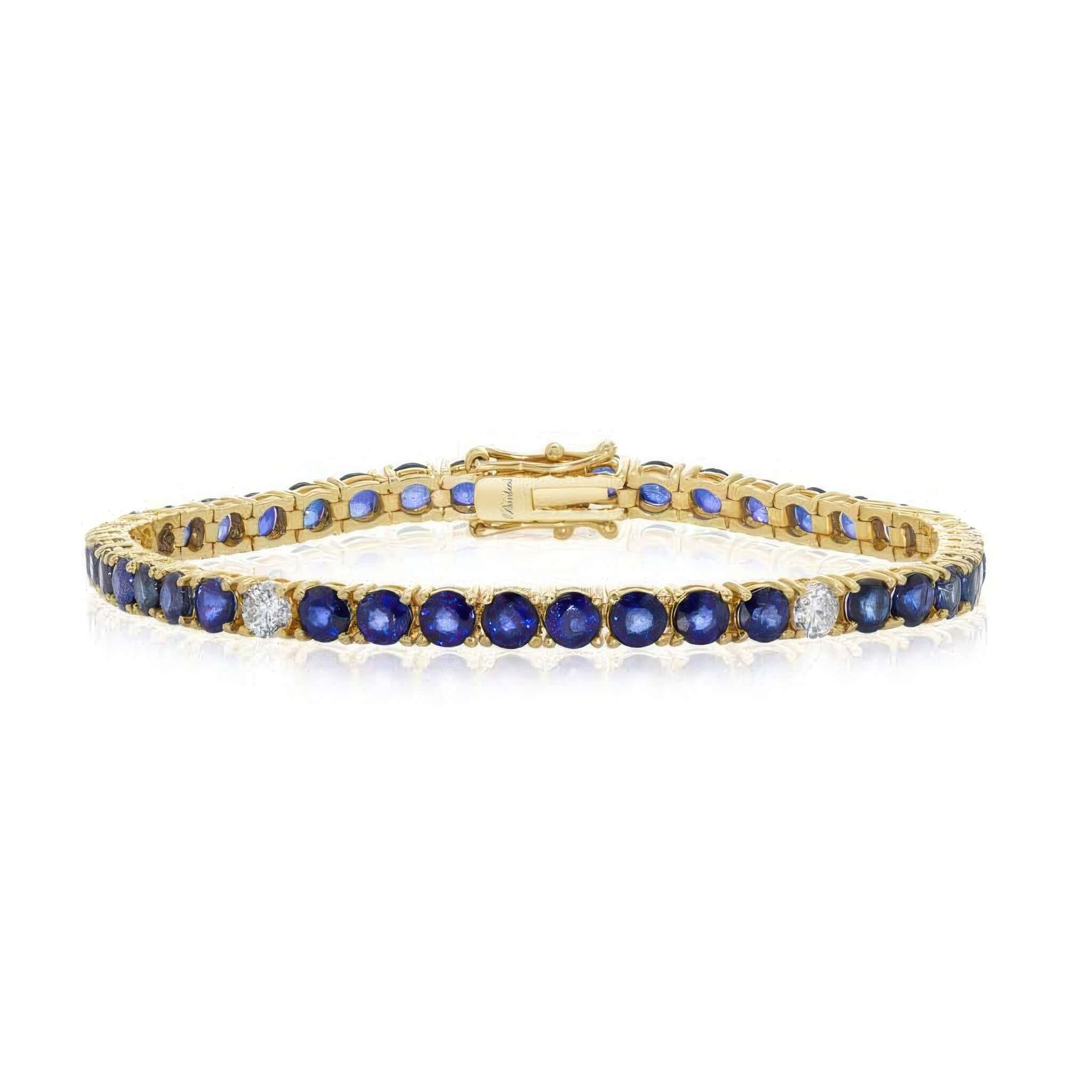 Elevate your collection with a tennis bracelet that blends bold color with refined brilliance. This Lab Grown Sapphire and Diamond Bracelet showcases a stunning rhythm of deep blue sapphires and shimmering diamonds, arranged in a captivating alternating pattern that draws the eye. Featuring 10 carats of round lab-grown sapphires, the bracelet is punctuated by sparkling diamonds — one placed between every eight sapphires — for an elegant touch of contrast and light.