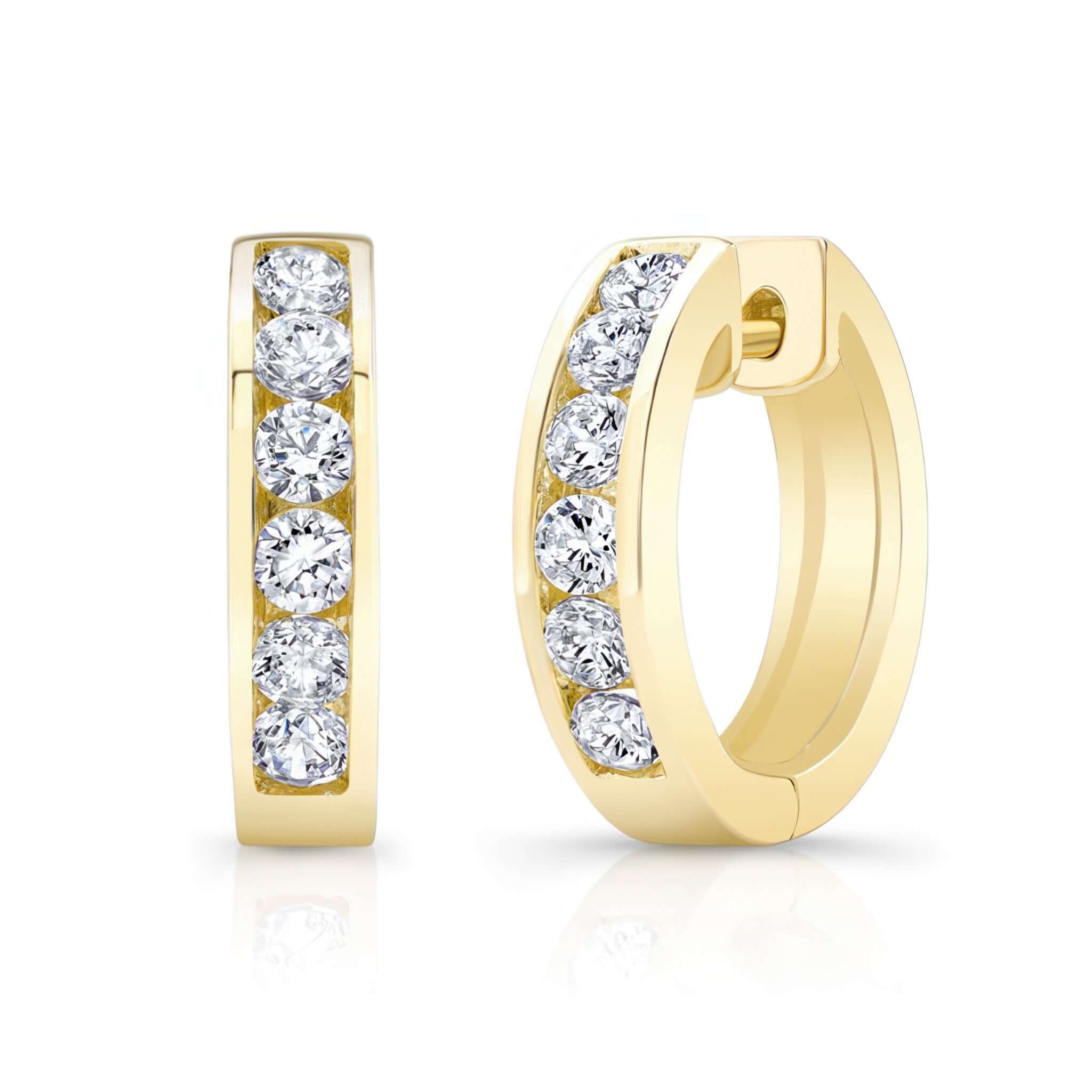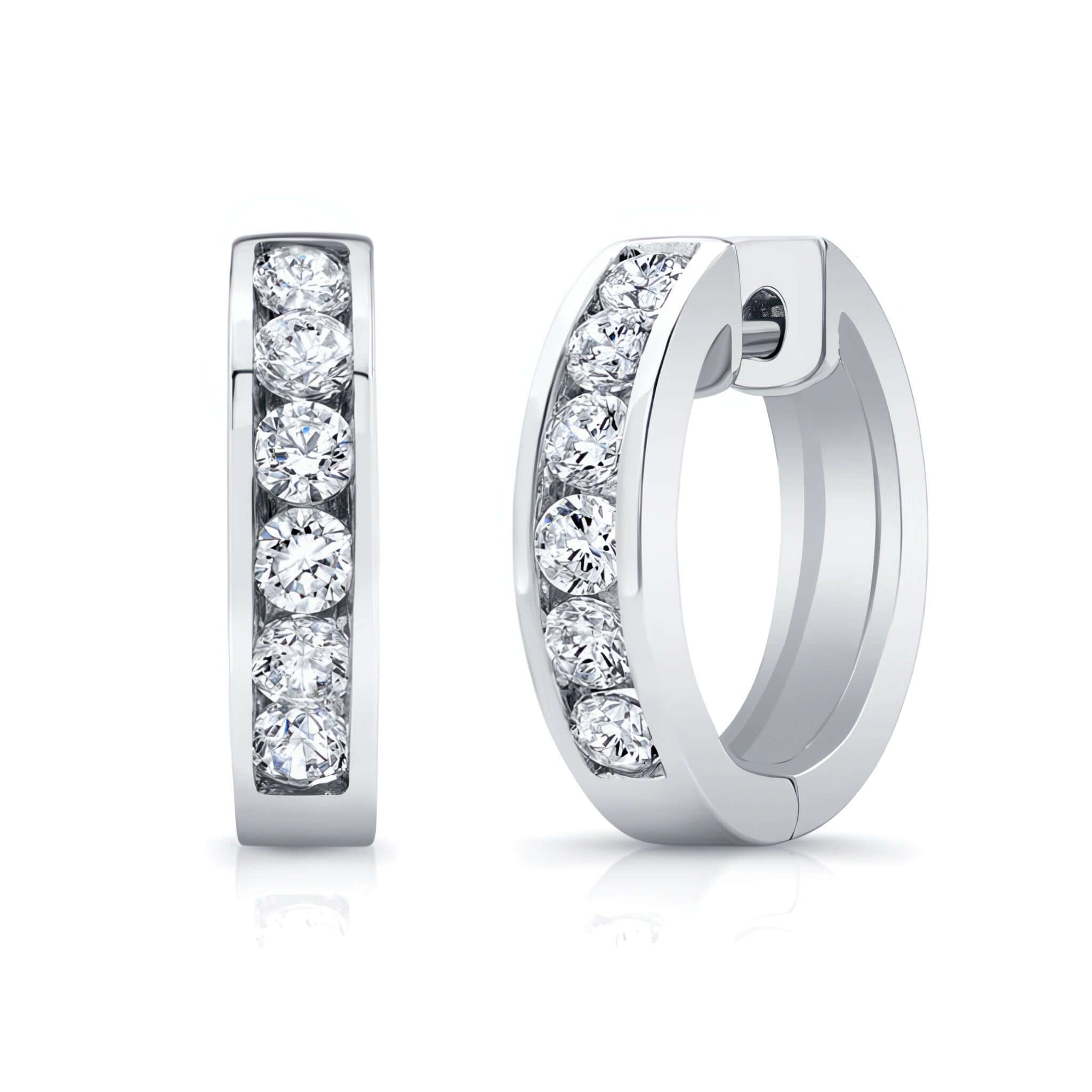 These 1 carat channel lab diamond hoop earrings feature channel set lab diamonds for a brilliant sparkle.
