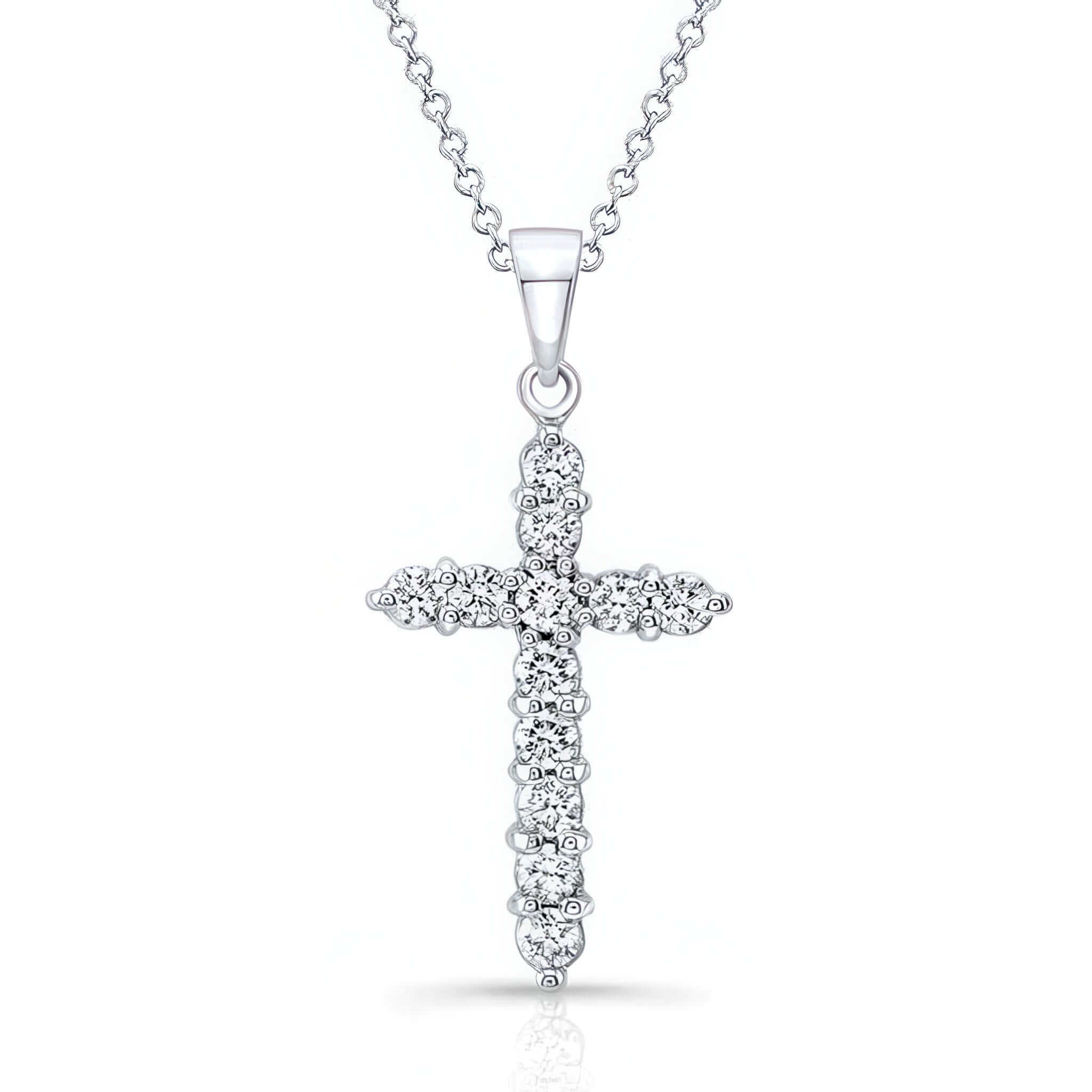 An elegant 2 carat lab diamond cross necklace featuring shared prong set diamonds set on a gold cross.