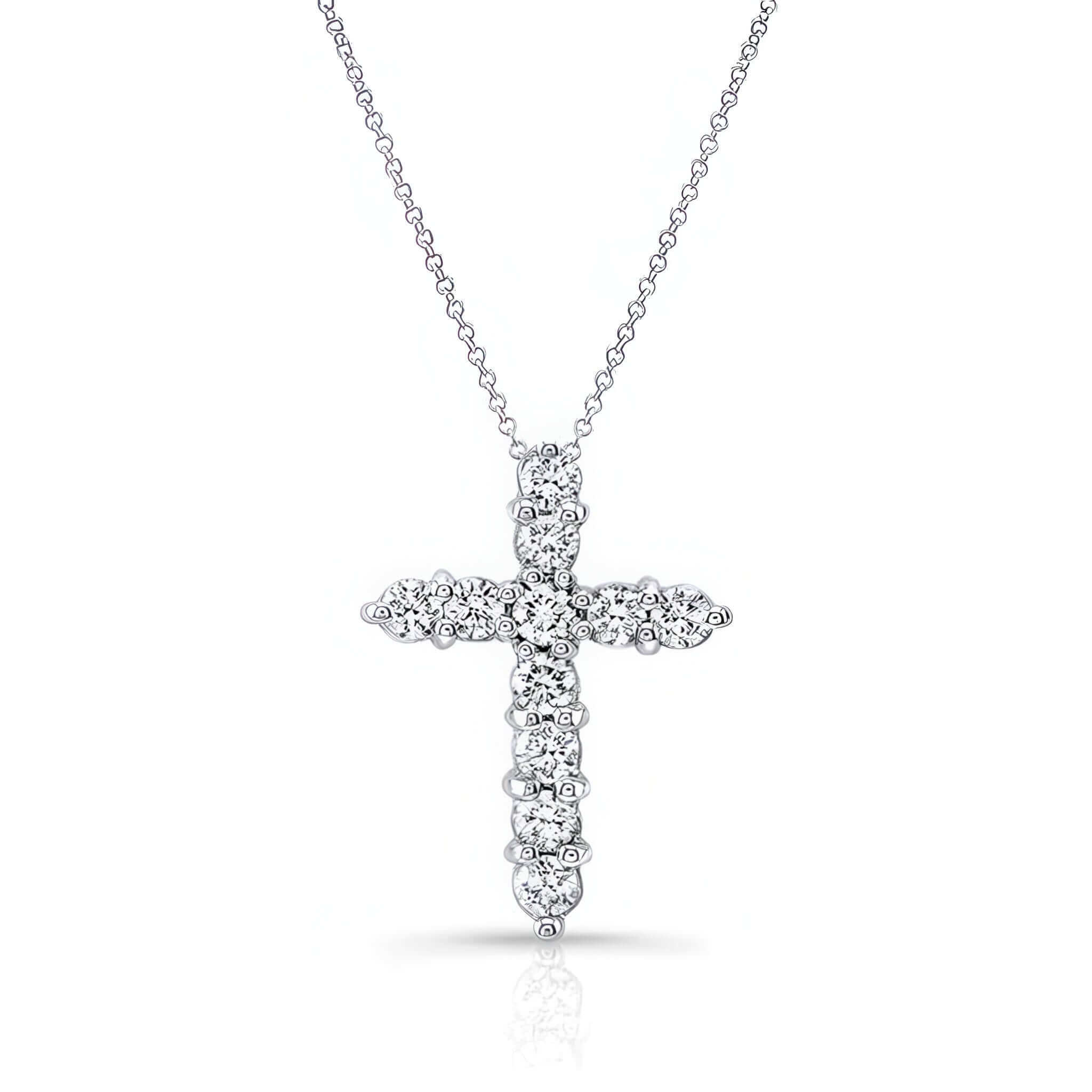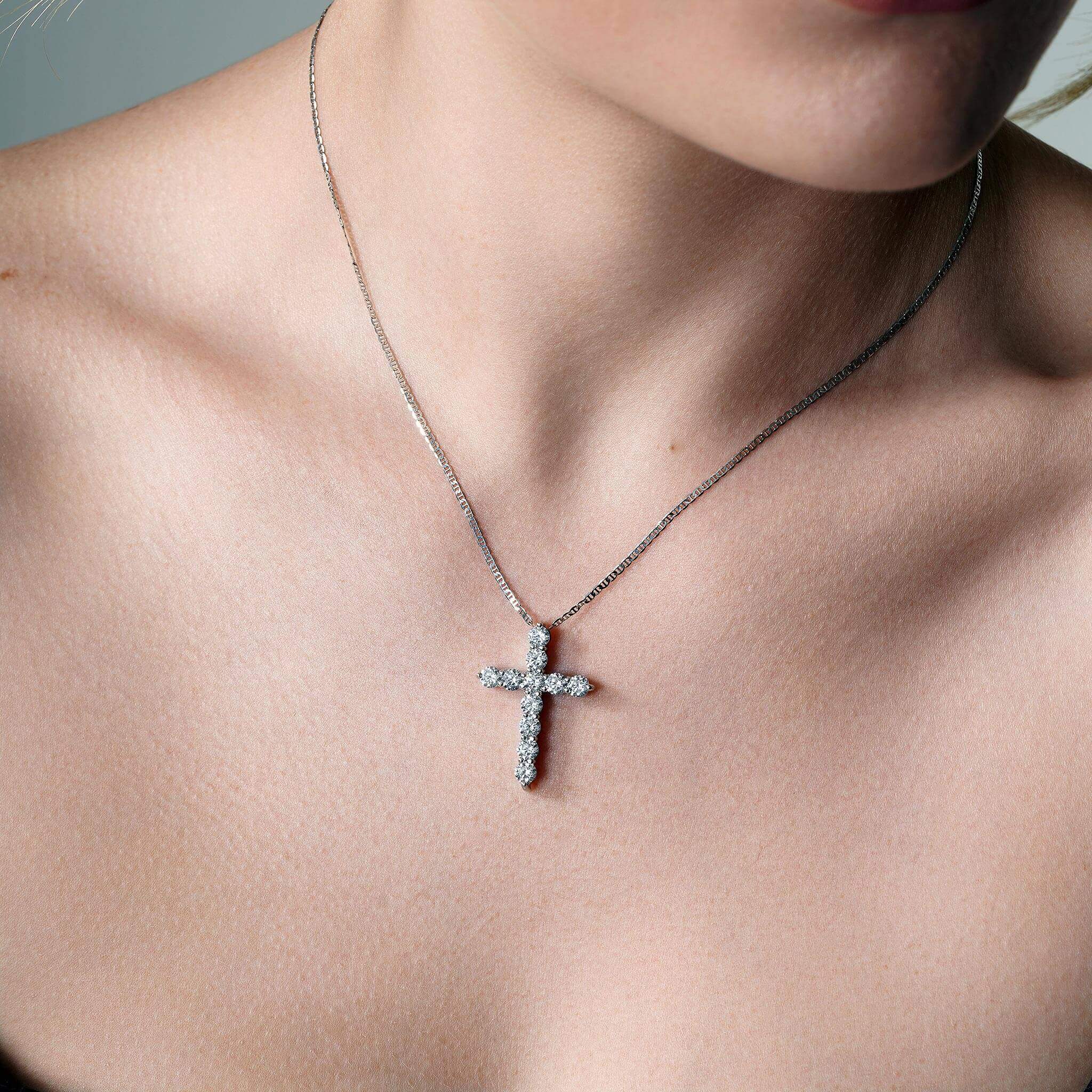 A lab diamond cross necklace featuring shared prong set diamonds.
