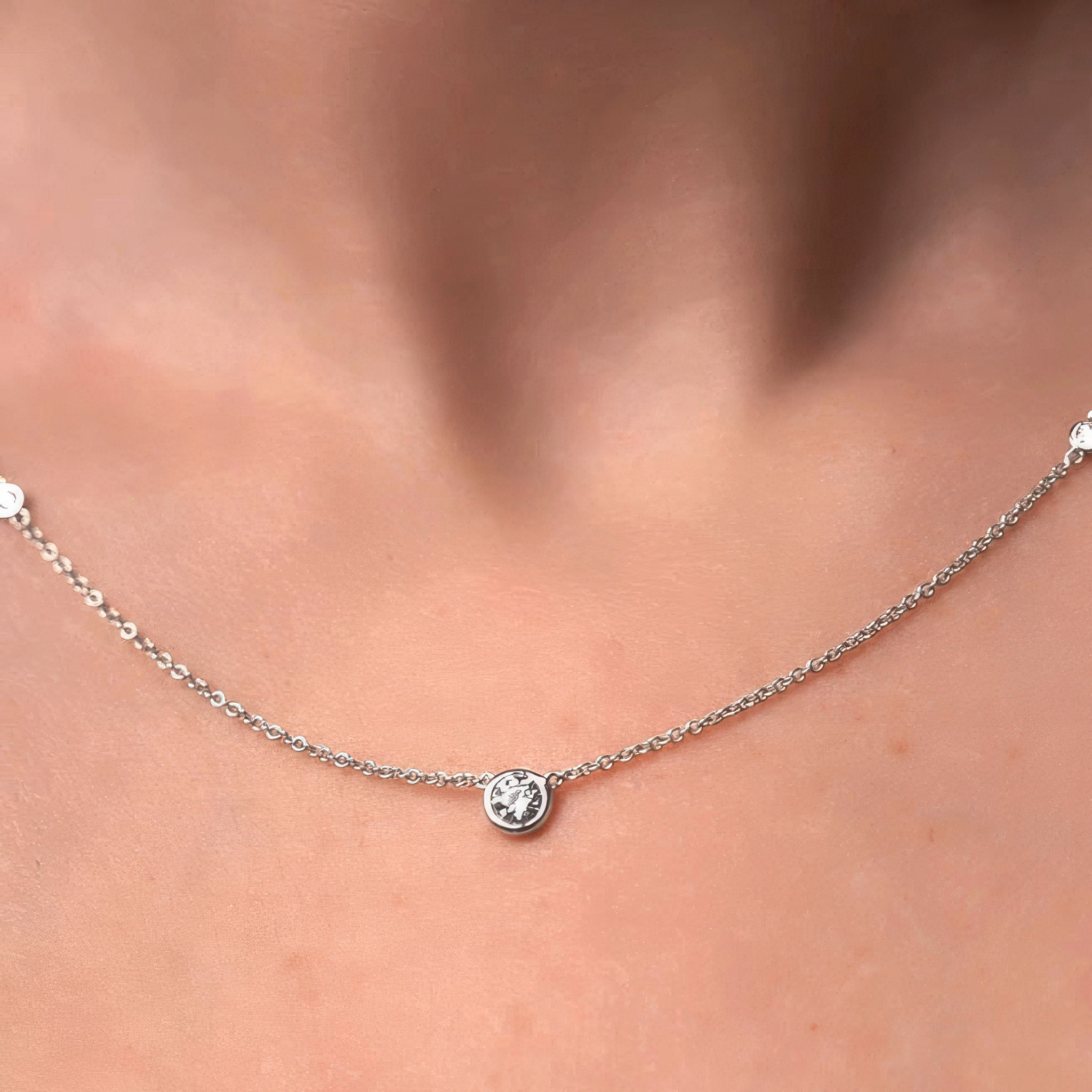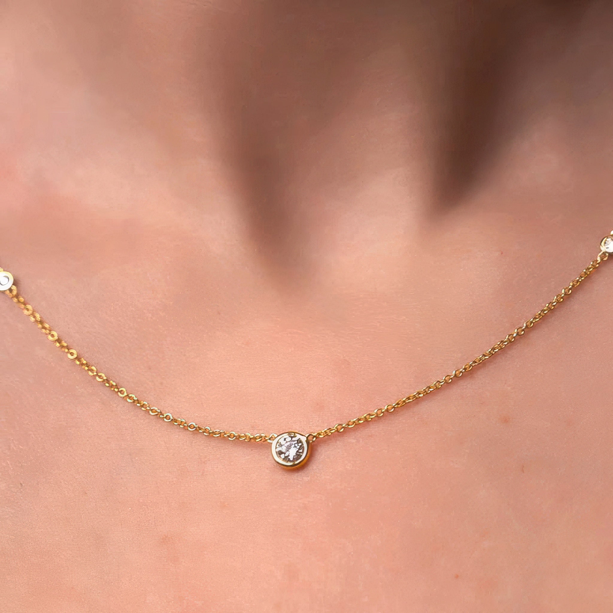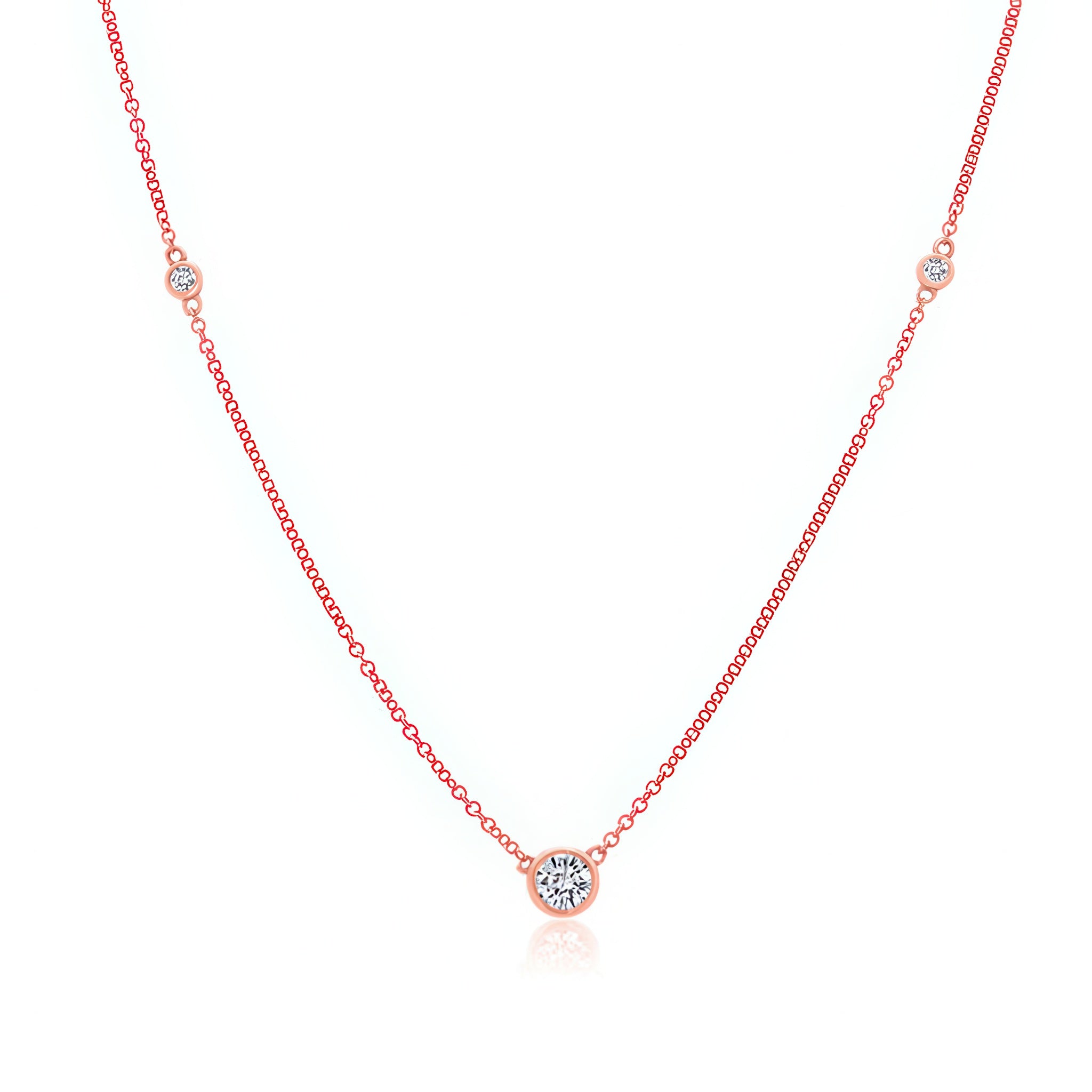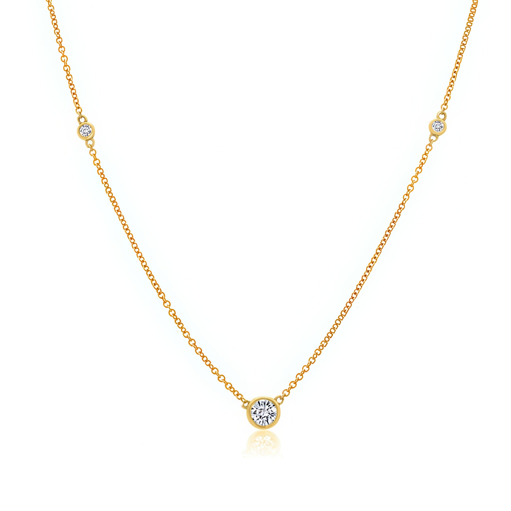 A petite bezel set lab diamond necklace featuring 3 lab diamonds in a bezel setting and a thin dainty necklace.