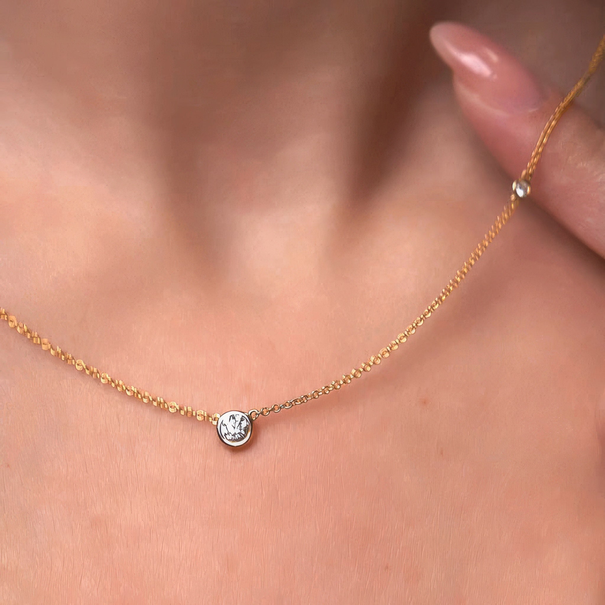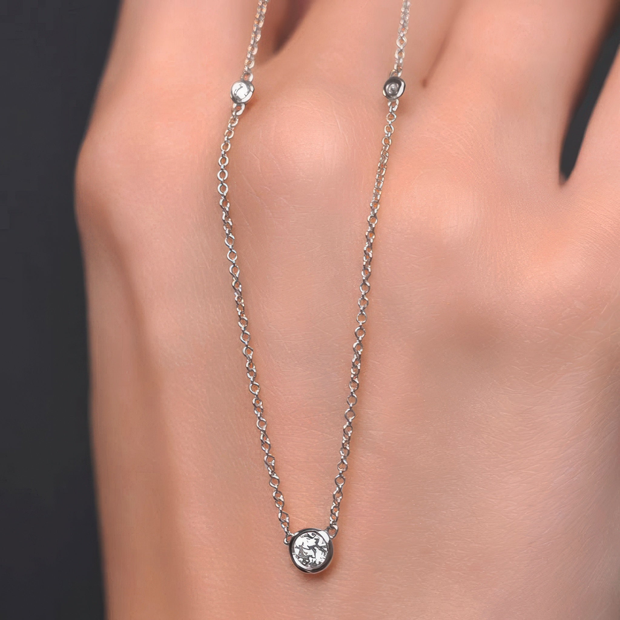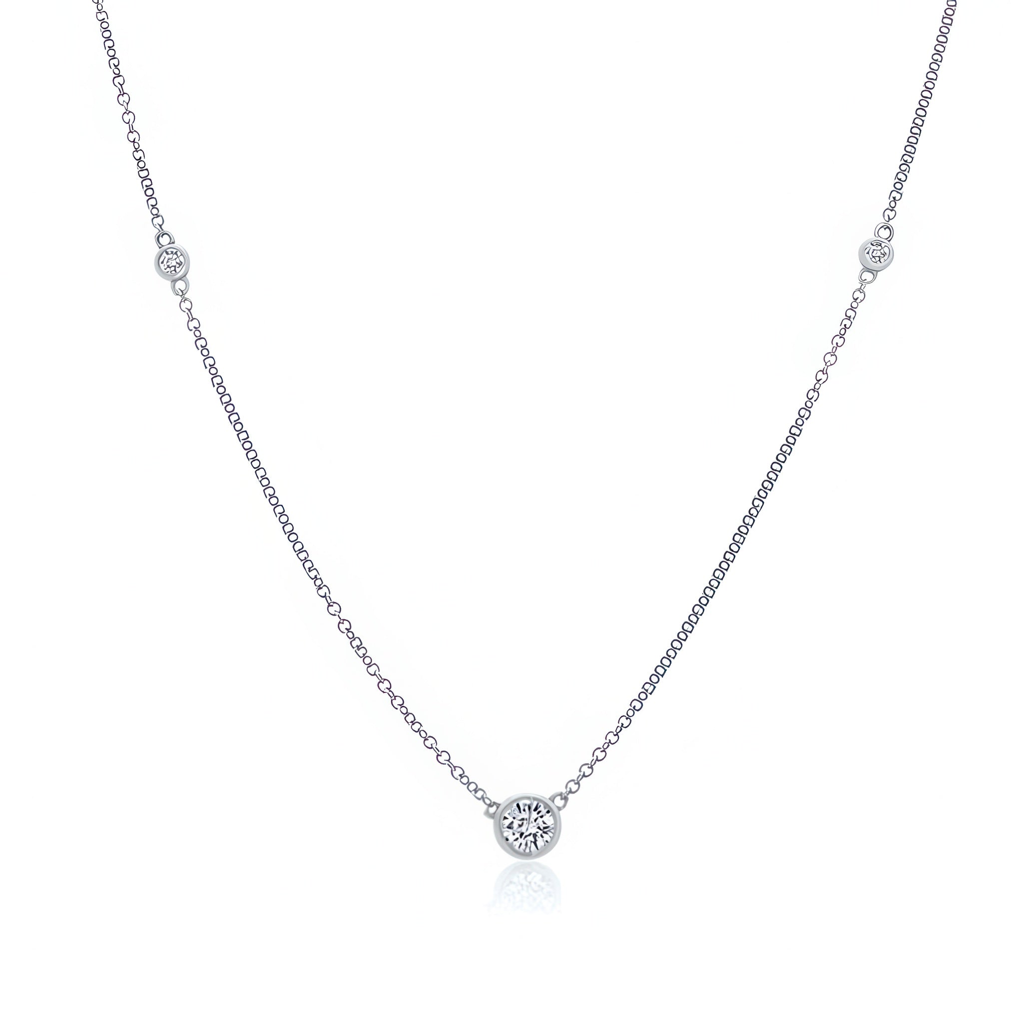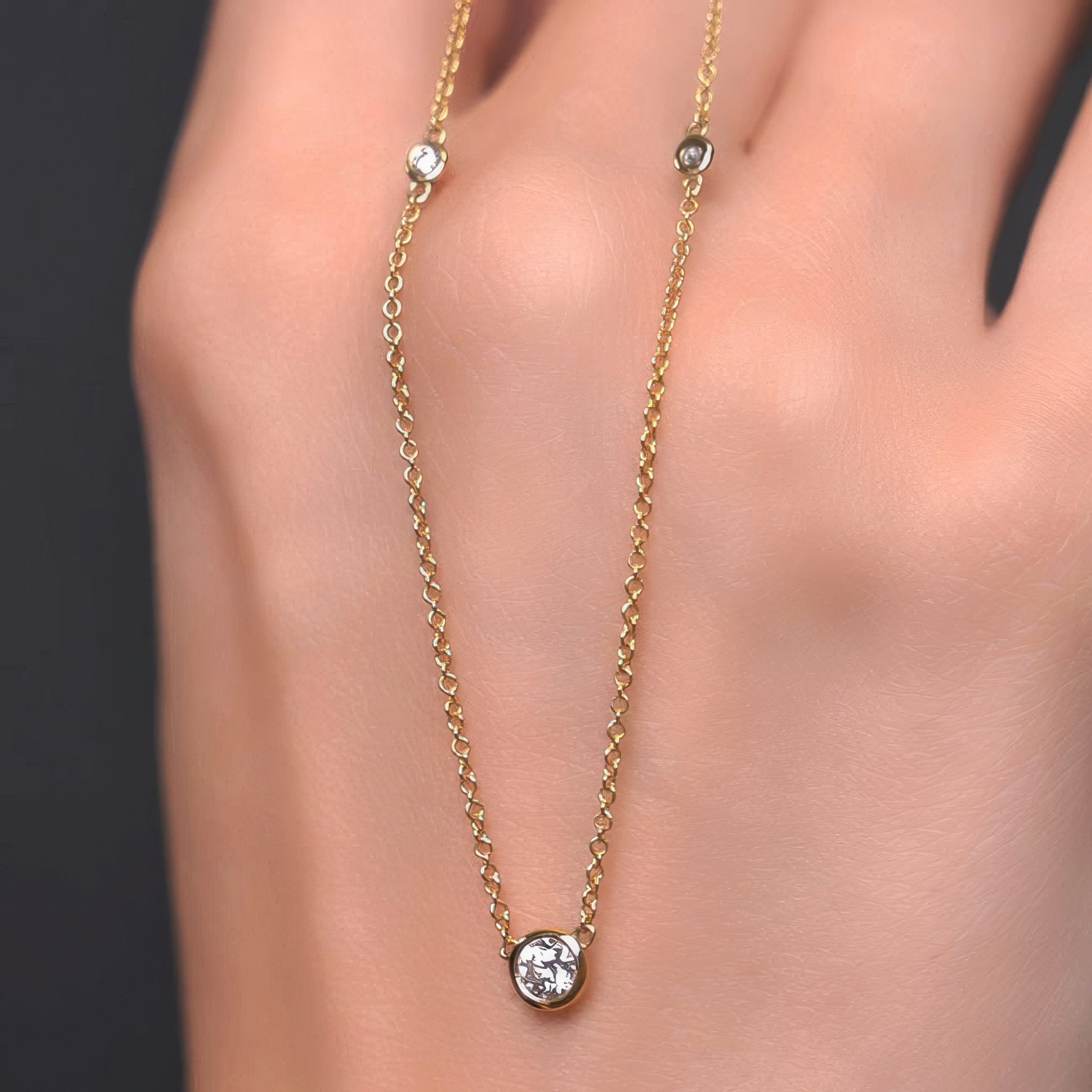 A petite bezel set lab diamond necklace featuring 3 lab diamonds in a bezel setting and a thin dainty necklace.