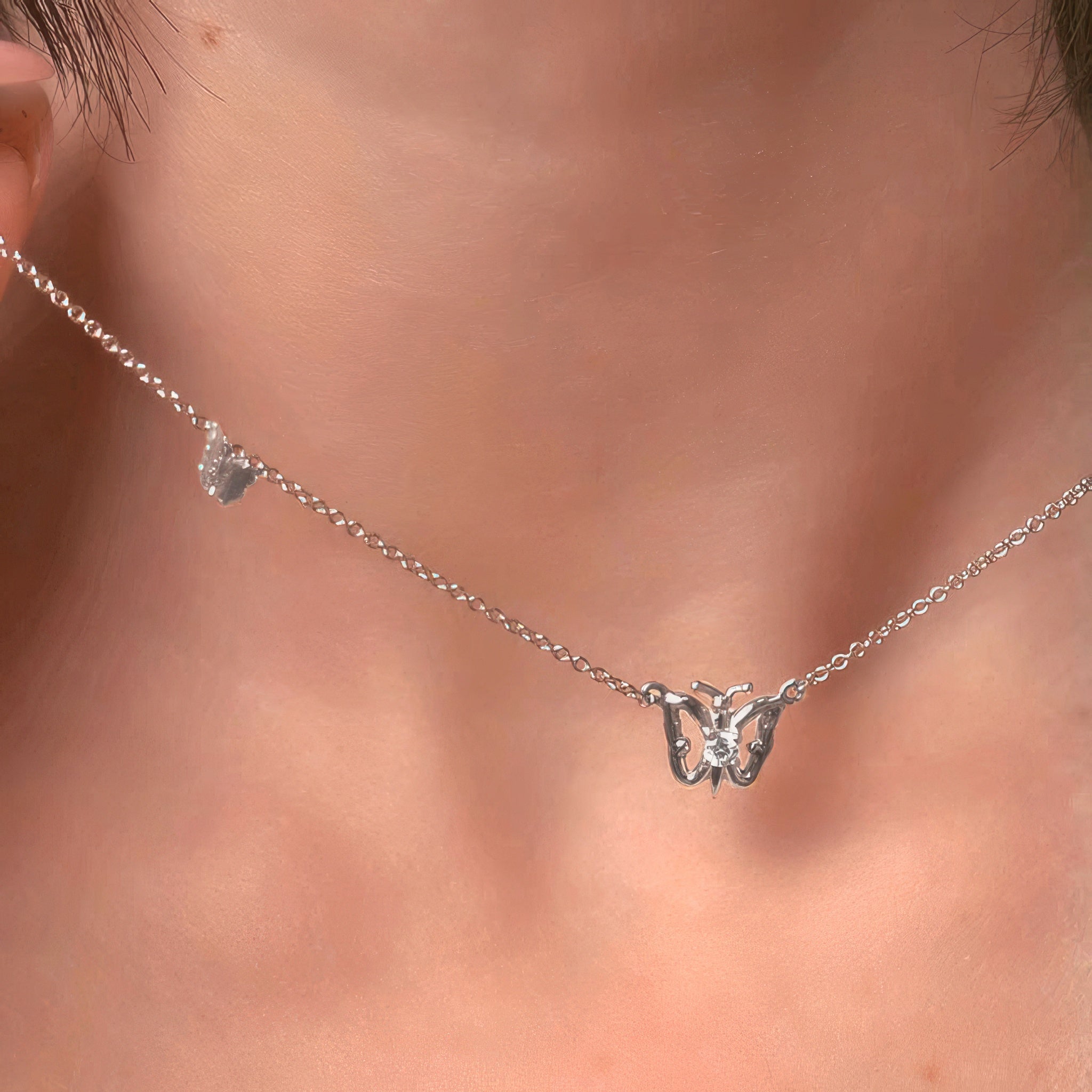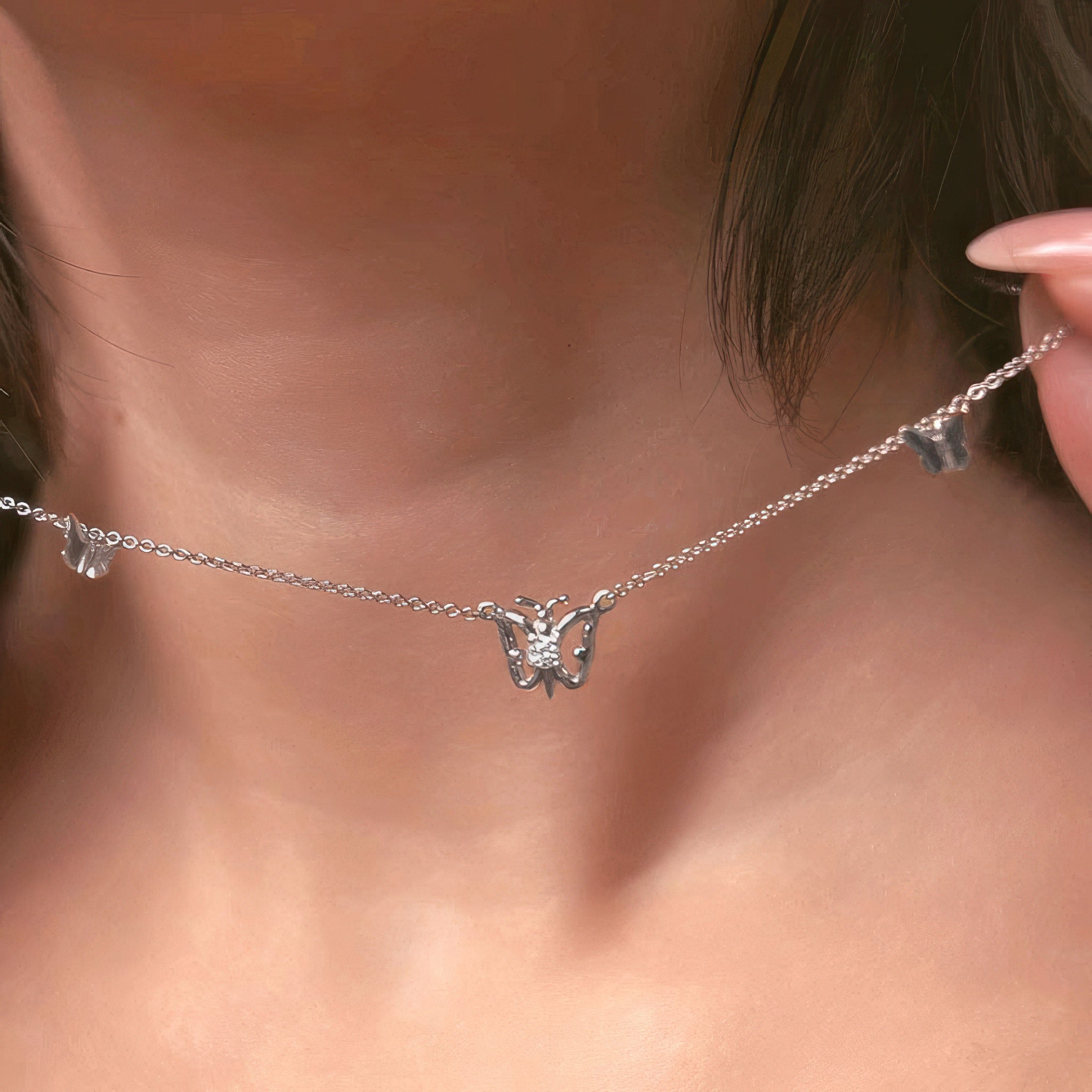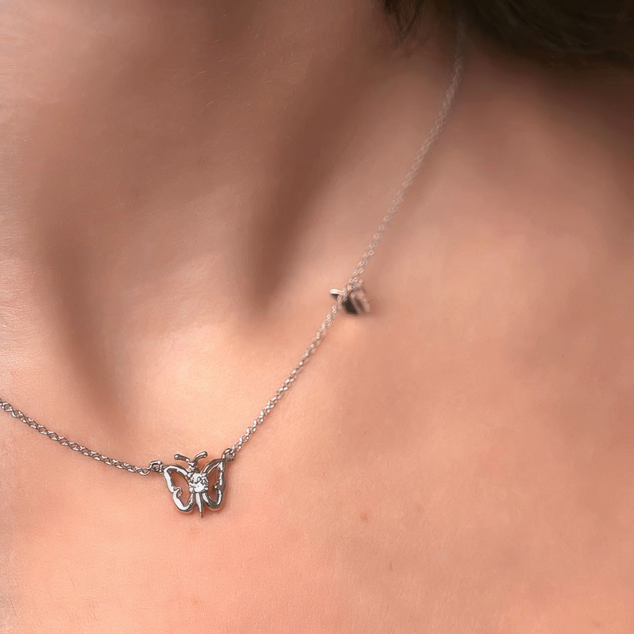 This minimal lab diamond butterfly necklace features three elegant butterflies along with a small lab diamond adorning the middle butterfly for a beautiful finish.