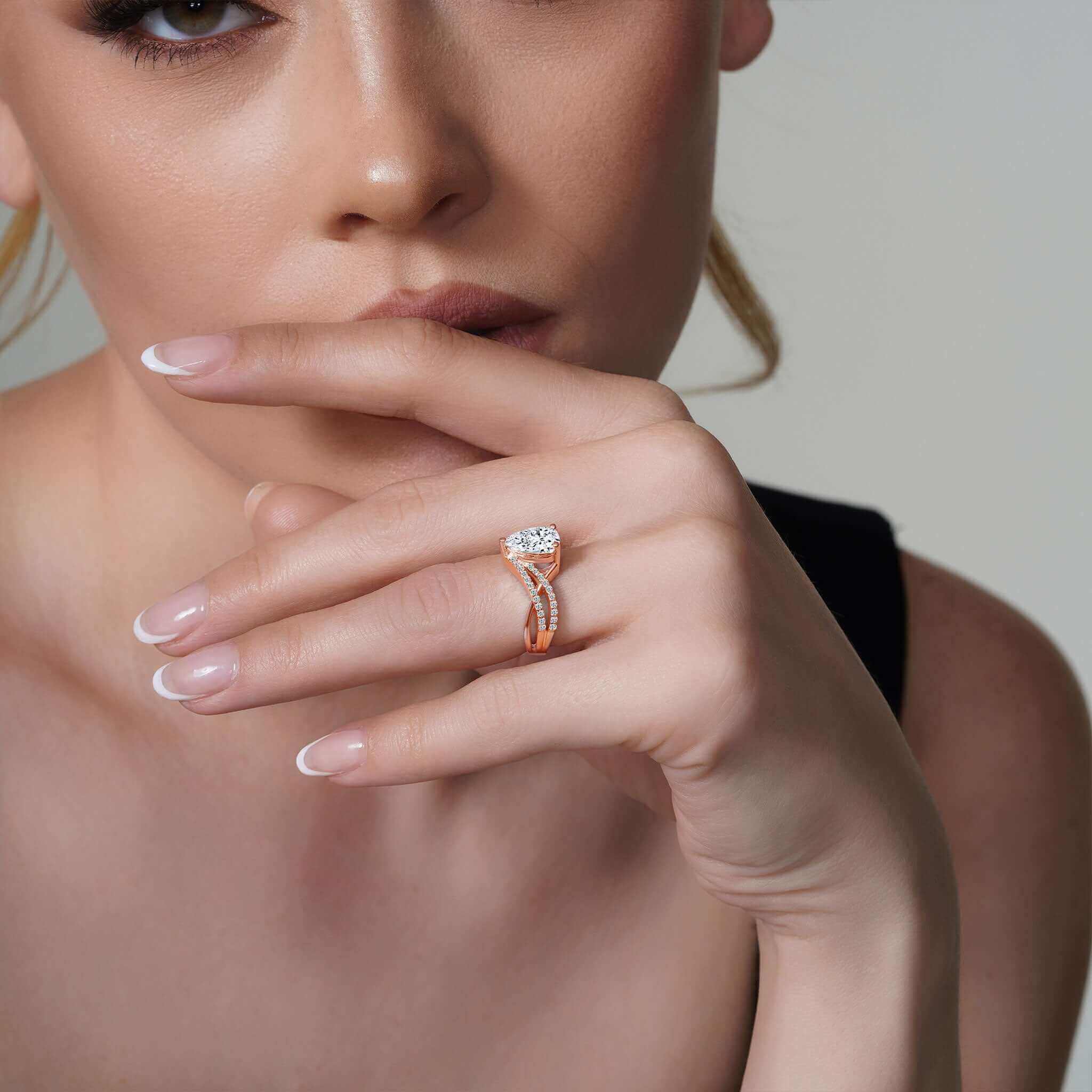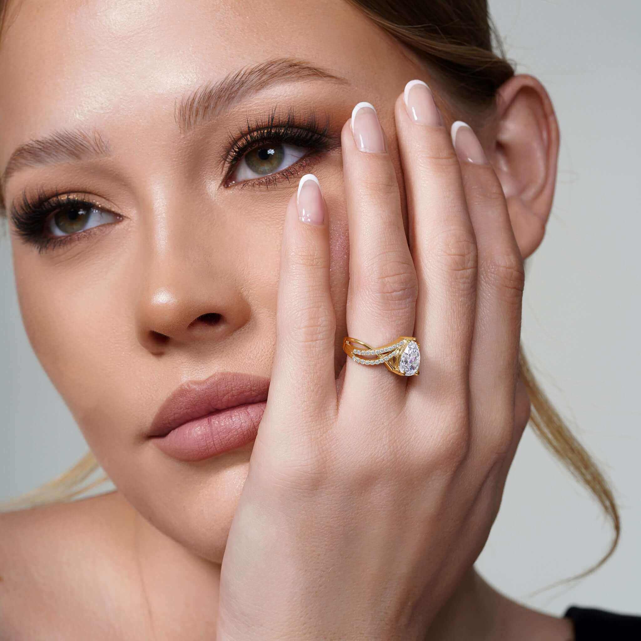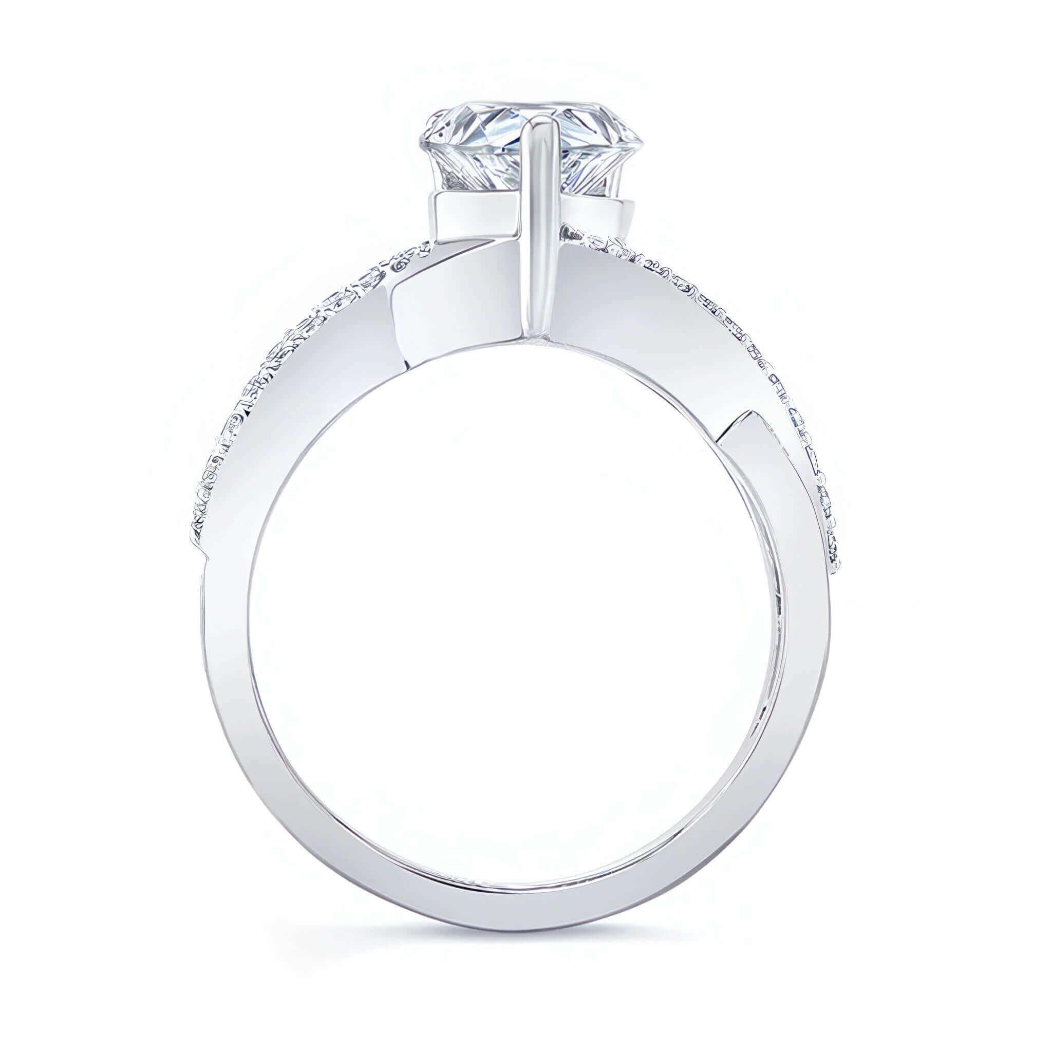 A lab grown diamond teardrop ring featuring a pear shaped center that sits beautifully between interwoven rows of diamonds which descend gracefully down the curves. This uniquely designed ring will surely catch the eyes of many admirers.