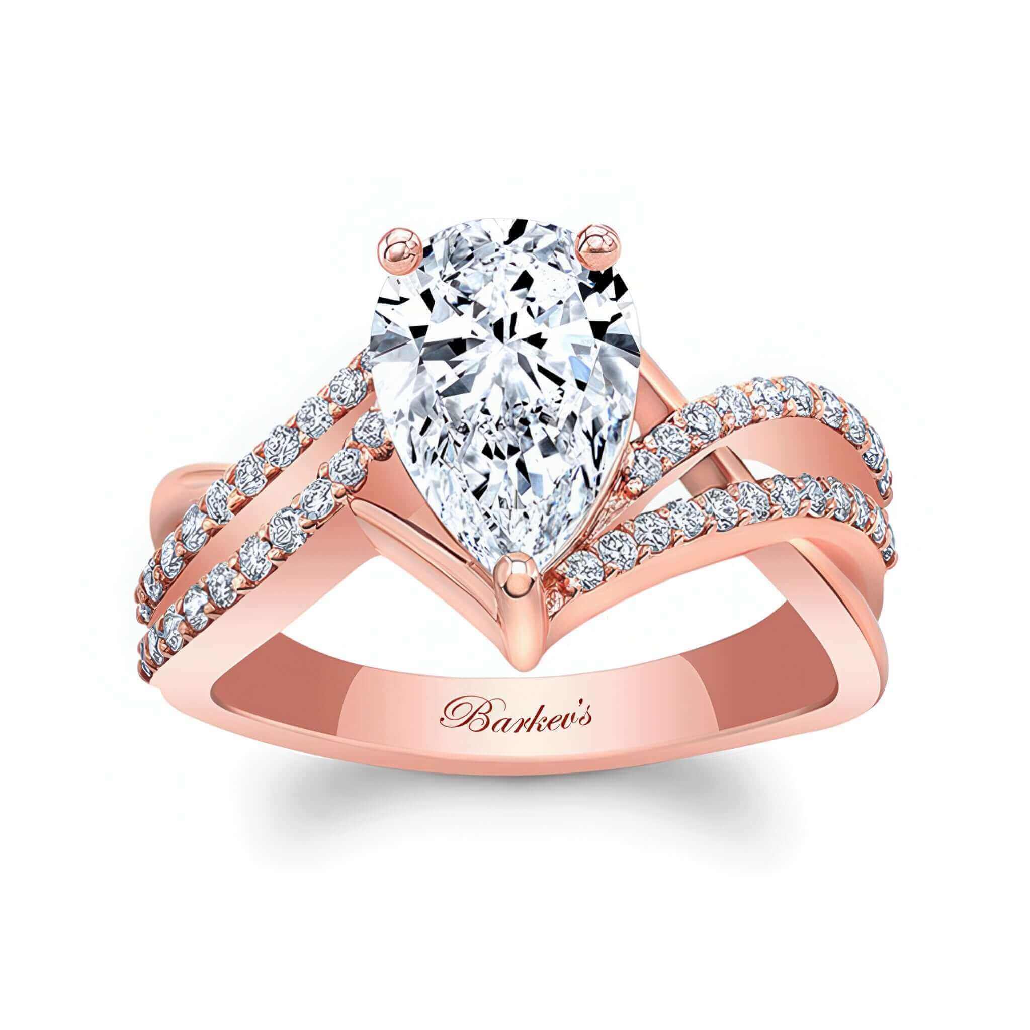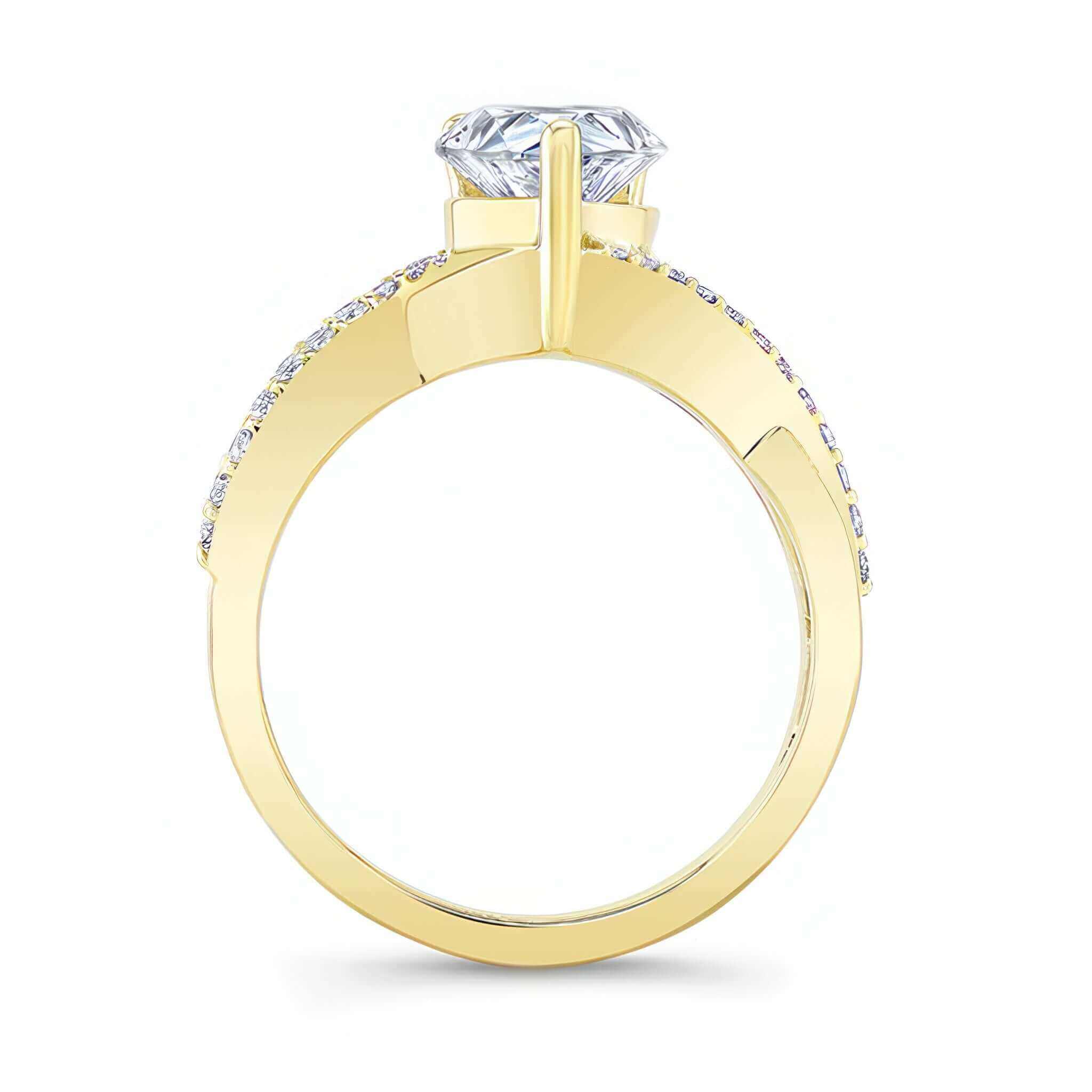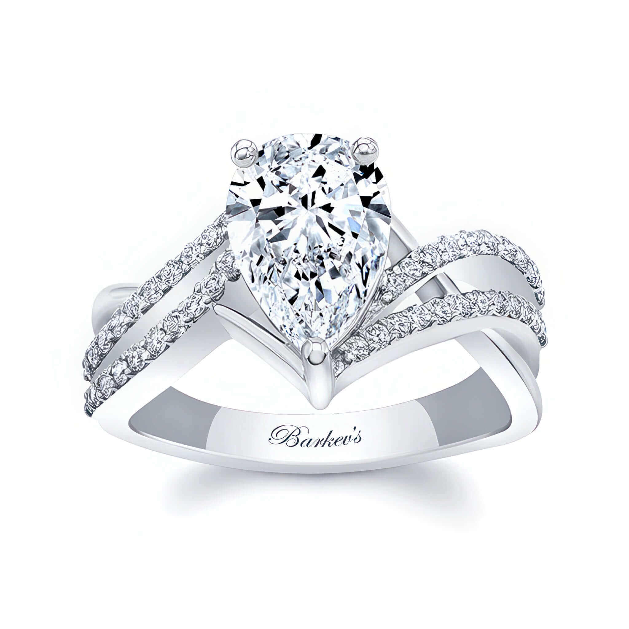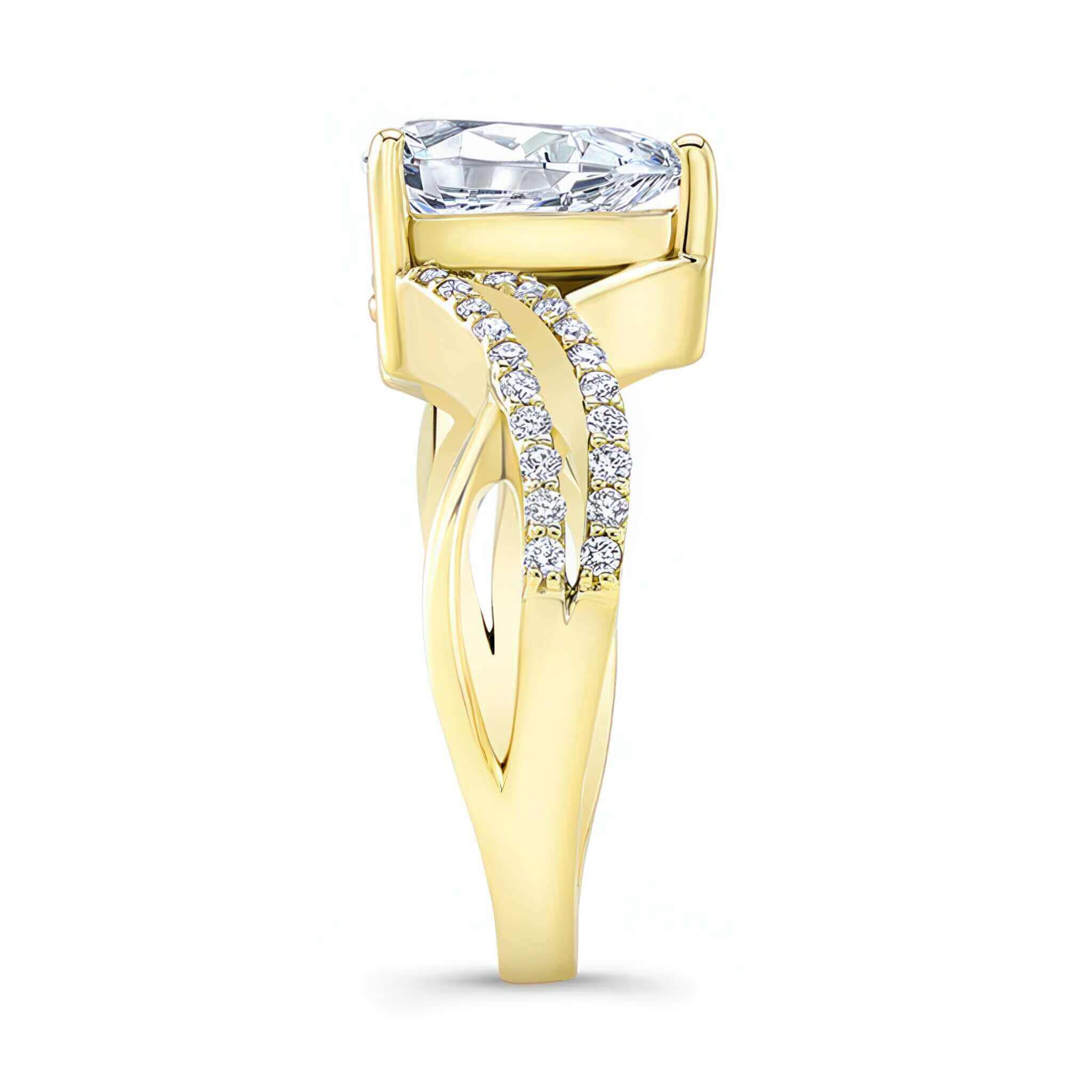 A lab grown diamond teardrop ring featuring a pear shaped center that sits beautifully between interwoven rows of diamonds which descend gracefully down the curves. This uniquely designed ring will surely catch the eyes of many admirers.